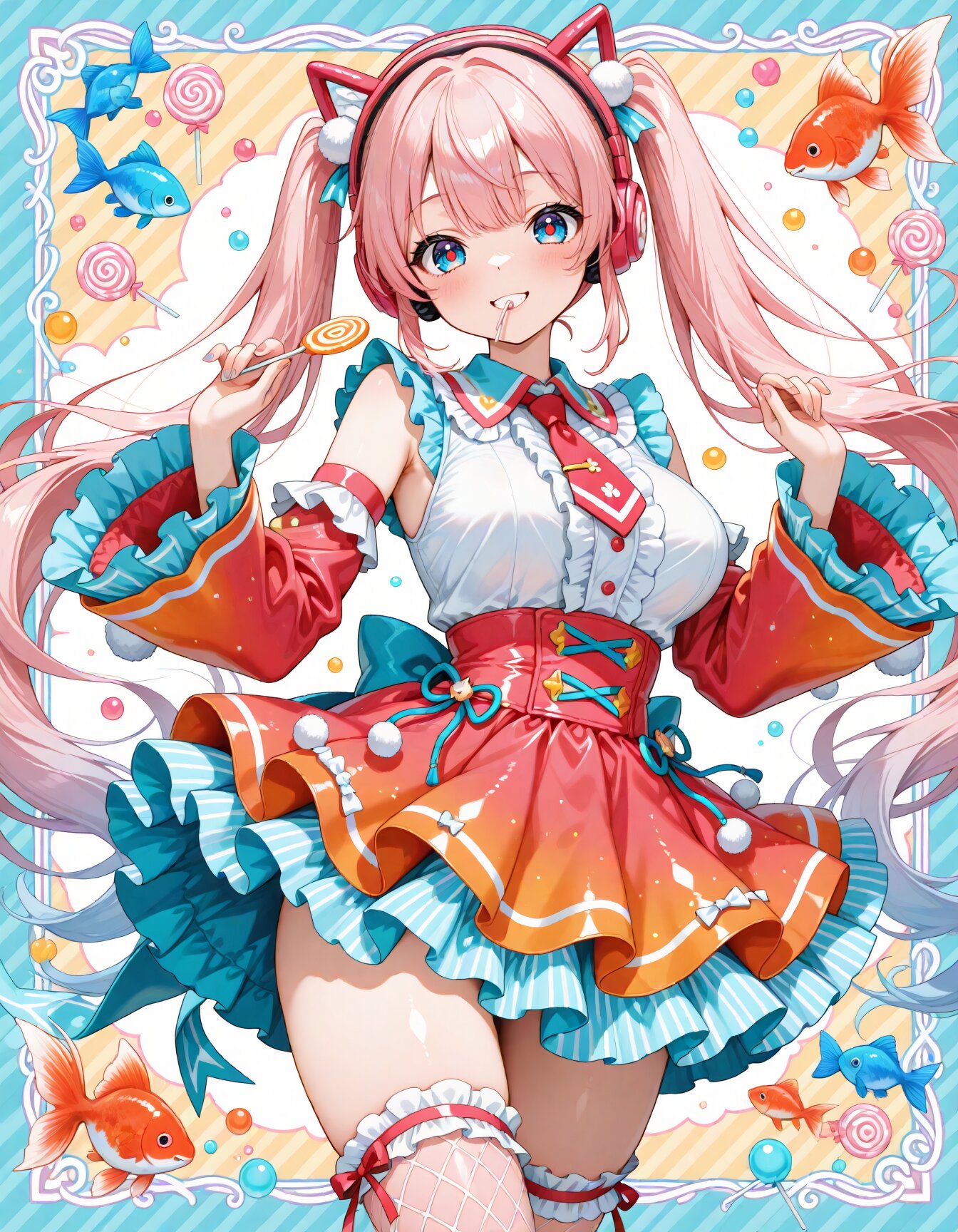 1girl, large breasts, Fluorescent Blue, cute colorful outfit, candy theme, playful expression, pastel colors, pop art style, Goldfish Orange vibrant background, frilly skirt, striped stockings, cheerful pose, anime style \(module\), ribbon, smile, colorful, breasts, striped clothes, alternate costume, headphones, thighhighs, solo, lollipop, twintails, frills, detached sleeves, fish, food, necktie, frilled shirt collar, skirt, candy, looking at viewer, pom pom \(clothes\), frilled skirt, very long sleeves, nail polish, fishnets, frilled thighhighs, zettai ryouiki, masterpiece, best quality, very aesthetic, newest, absurdres, safe,
