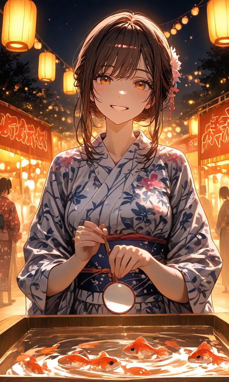 1 girl, Japanese cloth, festival, ,goldfish scooping