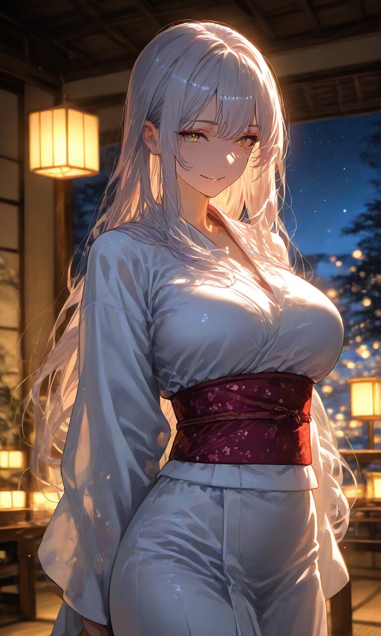 1 lady, long hair, silver hair, blue eeys, (big breasts), (Japanese cloth), night, Japanese room, , standing, seductive smile, cowboy shot masterpiece, best quality, ultra-detailed, very aesthetic, sharp focus, depth of field, vibrant colors, ray tracing, best lighting, detailed illustration, detailed background, cinematic, beautiful face, beautiful eyes