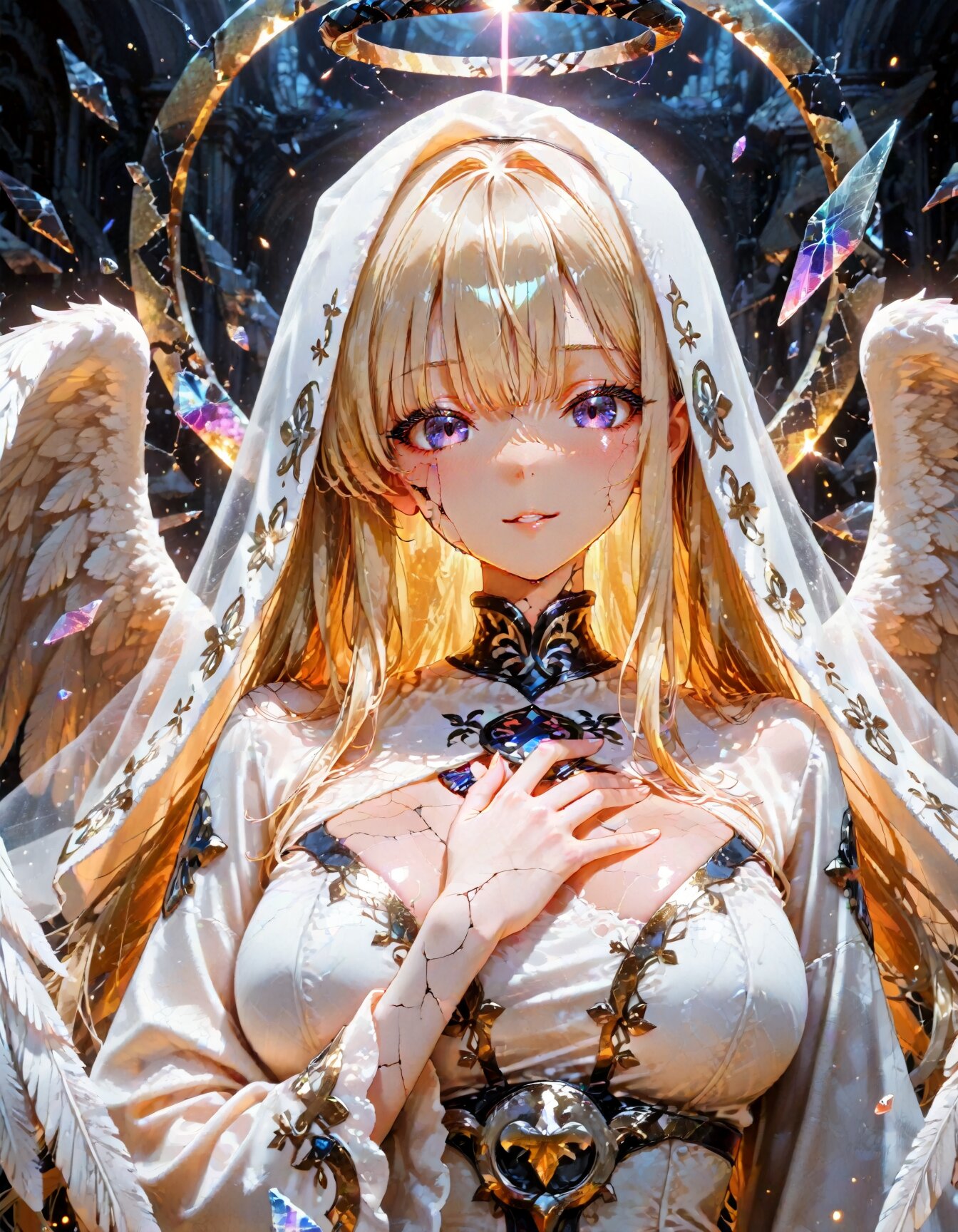 1girl, ultra detailed illustration, large breasts, solo, (angel:2.0), picture of the face of a woman with purple eyes and shatterglass pattern in her iris .., glass shard, upper body, long sleeves, broken glass, cracked skin, veil, parted lips, hand on own chest, breasts, eyelashes, broken halo, light particles, dress, sidelocks, smile, looking at viewer, straight-on, mobe-cedeenlamb, white dress, wide sleeves, halo behind head, shards, white veil, blunt bangs, halo, black halo, purple eye, masterpiece, best quality, very aesthetic, newest, masterpiece, best quality, newest, absurdres, absurdres, highres, safe, safe, <lora:Glass_Shard_Style:0.7> <lora:all_v9_LyCORIS_sdxl_4step:1.5> <lora:CelticDetailEnhancerV1:0.4> <lora:Smooth_Booster_v3:0.4>