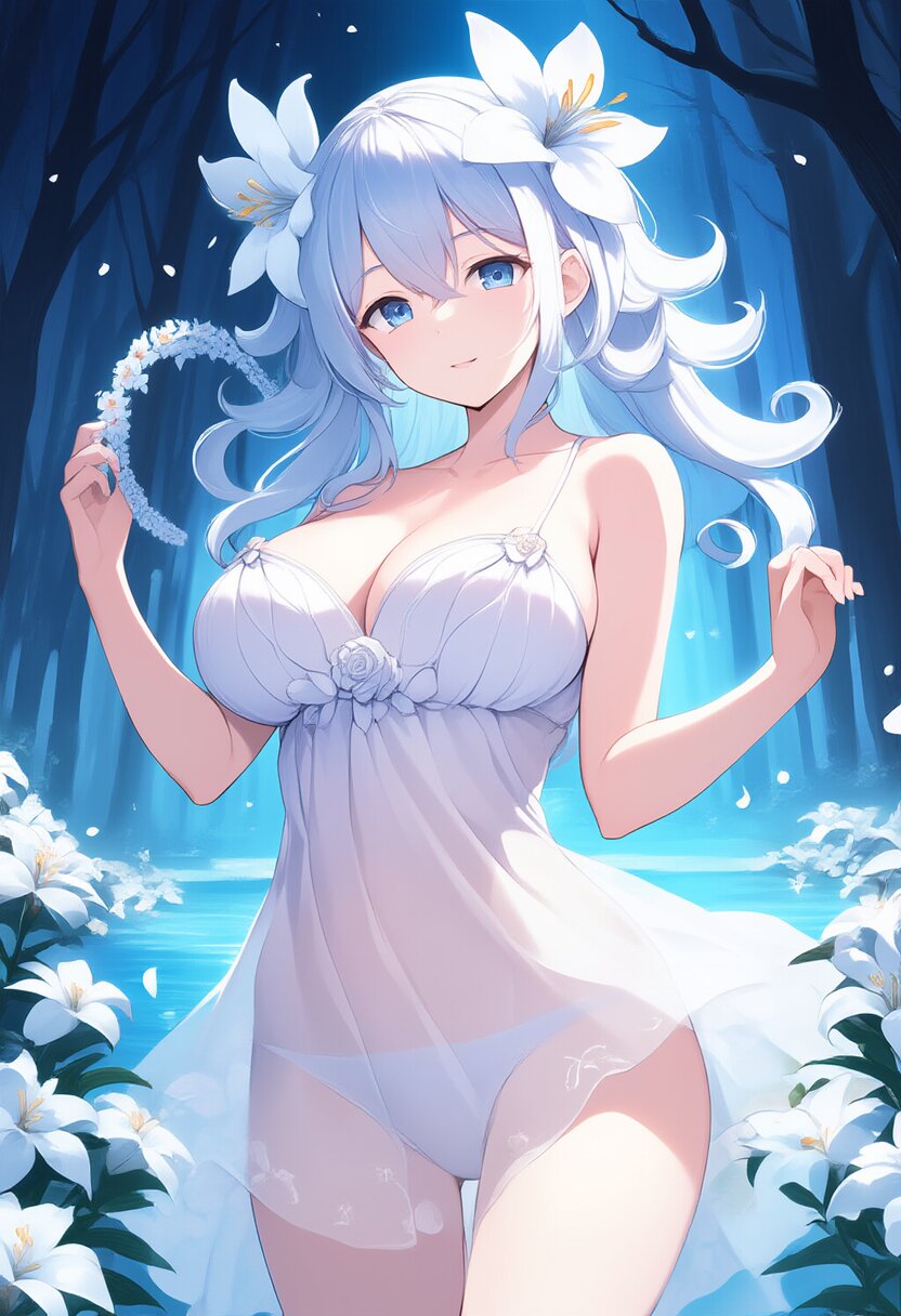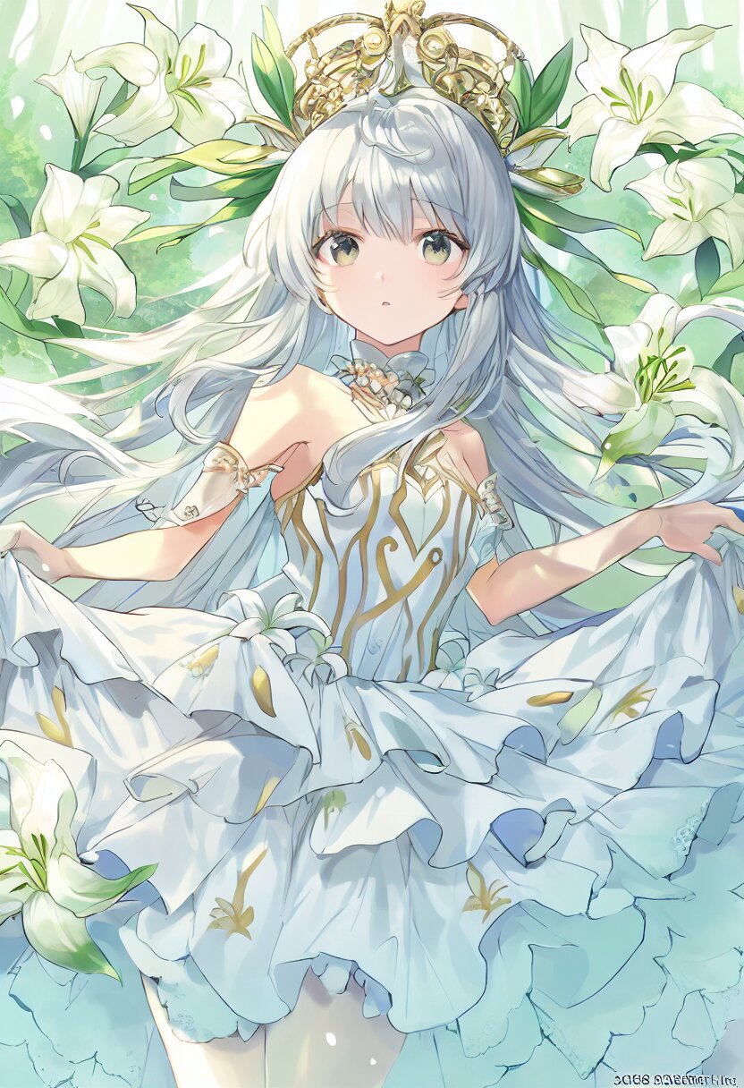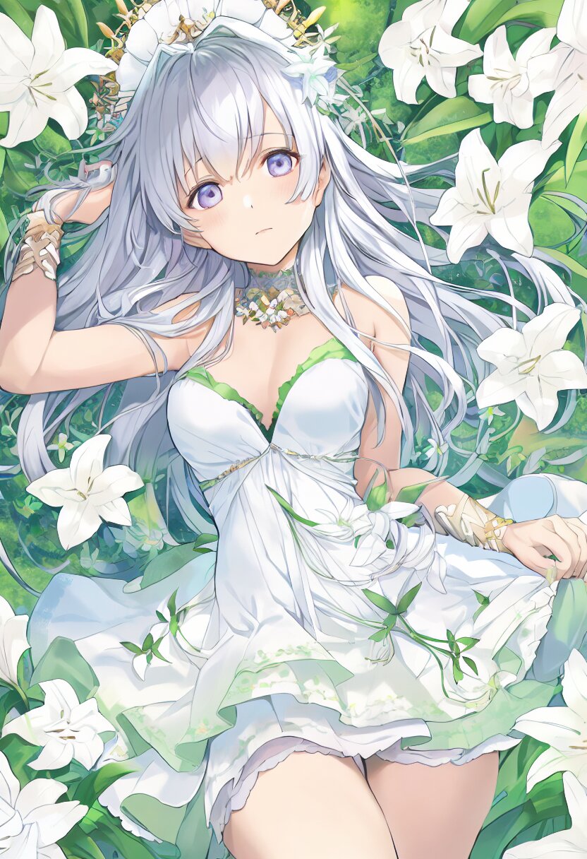 "Spirit of early summer forest where lilies dance" What I draw is the spirit of the early summer forest where the lilies are dancing. She has silver hair and a large lily flower headdress with soft curls. She wears a white tulle dress with a simple yet beautiful design and a small lily flower on her chest. In her hand, she holds a crown of lily flowers, surrounded by lily petals. The background depicts a forest full of blooming lilies, with a clear river running through the forest. In the forest, fantastic light is inserted, making it a very mysterious and beautiful scene. She is beautiful and graceful like a lily flower spirit., with blush cheeks, official art, {{ultra-detailed}}, {{high resolution}}, dynamic fuzziness, colorful, cowboy shot, underwear, girl ,solo, 20 years old, , no text, best quality, very aesthetic, absurdres