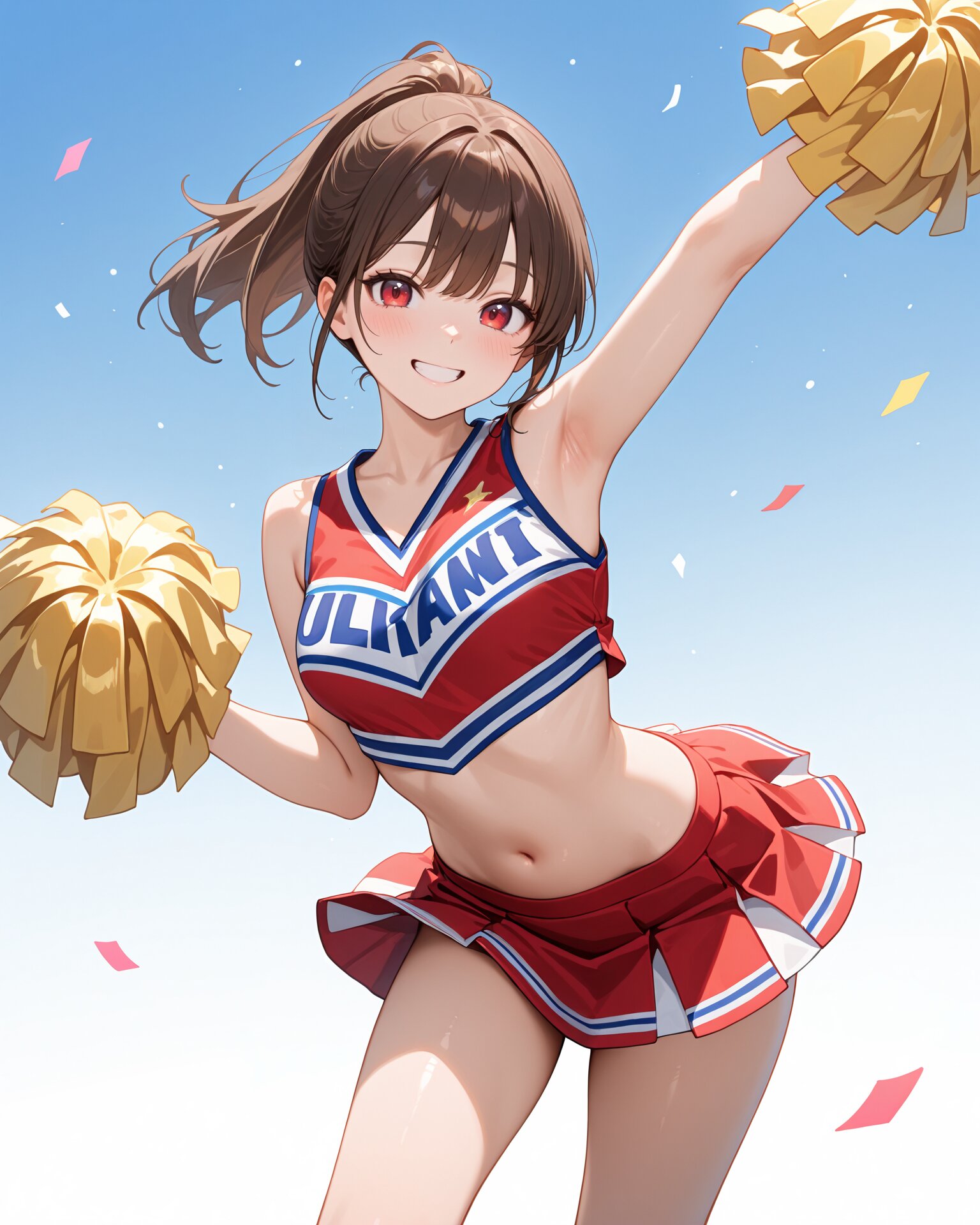 (brown hair:1.2),middle hair,(ponytail:1.2),(red eyes:1.2),(slant eyes:1.2),(medium eyes:0.9),(smile:1.2),(medium breasts:0.8),(slim:1.2), cheerleader, confetti, dancing,