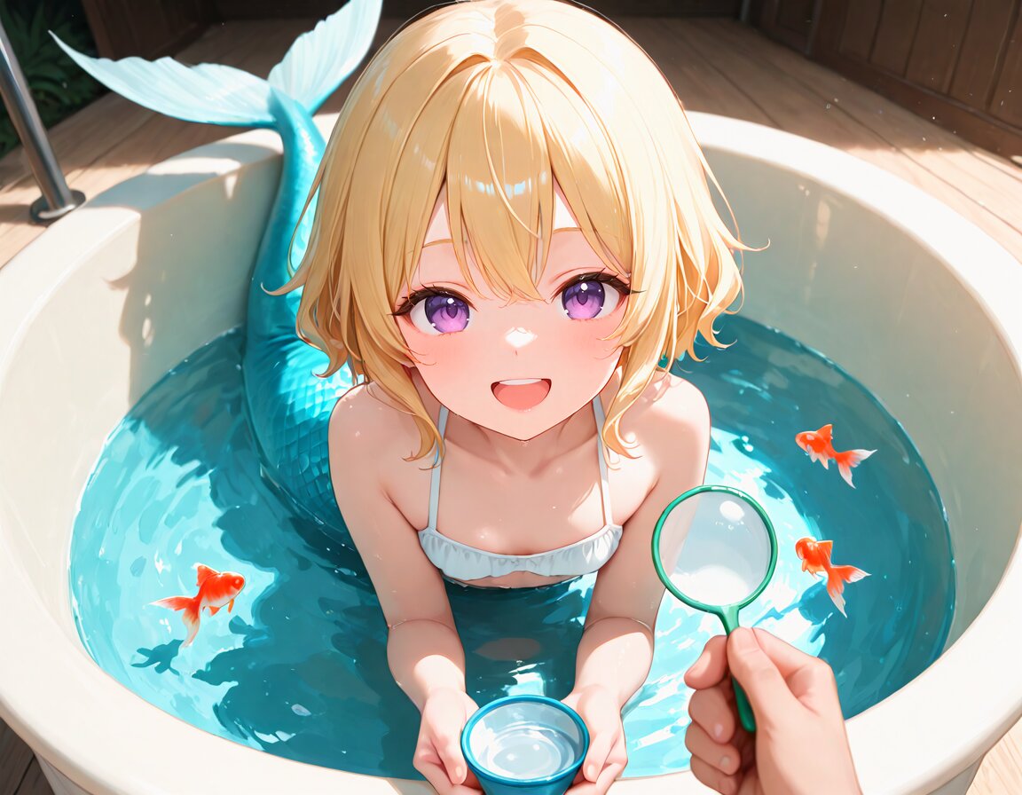 1girl,mermaid,small girl,goldfish,:d,blonde hair,fish,goldfish scooping,holding,looking at viewer,open mouth,poi (goldfish scoop),pov,pov hands,purple eyes,short hair,smile,water,, appropriate posture,appropriate configuration,ideal ratio body proportions,perfect anatomy, <lora:Fixhands_anime_bdsqlsz_V1:1>, masterpiece,best quality,newest,absurdres,highres,ultra high res,8K UHD,hyper-detailed,