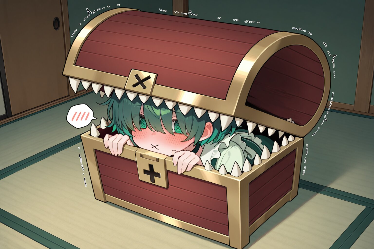 ■1で箱に入っている子を作成して、■2でi2iで最終化しました ■1: mimic chest, no girl, masterpiece, best quality, amazing quality, very aesthetic, trembling, spoken blush, in japanese room, ■2: mimic chest, masterpiece, best quality, amazing quality, very aesthetic, cobalt green hair, short hair, messy hair, (hair over eyes:1.2), green eyes, demon fangs, @_@, (:x:1.2), trembling, spoken blush, choker, green wa maid outfit, in japanese room,