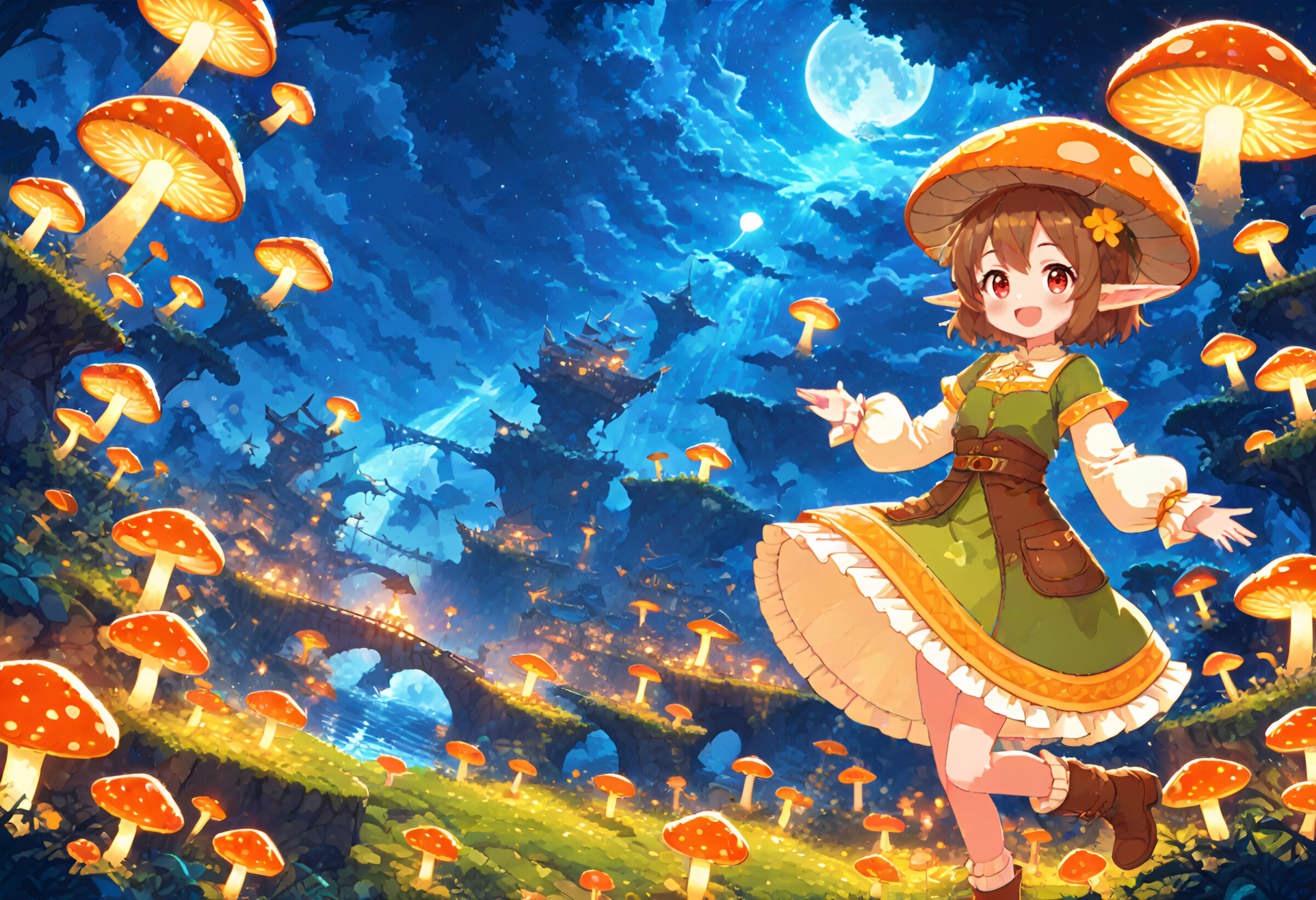 1girl, 13 years old, elf ears, brown hair, short hair, flat chest:0.8, (short pointy ears:0.5), (solo:1.5), a cute pixel art girl wearing a green outfit and a mushroom hat, flying on a giant flying mushroom like an airship, joyful expression, scenic fantasy sky, floating islands, twinkling stars in the background, soft lighting, dreamy atmosphere, magical sparkles, retro fantasy style mushroom vehicle, fantasy skyship, glowing trails, cloud sea, nighttime adventure, sparkles in the air masterpiece, amazing quality, 4k, prefect lighting, very aesthetic