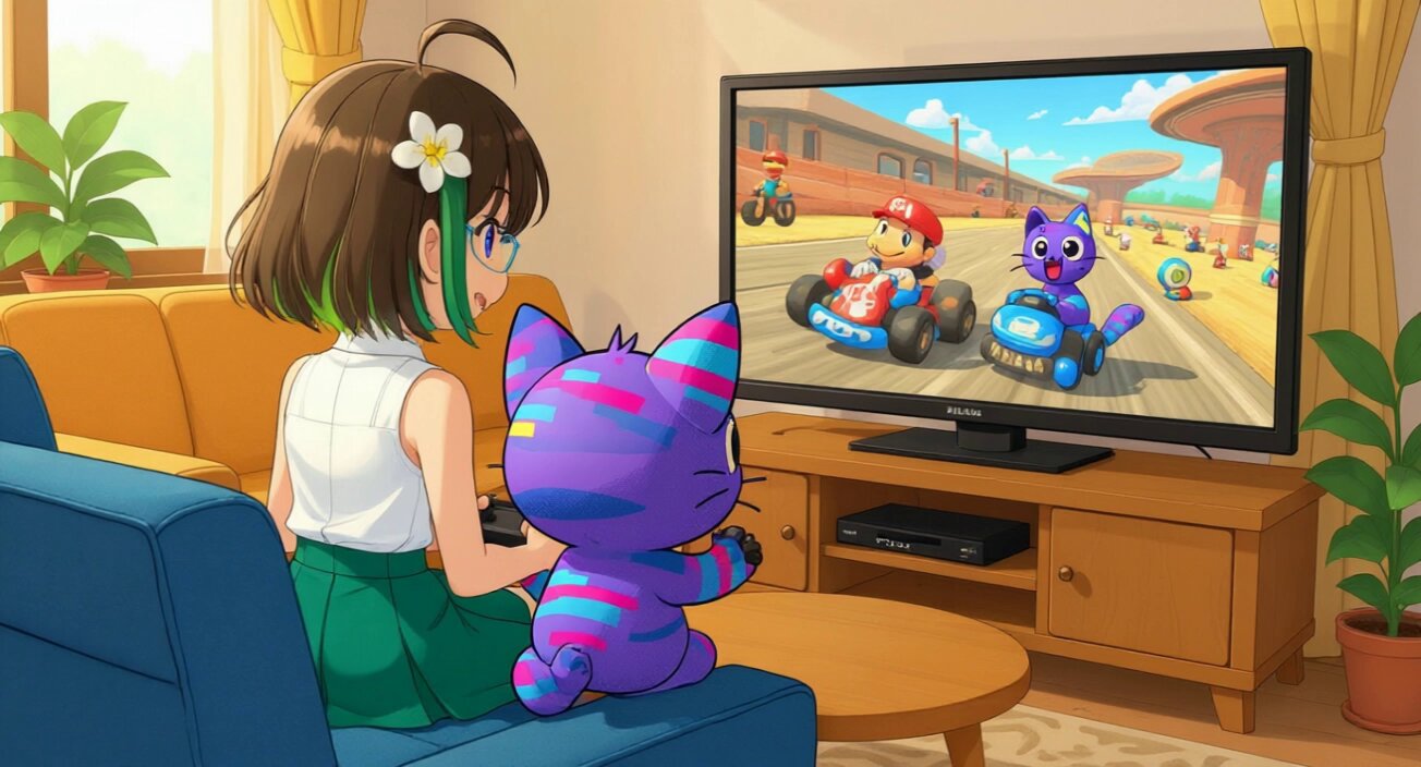 The anime-style illustration depicts a small purple mascot character and a girl wearing colorful grunge patterns sitting on a sofa in front of a large television, facing away from