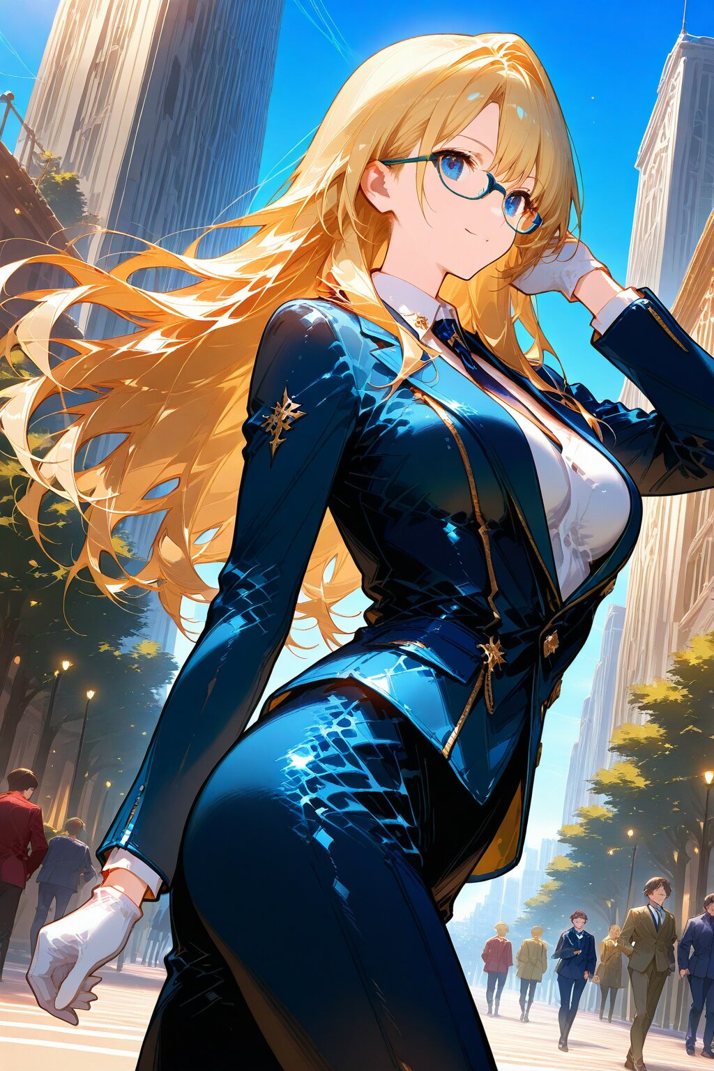 1 lady long hair, blonde hair, glasses, (classical suit), cowboy shot