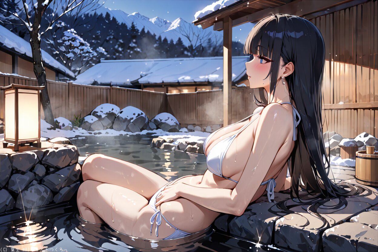 (best quality),(masterpiece),(ultra detailed),1 lady, long hair, black hair, blunt bangs, cool,breasts, relaxed, white bikini, (onsen, winter), side view