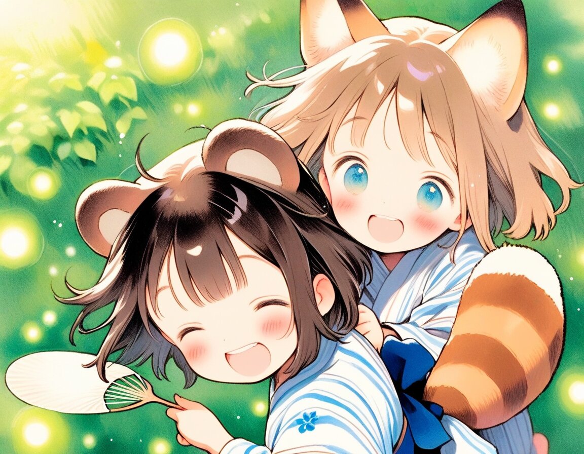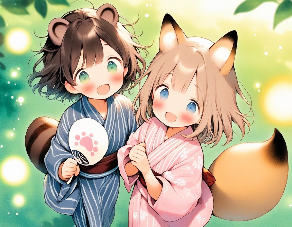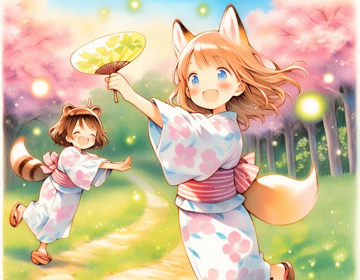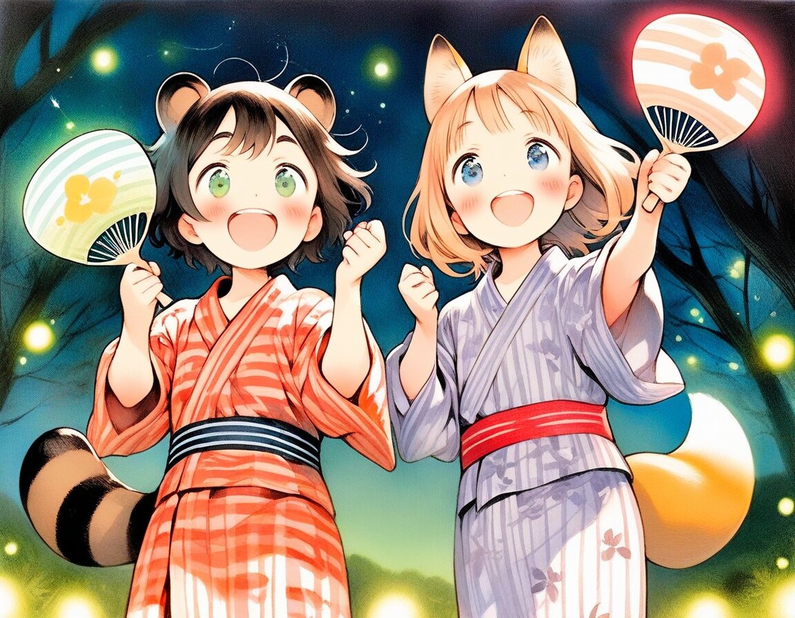 2girls, loli, mid, general, traditional media, pictrebook, storybook, (colored pencil drowing), pastel colors, soft tone, (blurred boundaries, drowing lines, Paper texture), cute, deformed, ultra-detailed background, Very detailed and textured costumes, (masterpiece, best quality), (barasui:0.1), (oyari ashito:0.1), from above , dynamic pose, dynamic angle, dynamic composition, cowboy shot, wearing plain yukata, holding, uchiwa, chasing fireflies, joyful expressions, shallow stream in rural nature, summer evening, lush greenery, soft golden twilight, peaceful atmosphere, cinematic lighting, gentle colors, warm tones BREAK 2girls, loli, dark brown hair, short hair, messy hair, fanged bangs, green eyes, Droopy eyes, (dark brown raccoon ears, dark brown raccoon tail with striped pattern), yukata, laughing, happy, BREAK 2hgirls, loli, light brown hair, medium hair, choppy bangs, blue eyes, (light brown fox ears, Light brown fox tail with white tip, petite), yukata, smile, happy,