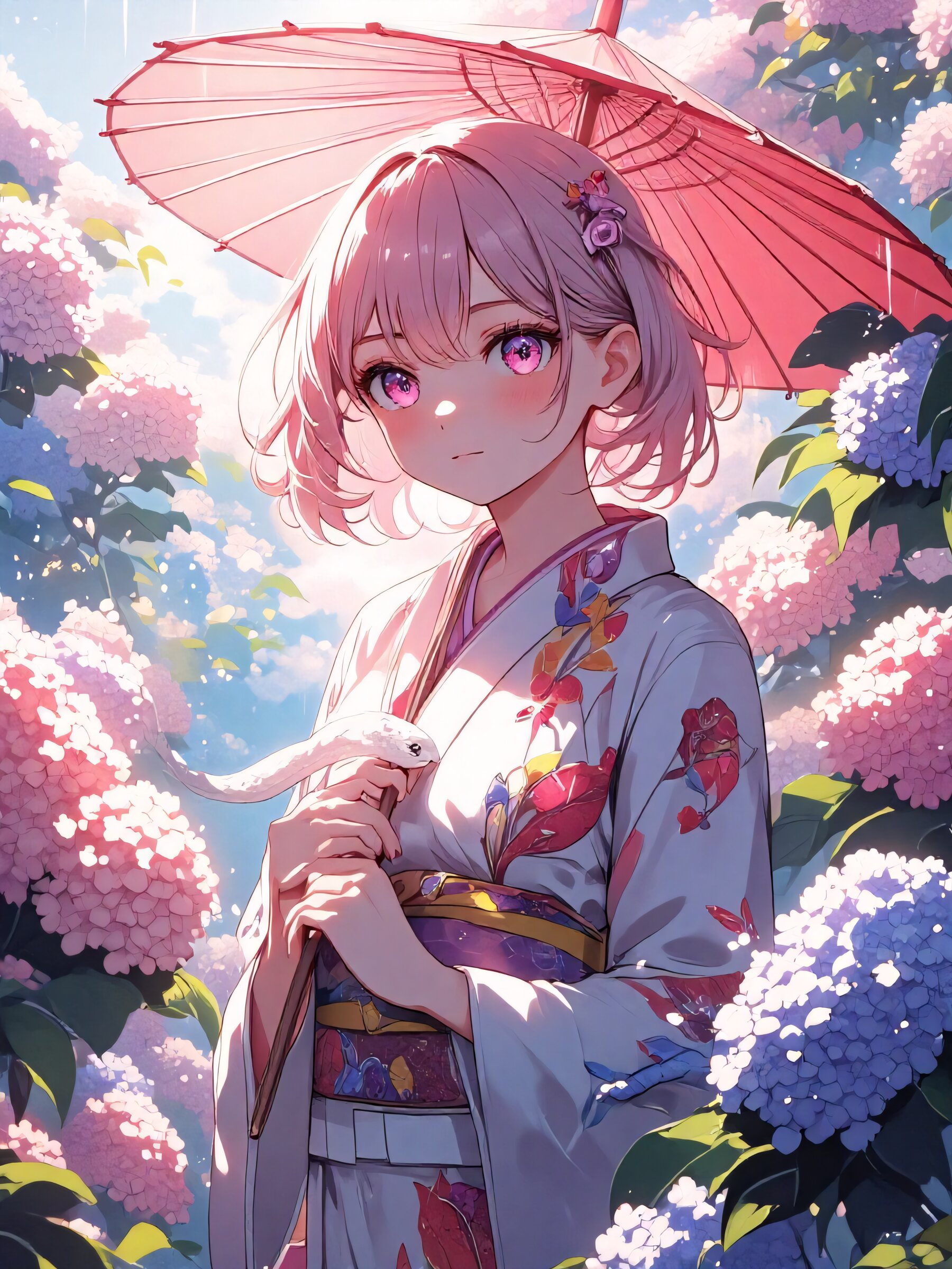 anime style, full-body, girl with soft light pink hair, wavy short bob hairstyle, delicate pink eyes, wearing an elegant yukata, holding a traditional umbrella, surrounded by blooming hydrangeas, gentle raindrops falling, misty and serene atmosphere, accompanied by a gracefully coiled white snake, warm and peaceful smile, cinematic lighting, visually captivating aesthetic