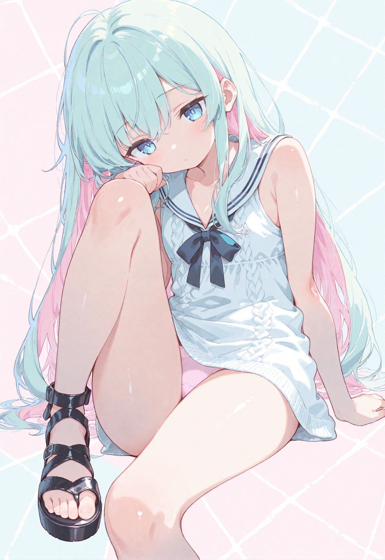 high quality,masterpiece,pastel hair, long hair, (hibiki \(kancolle\):0.5), (gochuumon wa usagi desu ka?:0.2), (blue archive:0.2), blue eyes,shiny, soft lighting,pastel color palette, delicate shading, high detail, sharp lines, child girl,simple background, simple pattern background,colored inner hair,gradation,ribbon, sleeveless knit,leather sandals,curling up on her side like a sleepy kitten,panties,
