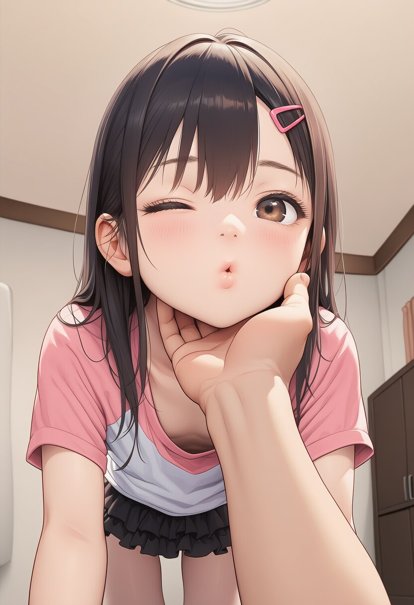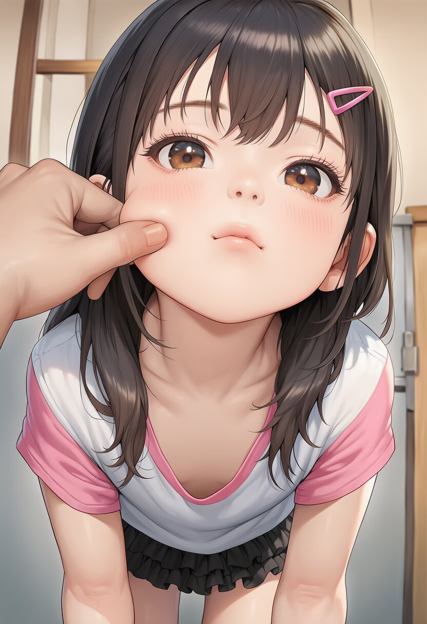 1girl,1boy,masterpiece, best quality, photorealistic,realistic,taste of japanese anime in 2024,rating:sensitive,8years old female toddler,elementary school student,beautiful girl,cute girl,taste of japanese animation in 2024,{{ideal ratio body proportion,flat chest,no breasts,toddlercon, toddler body,skinny}},{{black hair, long hair,sidelocks,hair between eyes,hair clip}},{{closed eyes,cute eyes,beautiful detailed eyes,eyelashes,brown eyes}},{{cleavage}},{{civilian clothes,two-tone shirt,black frilled mini skirt}},puckered lips,all fours,crawling,from below,looking down at viewer,fisheye lens,no text, very aesthetic, absurdres,pov hand touching girl's chin, very aesthetic, masterpiece, no text