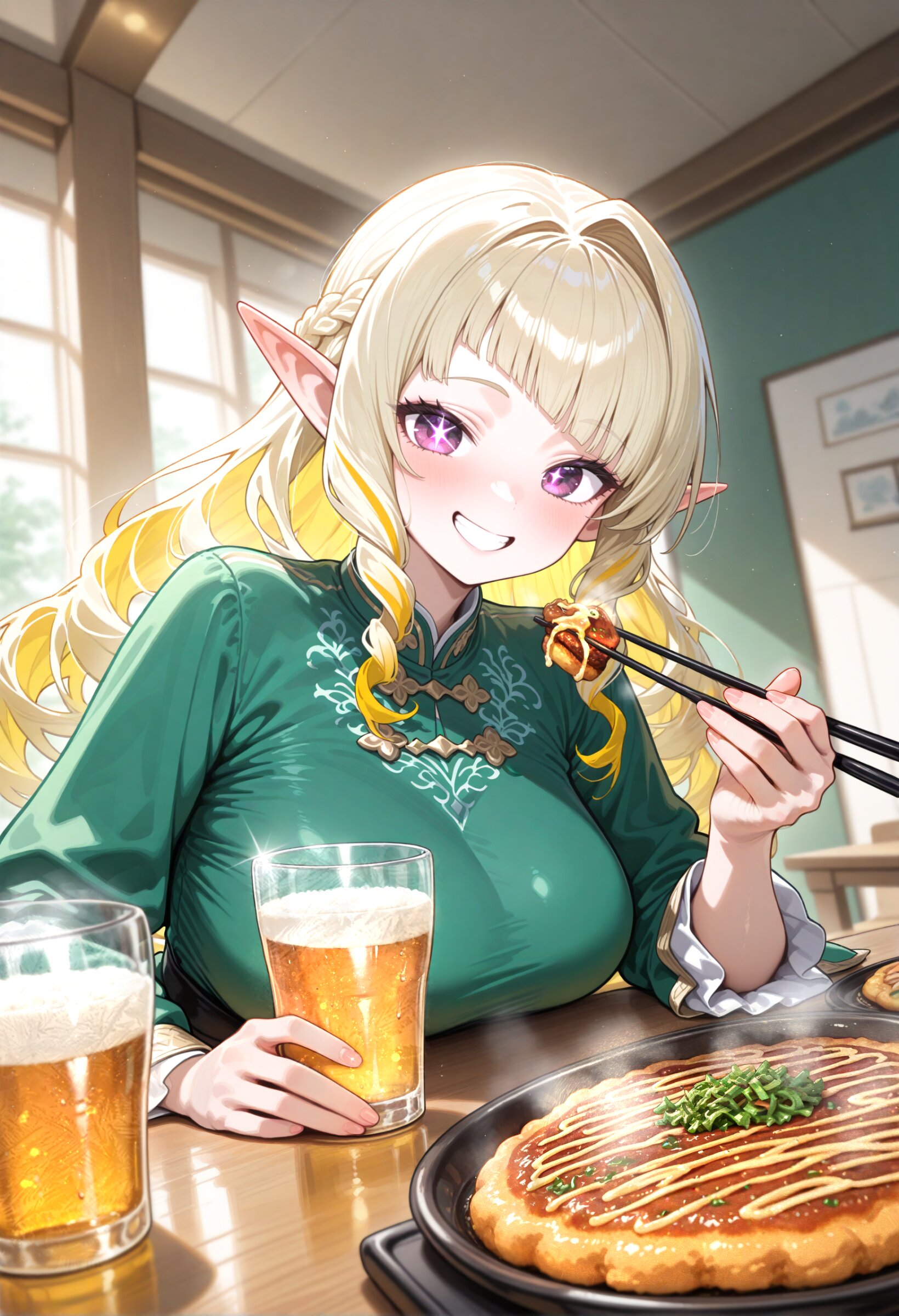 multiple girls, (four elf girls:1.2), having a drinking party at a old japanese bar,. They are seated around a round table, drinking, chatting, and enjoying their food. Please show their joyous expressions and the sense of camaraderie between them, (noon:1.3), soft natural sunlight, high angle shot, looking up, (upper body:1.2), looking at viewer, perfect anatomy, with chopsticks, spoon,,, , eating sukiyaki, Okonomiyaki on plate, professional anime art lots of details, Delicate and vivid dishe, glint, glitter, glowing food, overexposure, shiny-glistening, masterpiece, best quality, amazing quality, very aesthetic, absurdres, , you can add tag scenery, (volumetric lighting), To make the background more distinctive. (watercolor style:0.8), (pastel color style:0.8) super fine concept art, hard surface, 8K, unreal engine, <lora:noline (1):-0.5> <lora:sdxl2-flat2-512b:-0.5> <lora:facelightup_xl_v10:0.5> beautiful elf girls sitting on dining-room chair, 1elf girl, (pale skin:1.1), aquamarine hair, beige streaked hair, highlights hair, prehensile hair, braid Slicked back hair , skinny hair, insanely beautiful black eyes, first-rate female bodies, voluptuous body, flat breasts, wide hips, (embarrassed:0.8), (drunkard, happy:1.1), glow eyes,, (japanese ornate dress:1.3), kanzashi, dynamic lighting, sunlighting, warm sunlight, (depth of field),warm, Comfy, Soft Lighting, shiny smile (gently smile:1.0), sukiyaki, extremely detailed, perfect face, perfect eyes, (depth of field), (drink glass of beer and glass of water:1.3), , happy smile, super fine concept art, hard surface, 8K, unreal engine, cheerful elf girls sitting 文字数制限により省略
