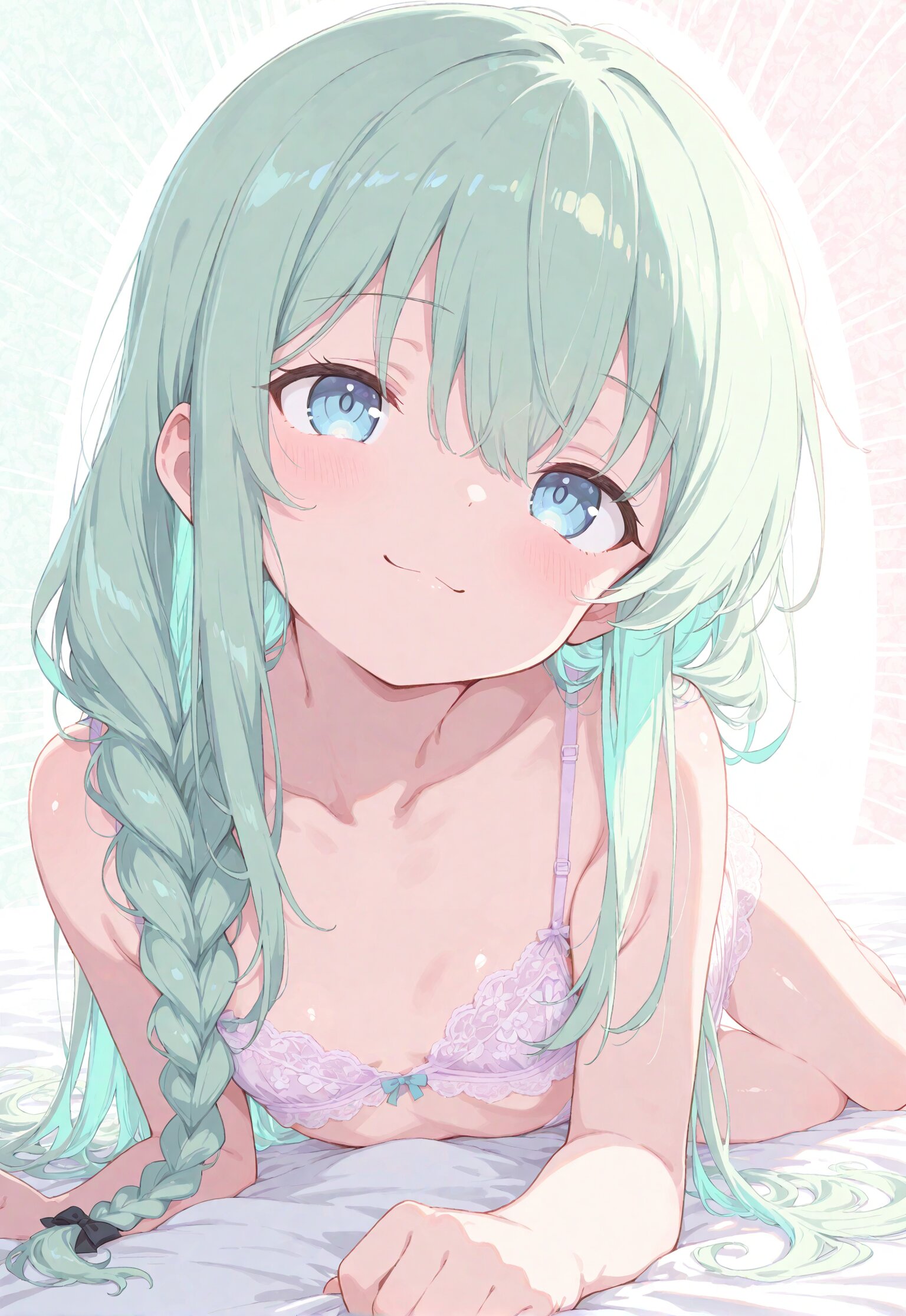 high quality,masterpiece, child, long hair, (hibiki \(kancolle\):0.6), (gochuumon wa usagi desu ka?:0.4), (blue archive:0.2), shiny, soft lighting,pastel color palette, delicate shading, high detail, sharp lines, simple pattern background,colored inner hair, gradation,lingerie, sideburn braided hair, swaying body, looking up, mischievous smile, green hair, The pose you want,straight hair