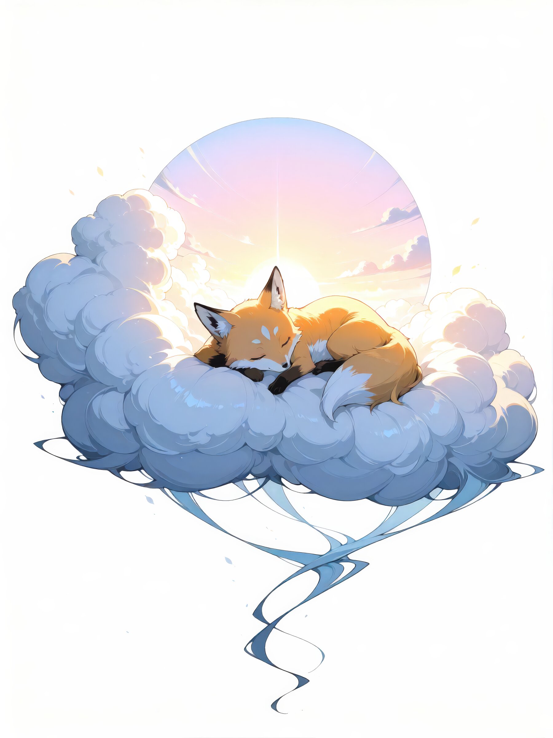 Best quality, Masterpieces, simple background, negative space, anime-style illustration, white background, fine detail, solo, happy, cinematic angle, official wallpaper, fox cub peacefully napping on a fluffy cloud, pastel sky, soft lighting, serene mood