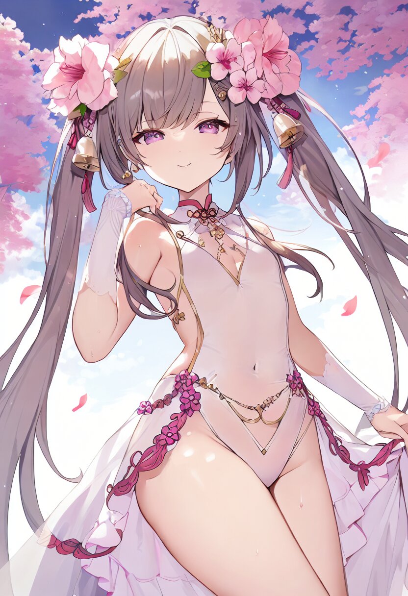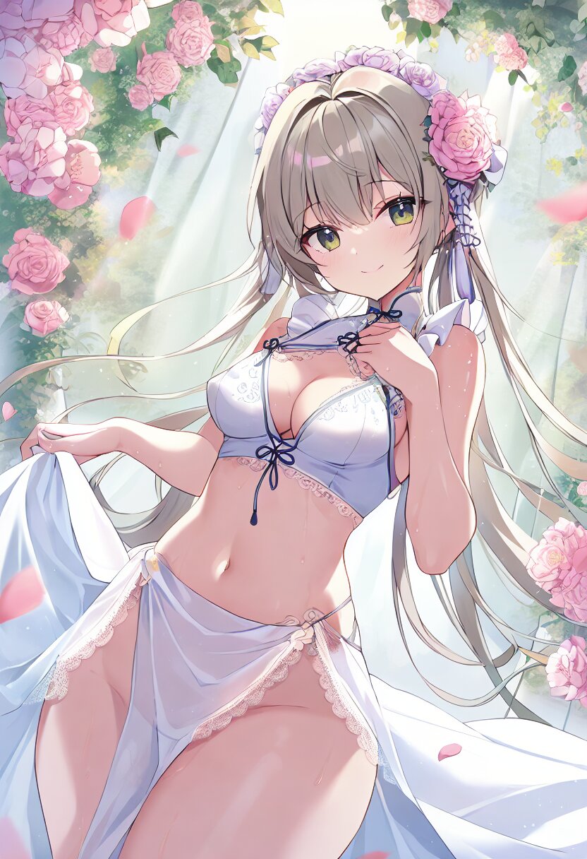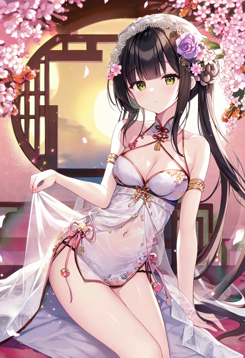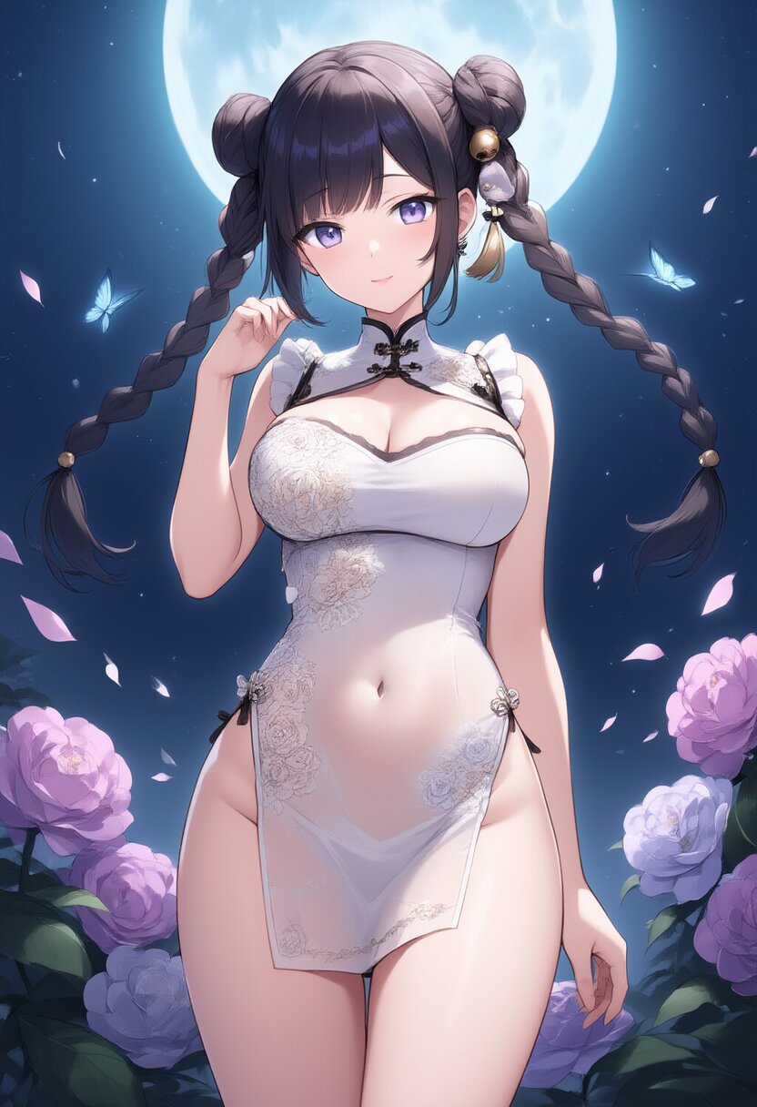 very aesthetic, best quality, absurdres, In a moonlit garden surrounded by softly blooming flowers and floating petals, a girl wearing an exotic China-style maid outfit stands alone. Her see-through lace blouse with Chinese patterns and bell decorations shimmers under the ethereal light. Her braided twintails sway gently, and her navel peeks through the delicate fabric. Ethereal butterflies flutter around her, enhancing the dreamlike, romantic atmosphere.