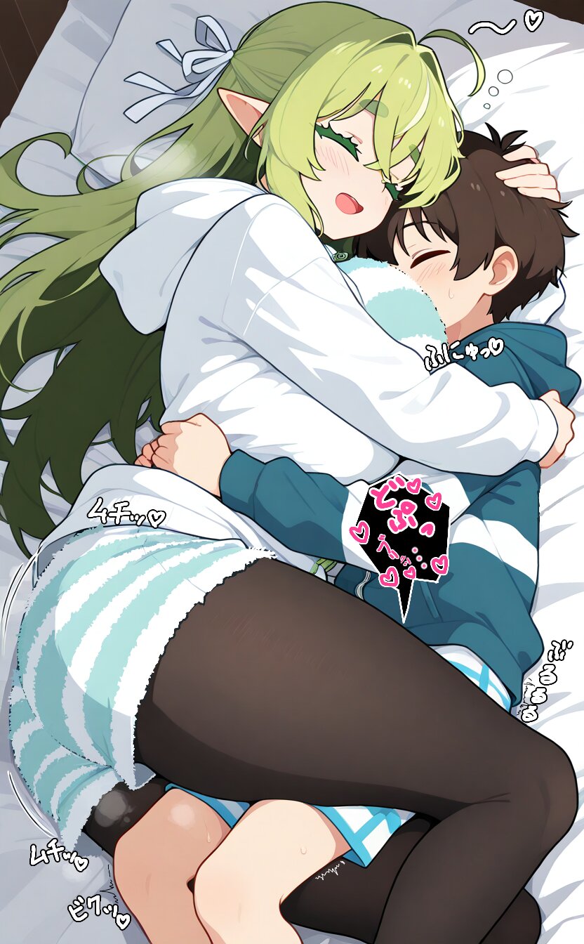 1girl,solo,layering,huge breasts shaped clothes,pointy breasts,covered nipples,pointy ears,slim,(long legs:1.1),(wide hips:1.1),huge ass,(voluminous thick thighs:1.1),green hair,cowlick,crossed bangs,long hair,closed eyes,green eyelashes,green eyebrows,pink lips,open mouth,tsurime,impossible clothes,long sleeves,hooded jacket,zipper,white jacket,white shorts,white ribbon,striped shorts,(fluffy:1.3),light-smile,steaming body,light-open mouth,sleeping,lying on side on bed,front-to-front,mutual hug,grabbing her breasts,head between breasts,breast smother,onee-shota,femdom,faceless male,short male,dry humping,humping boy,height difference,waist wagging,thigh sex over clothes,flying sweatdrop,motion lines,motion blur,bed sheets background,from above,from side,(stylized),(kawaii),(anime colored),(cute),flat color,gddw,((correct_anatomy)),black pantyhose,,long_sleeves, hooded_jacket, zipper, white_jacket, striped_hoodie, white_shorts, white_ribbon, striped_shorts, (fluffy:1.3)