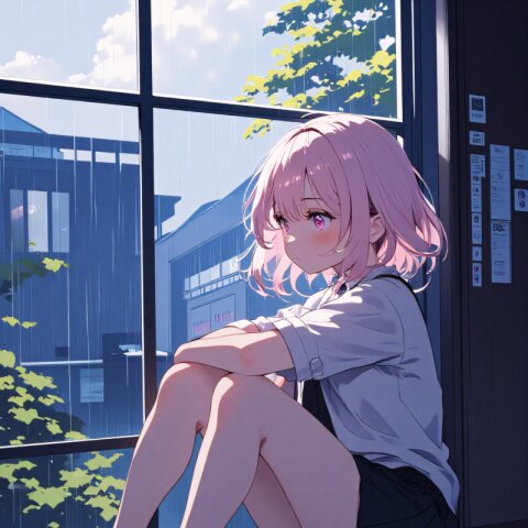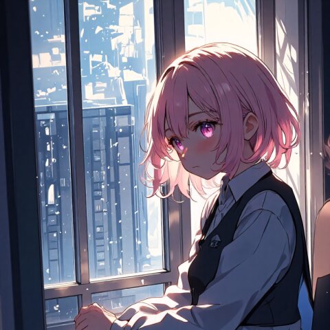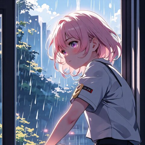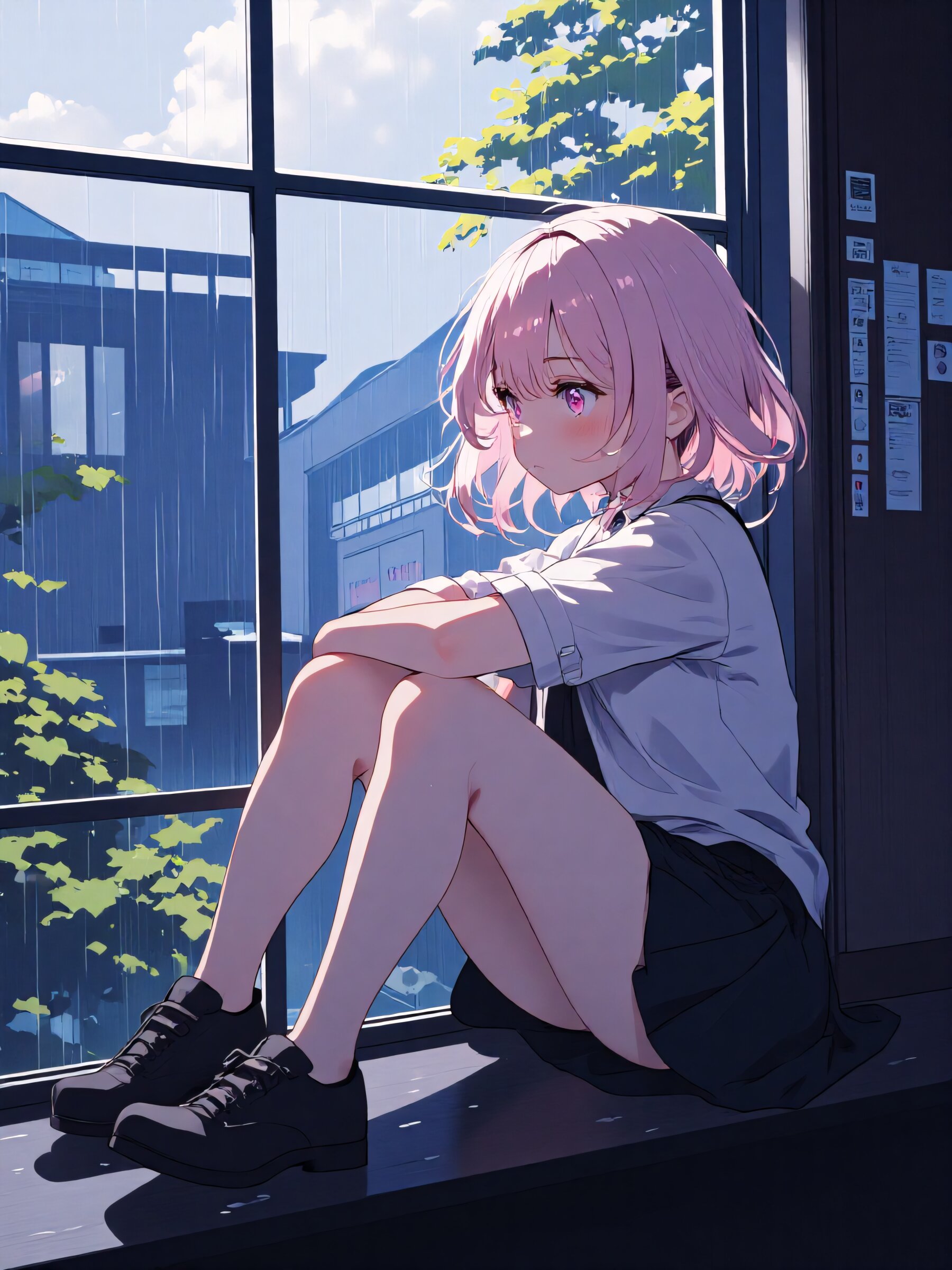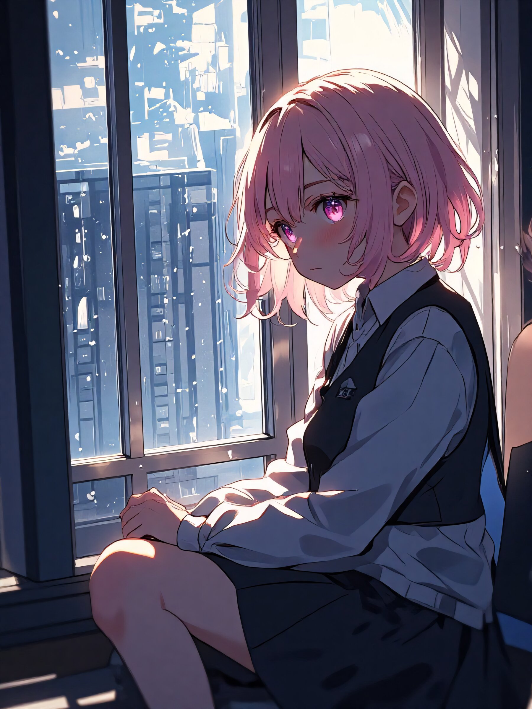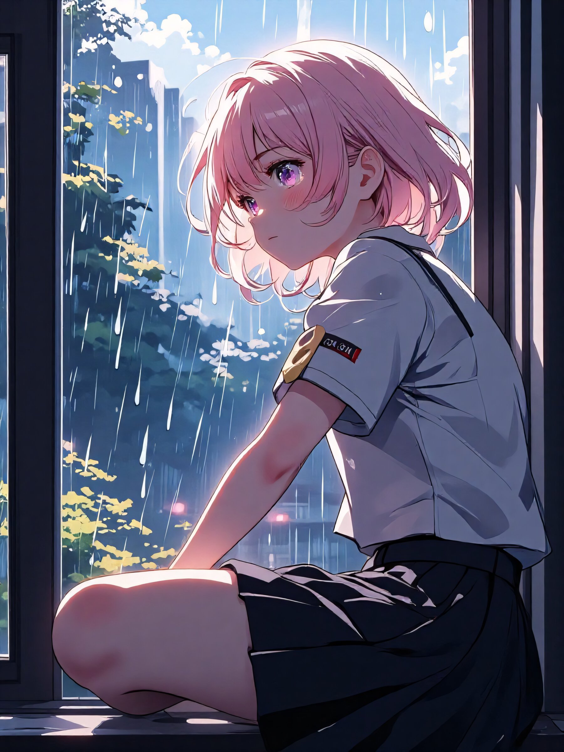 anime style, full-body, girl with light pink hair, soft wavy short bob, vibrant pink eyes, wearing a stylish school uniform, sitting by a window, gazing at the rain outside, raindrops trickling down the glass, melancholic and serene atmosphere, gentle lighting, cinematic composition, visually captivating aesthetic