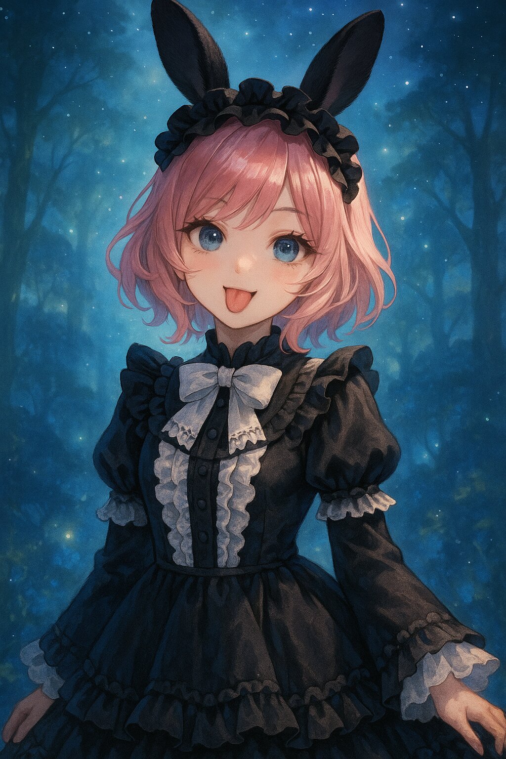 長方形、3:4、アニメ調、高画質、高品質。 幻想的。 主人公: 女性、日本人。 美人、かわいい。 目が大きい、やや吊り目。 瞳は薄い水色。 髪、ピンク色、ショートボブ、ふんわりしている。 舌をペロっと出している。 服装: ゴシックロリータ。 黒色ベースで白色ハイライト。 ウサ耳。