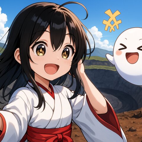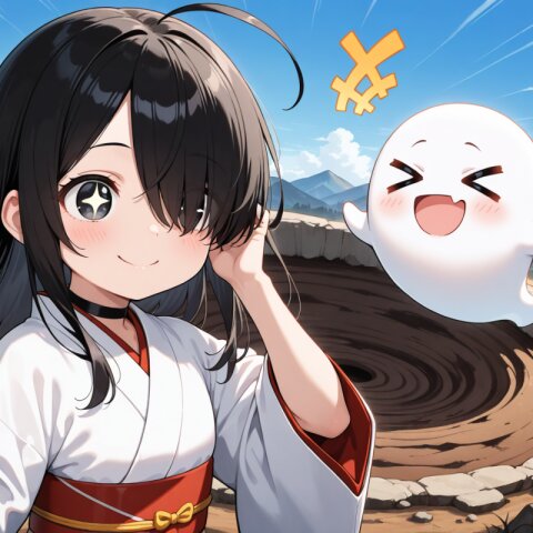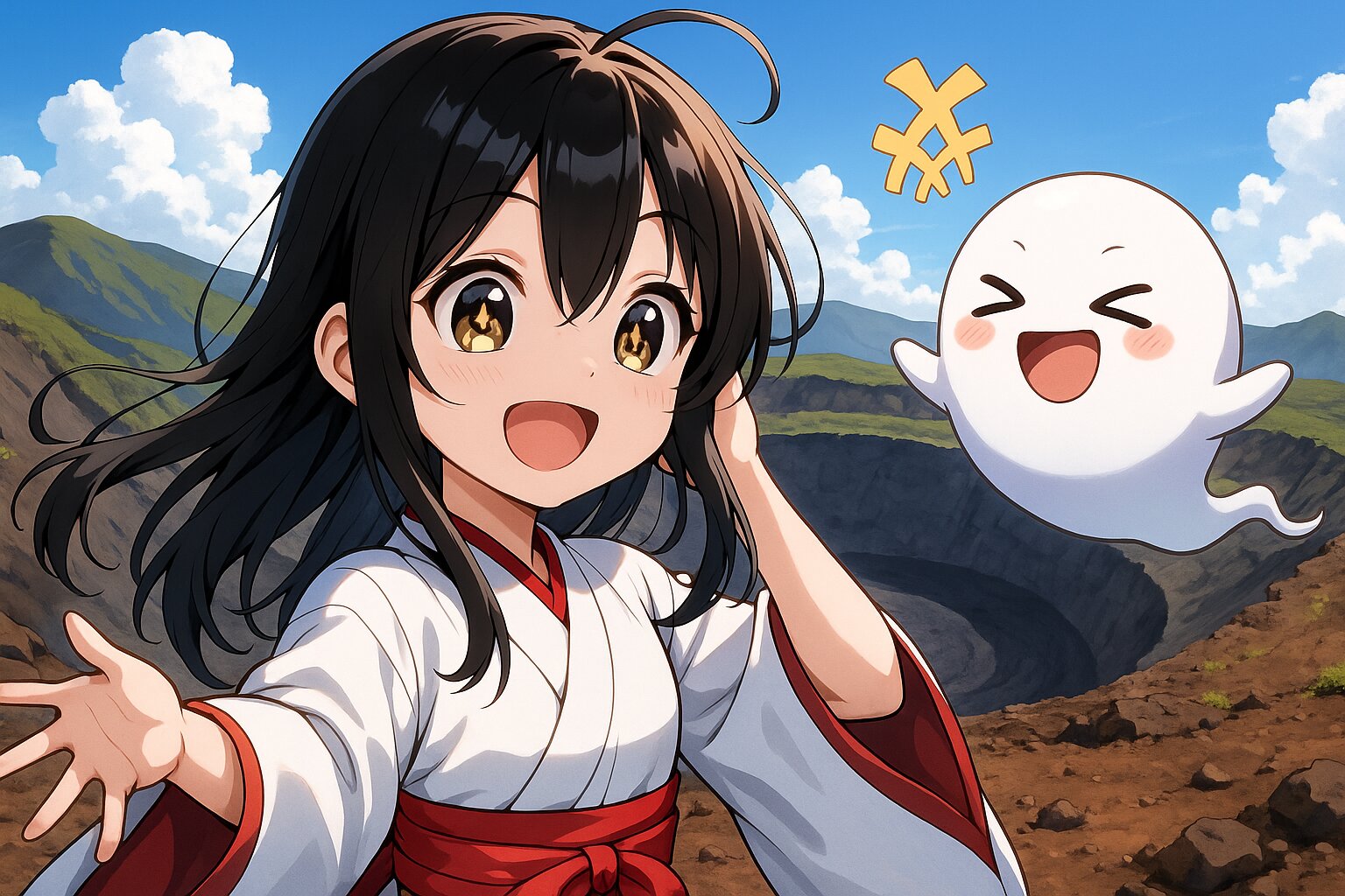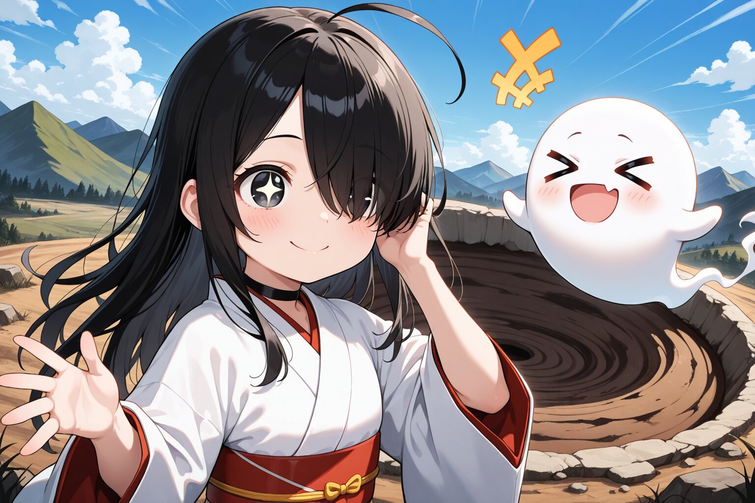 1 little girl, solo, upper body, diagonal angle, panorama view, side view, masterpiece, best quality, amazing quality, very aesthetic, black hair, long hair, ahoge, (hair over one eye:1.2), black eyes, +_+, closed mouth, smile, cheerful, +++, notice lines, choker, white kimono, ghost, > <, hiking, mountain,wasteland, huge crater,