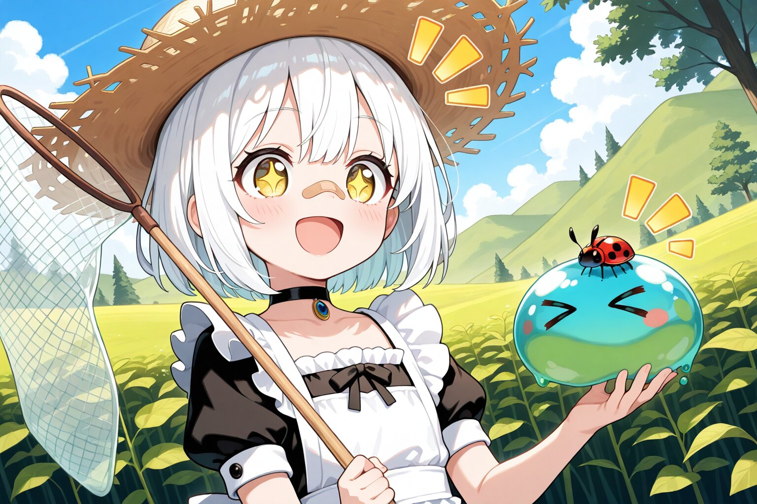 1 little girl, solo, upper body, diagonal angle, masterpiece, best quality, amazing quality, very aesthetic, white hair, short hair, yellow eyes, +_+, open mouth, smile, cheerful, +++, notice lines, choker, maid outfit, straw hat, bandaid on nose, bug hunting, holding bug net, slime, > <, ladybug on headwear,