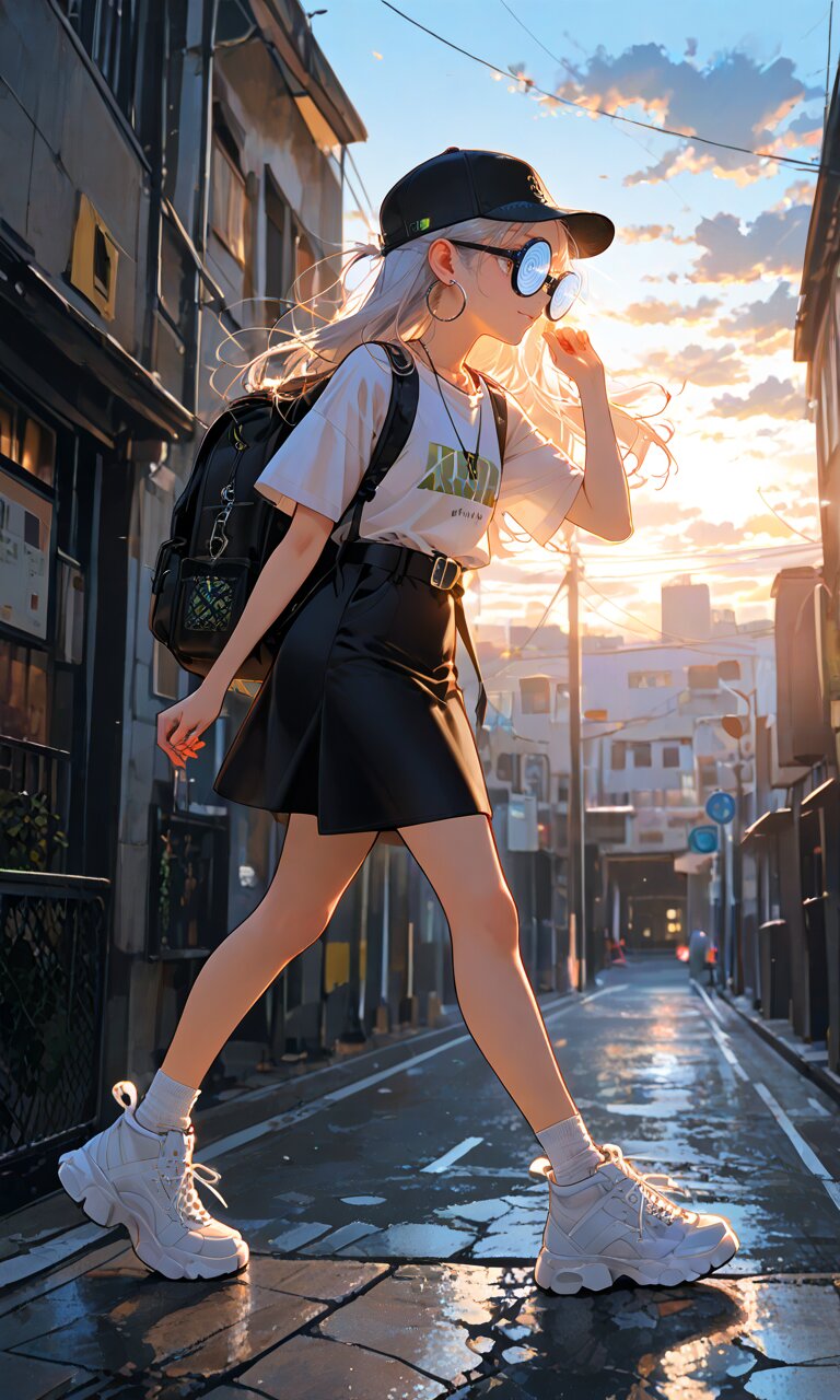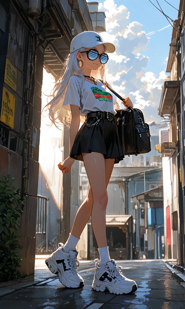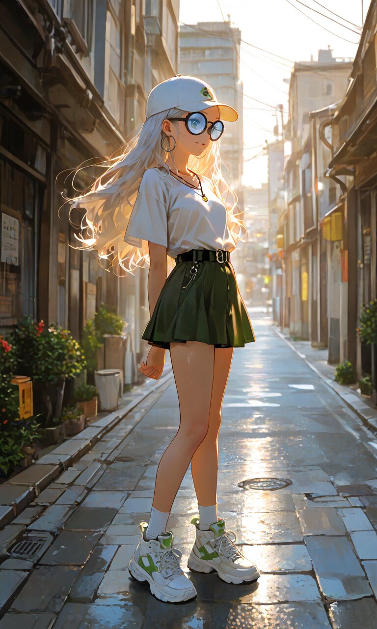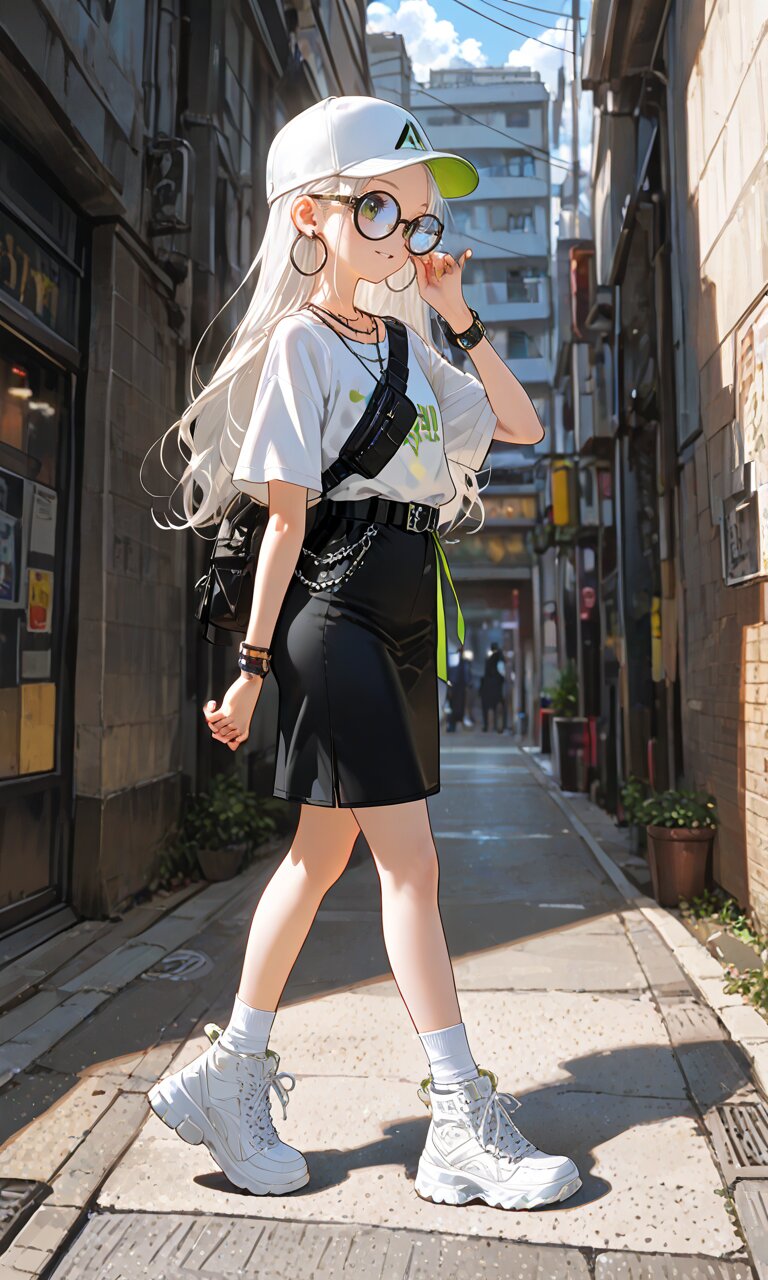 1girl with (giant glasses:1.5), cloudy glasses, long shiny hair, white hair, forehead, collarbone, (wearing a loose black and white horizontal striped short sleeve tee:1.2), the shirt is slightly tucked into (a high-waisted olive green pencil mini-skirt with belt:1.2), the skirt is made of light cotton fabric and has a casual, structured silhouette, sporty sneakers with thick white soles, socks and platform boots, white ankle socks slightly wrinkled at the ankles, a white baseball cap worn low, large round silver hoop earrings, carrying a black urban daypack with padded straps, streetwear style with minimalist accessories, necklace, walking down street, from side, flat chest, slender, (exquisitely delicate skin), beautiful small face, parted lips, light smile, kawaii, cute, BREAK (masterpiece, aesthetic quality, 8K, intricate highly detailed), perfect design, amazing quality, high quality, absurdres, highres, natural lighting, semirealistic, street view. (best quality, very aesthetic), newest, add-detail, intricate colors, vibrant colors, score_9, score_8_up, score_7_up, score_6_up, source_anime, <lora:Worldly_XL:1>