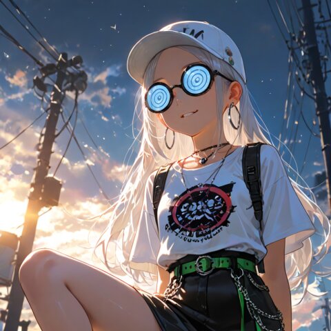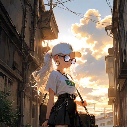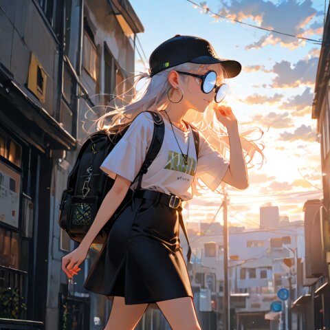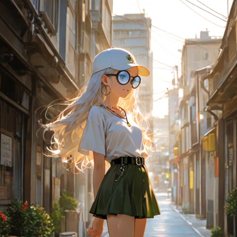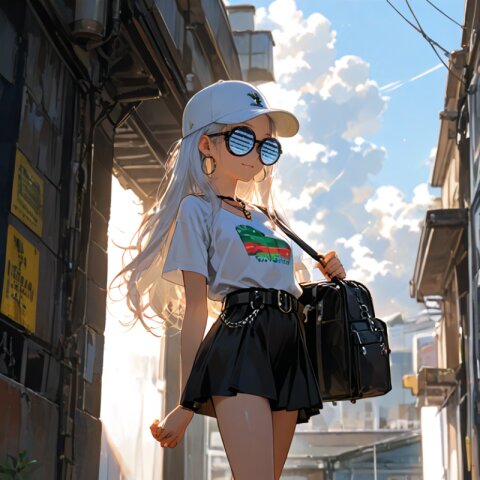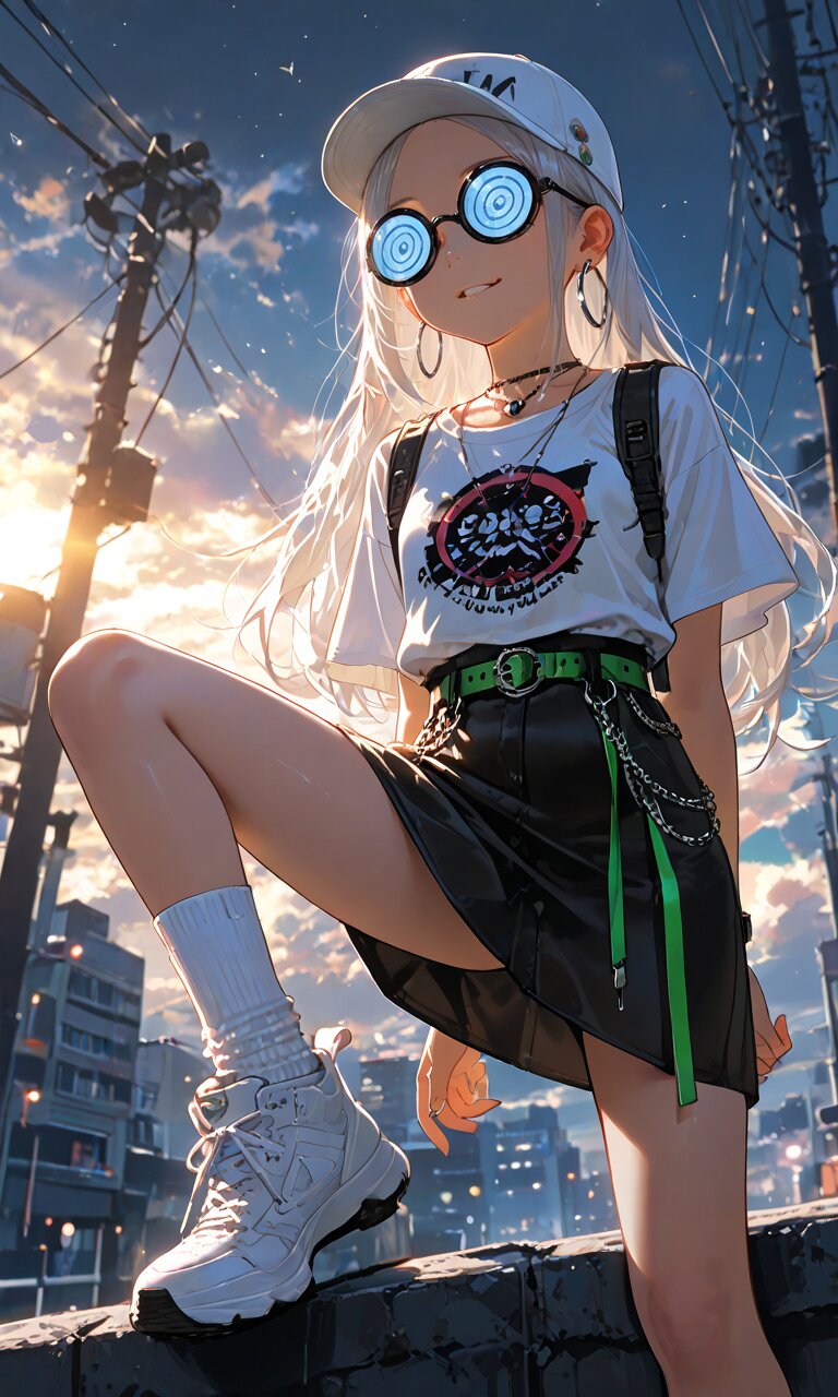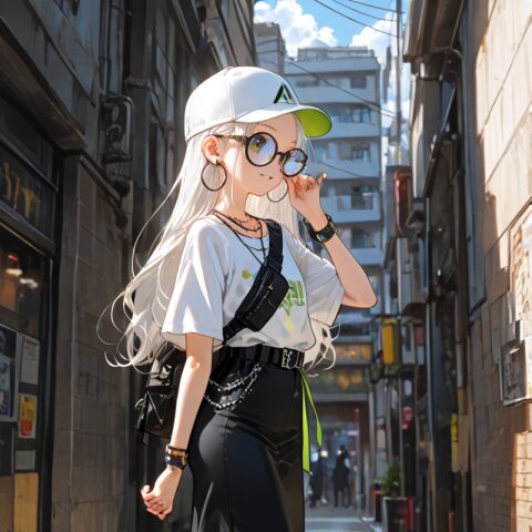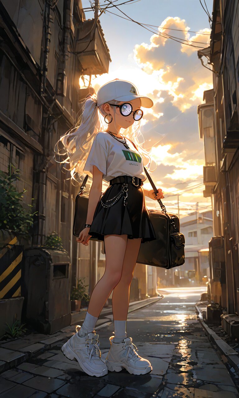 1girl with (giant glasses:1.5), cloudy glasses, long shiny hair, white hair, forehead, collarbone, (wearing a loose black and white horizontal striped short sleeve tee:1.2), the shirt is slightly tucked into (a high-waisted olive green pencil mini-skirt with belt:1.2), the skirt is made of light cotton fabric and has a casual, structured silhouette, sporty sneakers with thick white soles, socks and platform boots, white ankle socks slightly wrinkled at the ankles, a white baseball cap worn low, large round silver hoop earrings, carrying a black urban daypack with padded straps, streetwear style with minimalist accessories, necklace, walking down street, from side, flat chest, slender, (exquisitely delicate skin), beautiful small face, parted lips, light smile, kawaii, cute, BREAK (masterpiece, aesthetic quality, 8K, intricate highly detailed), perfect design, amazing quality, high quality, absurdres, highres, natural lighting, semirealistic, street view. (best quality, very aesthetic), newest, add-detail, intricate colors, vibrant colors, score_9, score_8_up, score_7_up, score_6_up, source_anime, <lora:Worldly_XL:1>