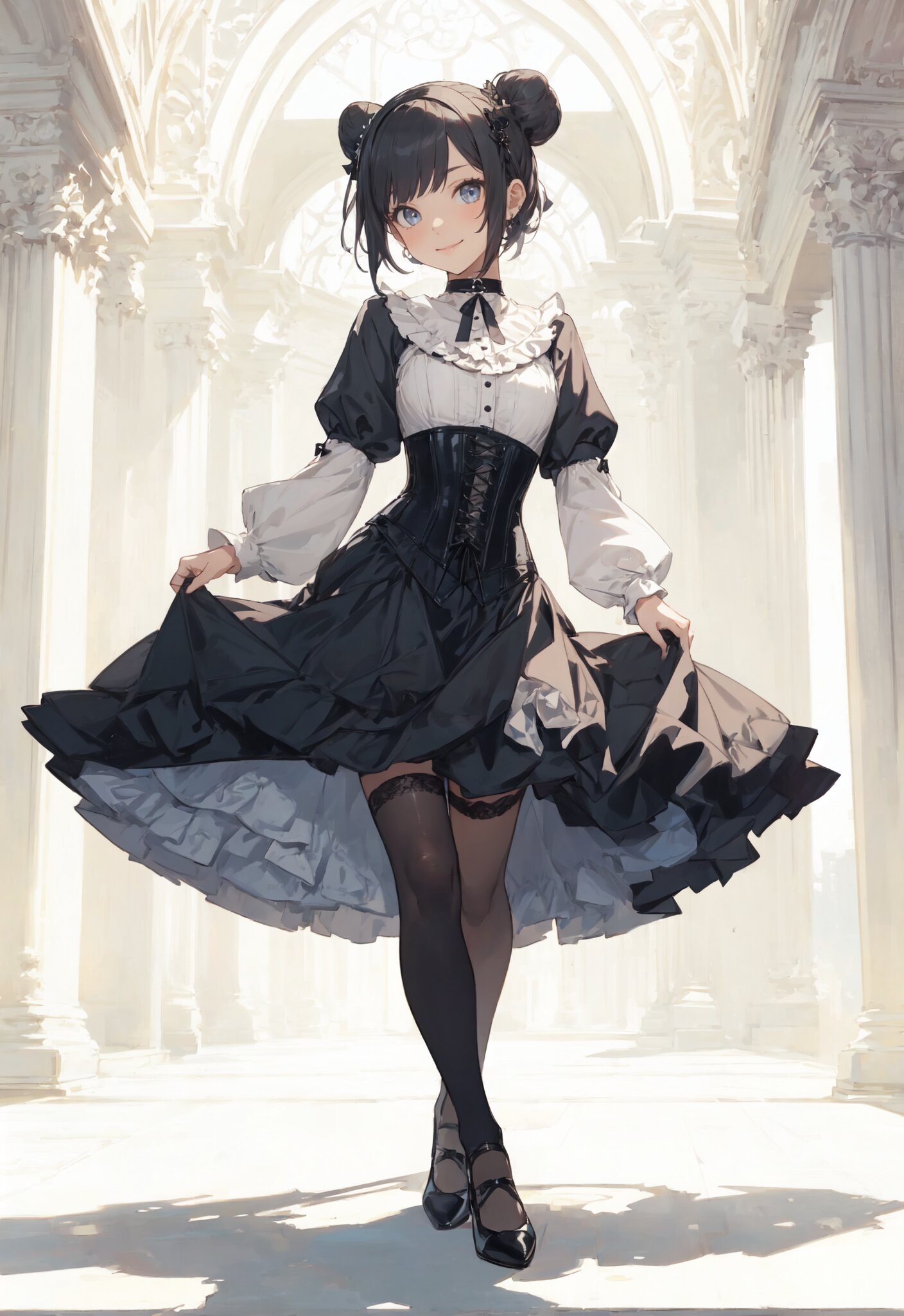 masterpiece, best quality, 1girl,pretty,gothic,Lorita,short bun hair,jumper skirt,choker,round collar,thrive,blouse,skirt,panie,corset,pumps,race socks,head accessary,black tights,full body shot,gothic reception hall,lighting,smile,look ato viewer,both side Pinch and spread widely the skirt.