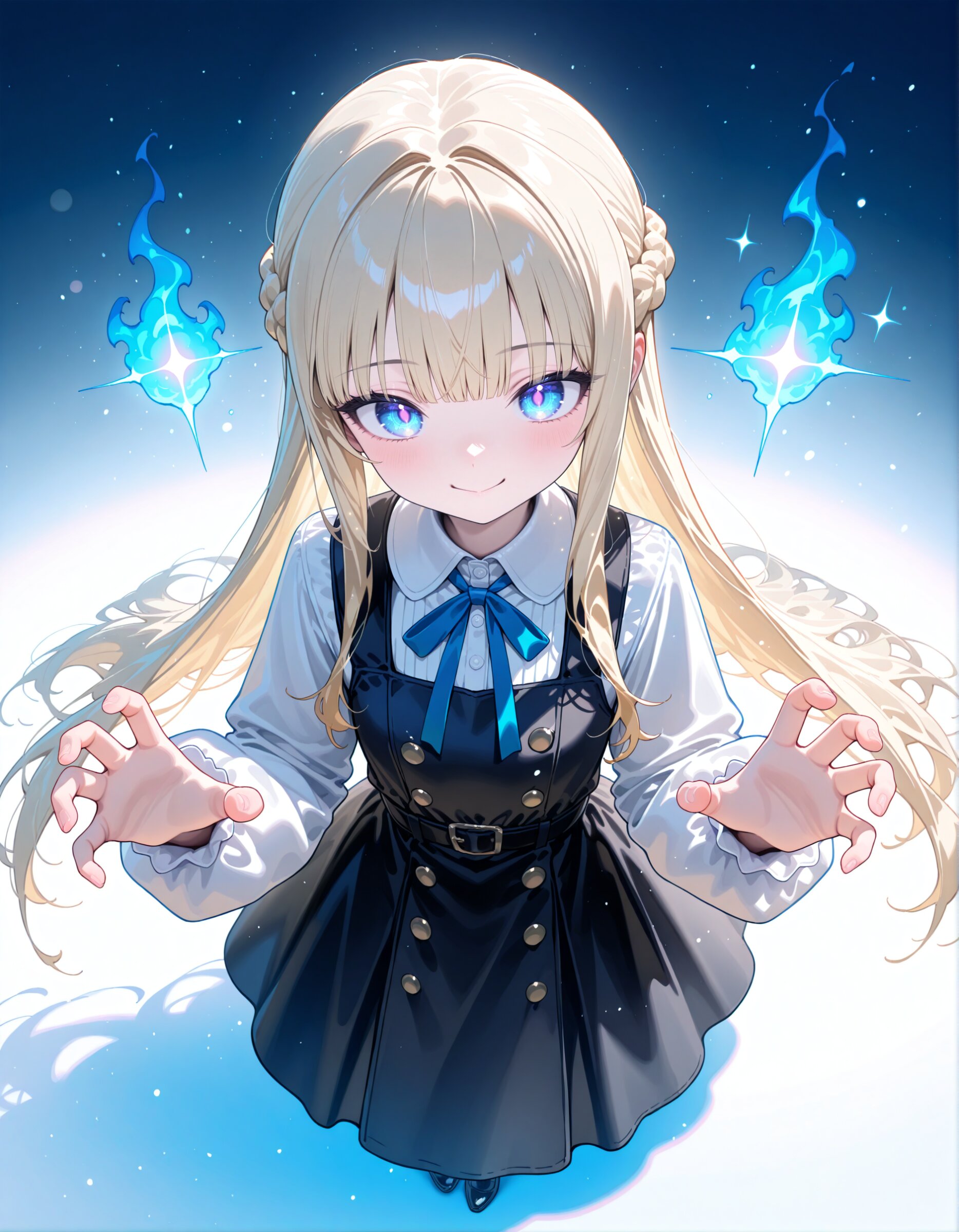 (fisheye,fisheye lens angle:1.0), aerial view, looking afar (black Pinafore dress , blue neck ribbon, white blouse, 4gold buttons, 1girl (13yo:1.1), overly long sleeves very long hair, french braid, straight hair, hime cut, blond hair, blue eyes, closed mouth smile, doyagao smile, mouth pull:1.0), (simple pastel color background:1.1), drop shadow, colored shadow, ghost pose , super fine concept art, hard surface, 8K, unreal engine, newest, masterpiece, best quality, amazing quality, very aesthetic, absurdres, professional art lots of details, , overexposure, (watercolor style:1.2), (pastel color style:0.0) 4ur4_illu,shiny, glowing, glowing particles, glowing light particles, light particles, flame lightgray, <lora:noline (1):-0.5> <lora:sdxl2-flat2-512b:0.15> <lora:facelightup_xl_v10:0.5> <lora:V2_yakumo_alchemy:0.5> <lora:Aura_illu:0.1>