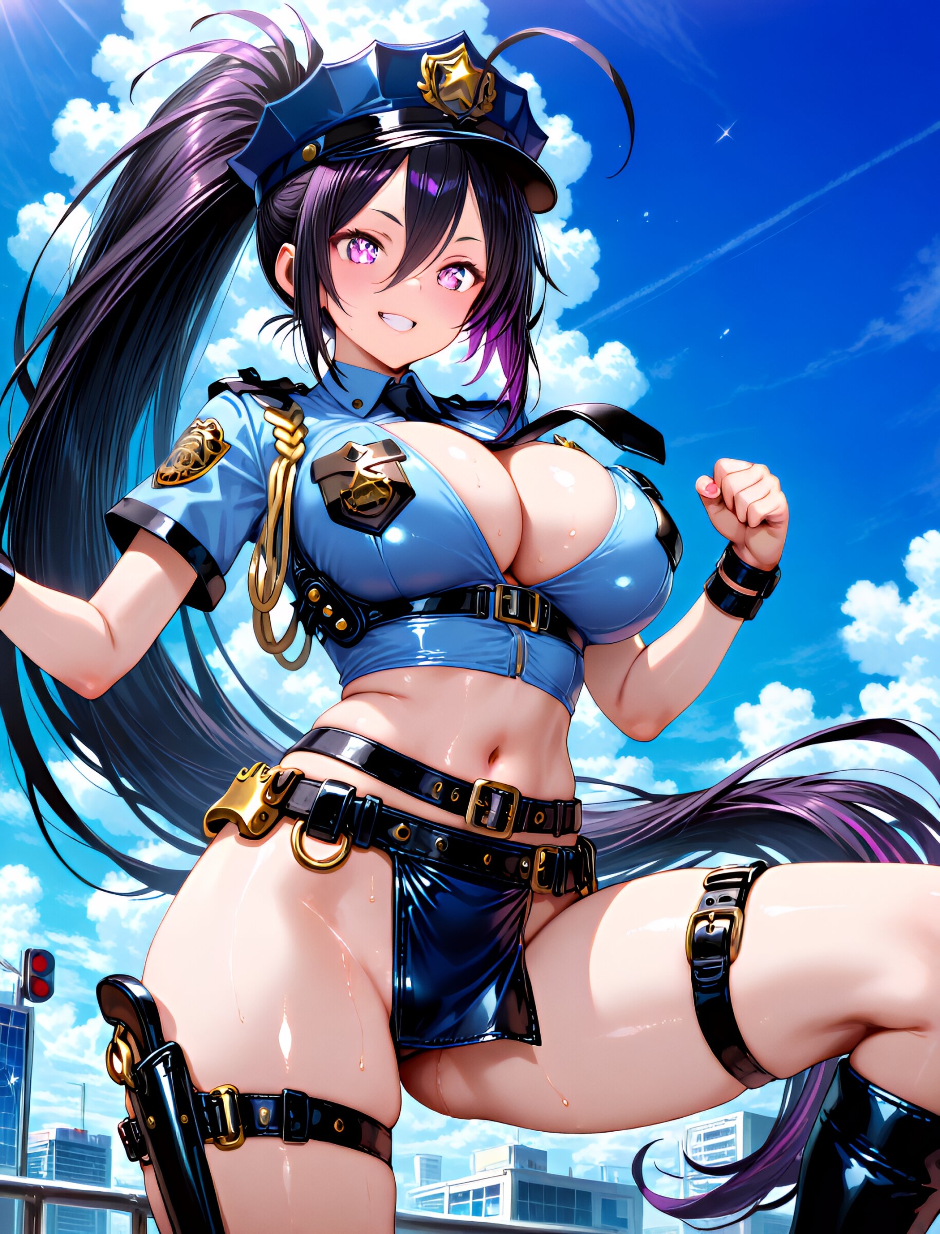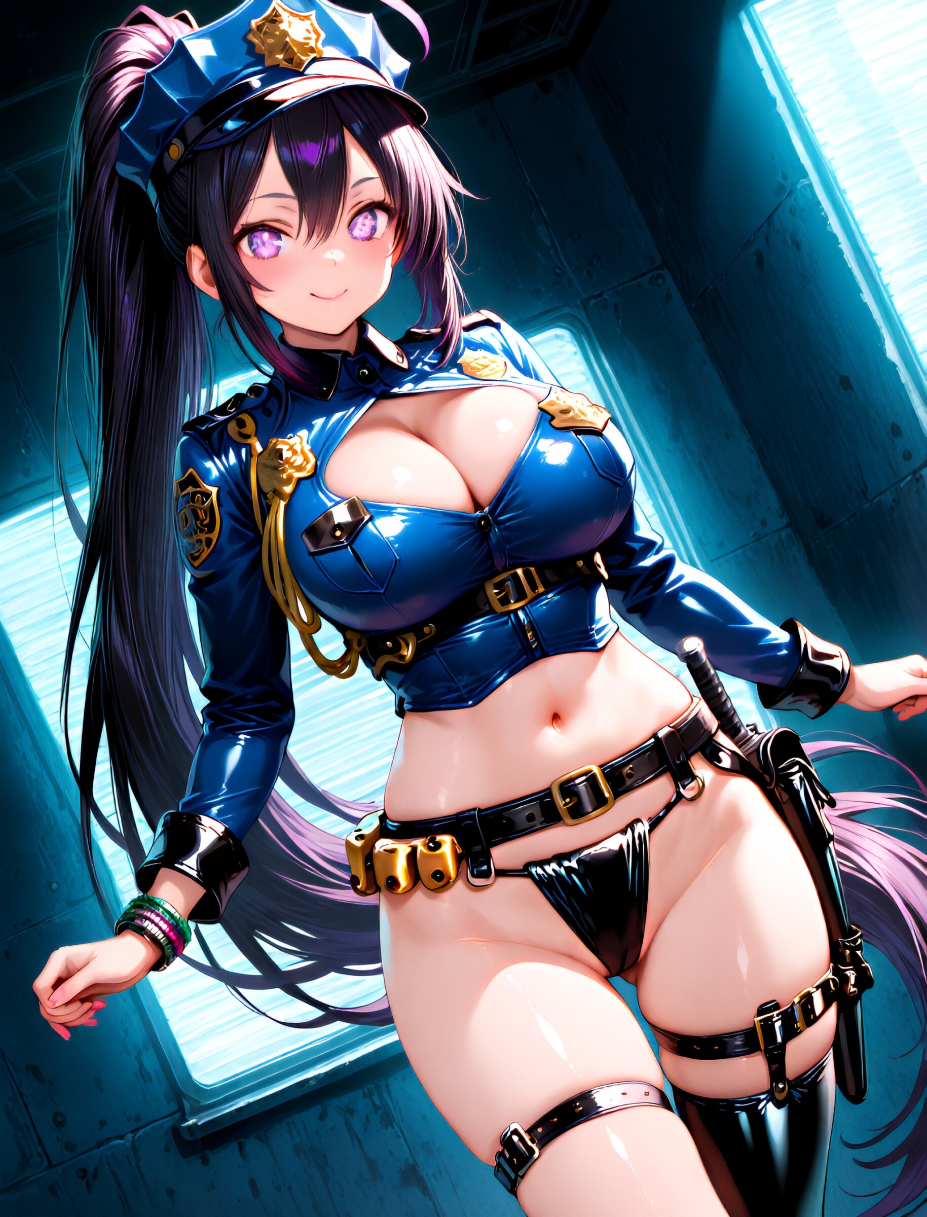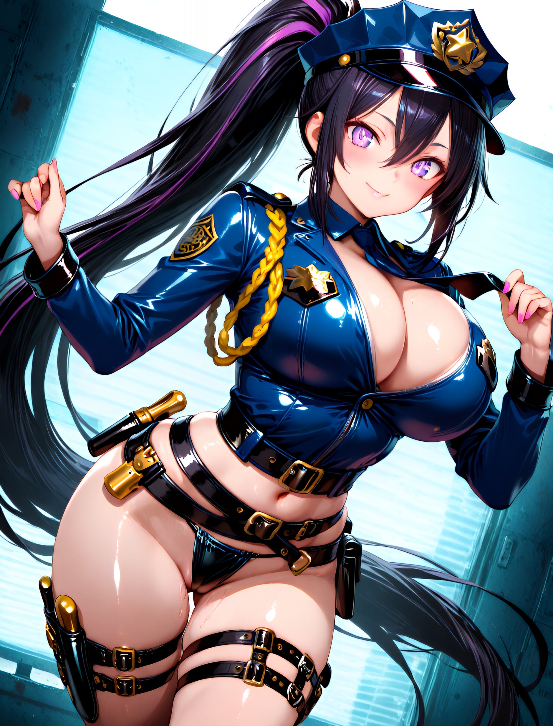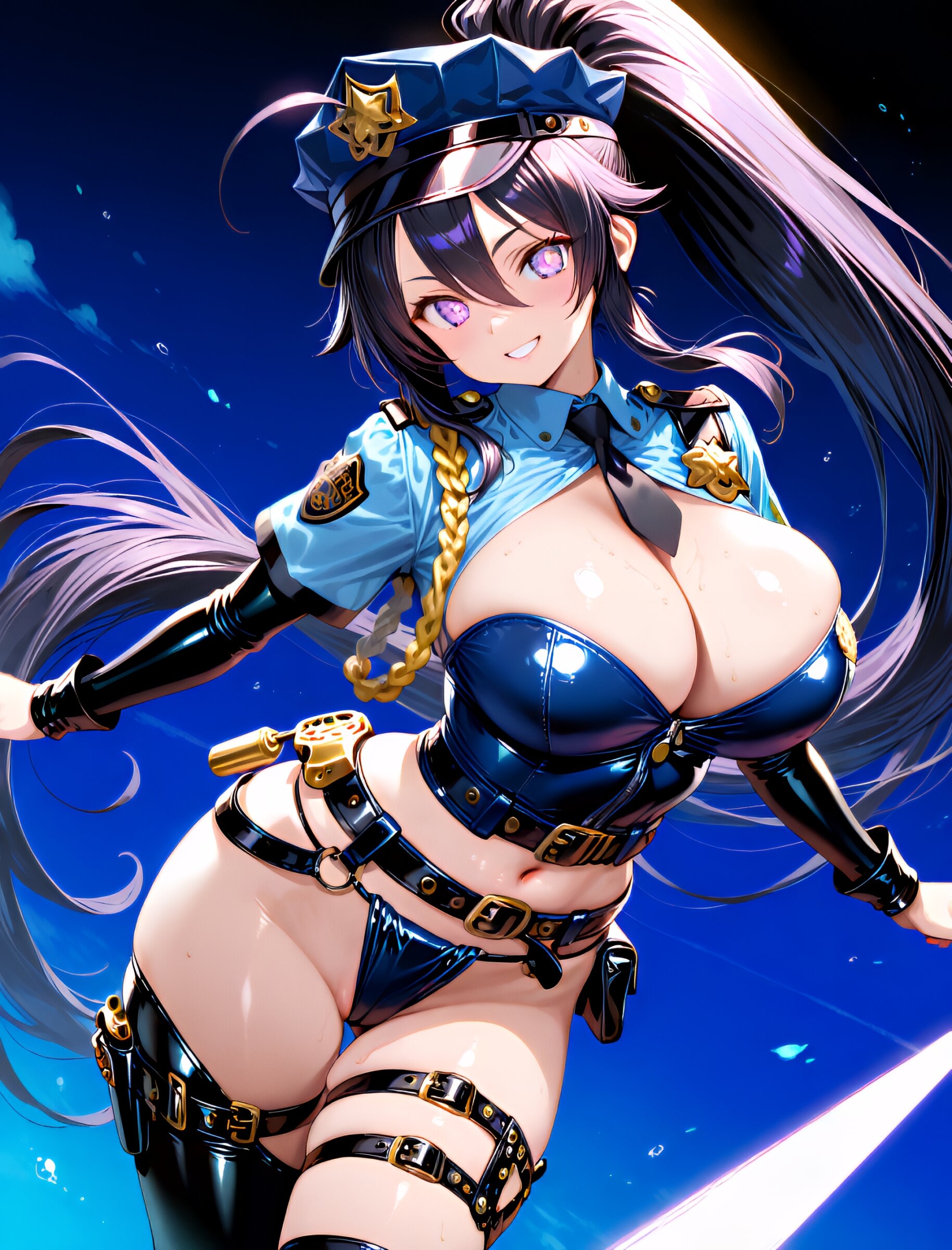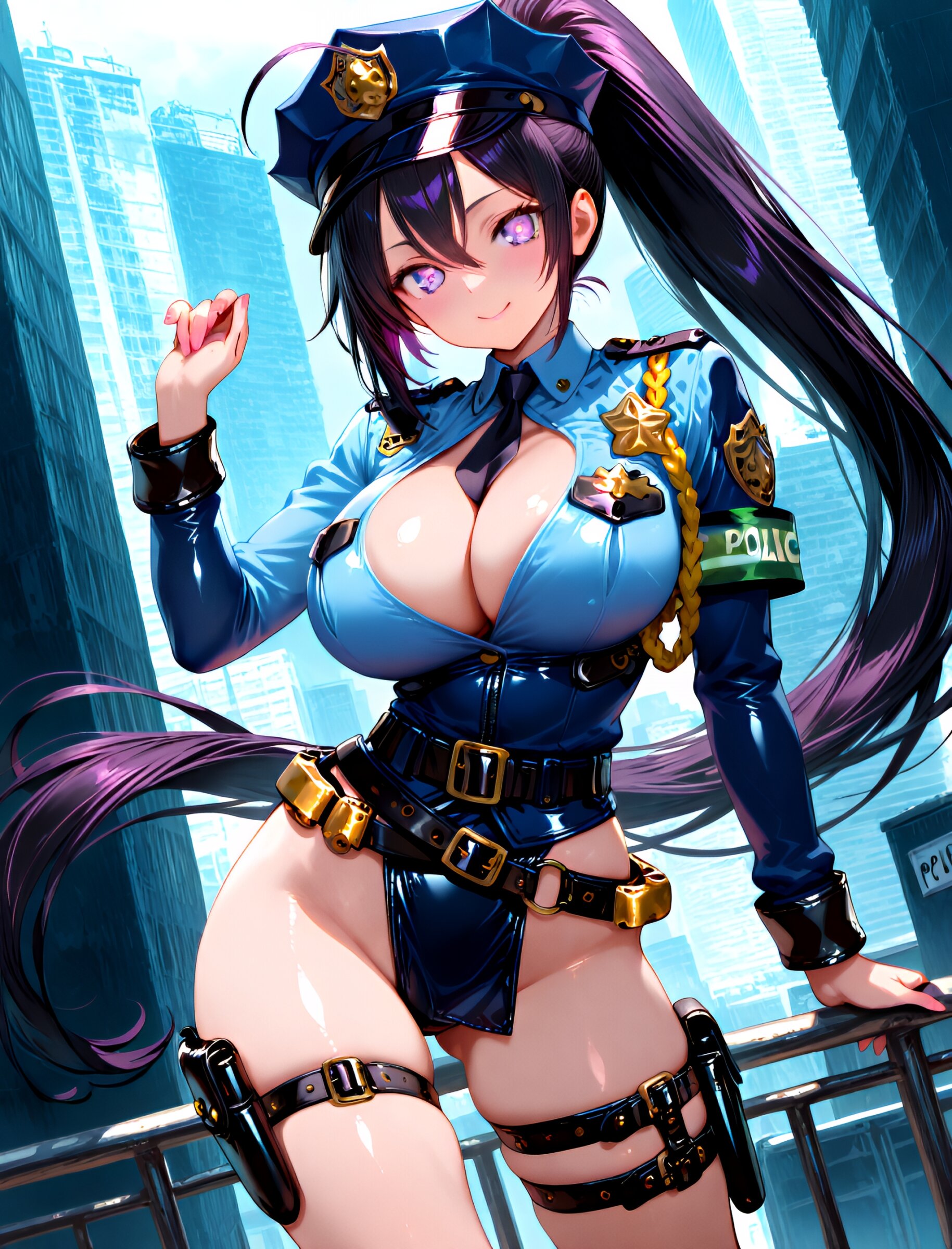 1 cute girl,(upper body:1.2),(police uniform:1.6),(smile),absurdly long black hair, ahoge, high ponytail, bangs, very narrow purple eyes, cleavage,(shiny eyes:1.2), (eyes highlight:1.4),(cap). (wide leather bands around upper thigh:1.8),( multiple buckles:2.1),large breast and hips,),(mini loincloth:1.4),navel,(multiple belts:1.8),(police patch:1.4), (masterpiece), (best quality), (8k resolution), very aesthetic, amazing quality,(dynamic angle:1.4),(dynamic pose), <lora:noobai_ep11_stabilizer_v0.11_fp16:0.7> <lora:StS-Illustrious-Detail-Slider-v1.0:2.> <lora:sdxl-hairdetailer_02:2> <lora:xl_more_art-full_v1:1.4> <lora:spo_sdxl_10ep_4k-data_lora_webui:0.7>