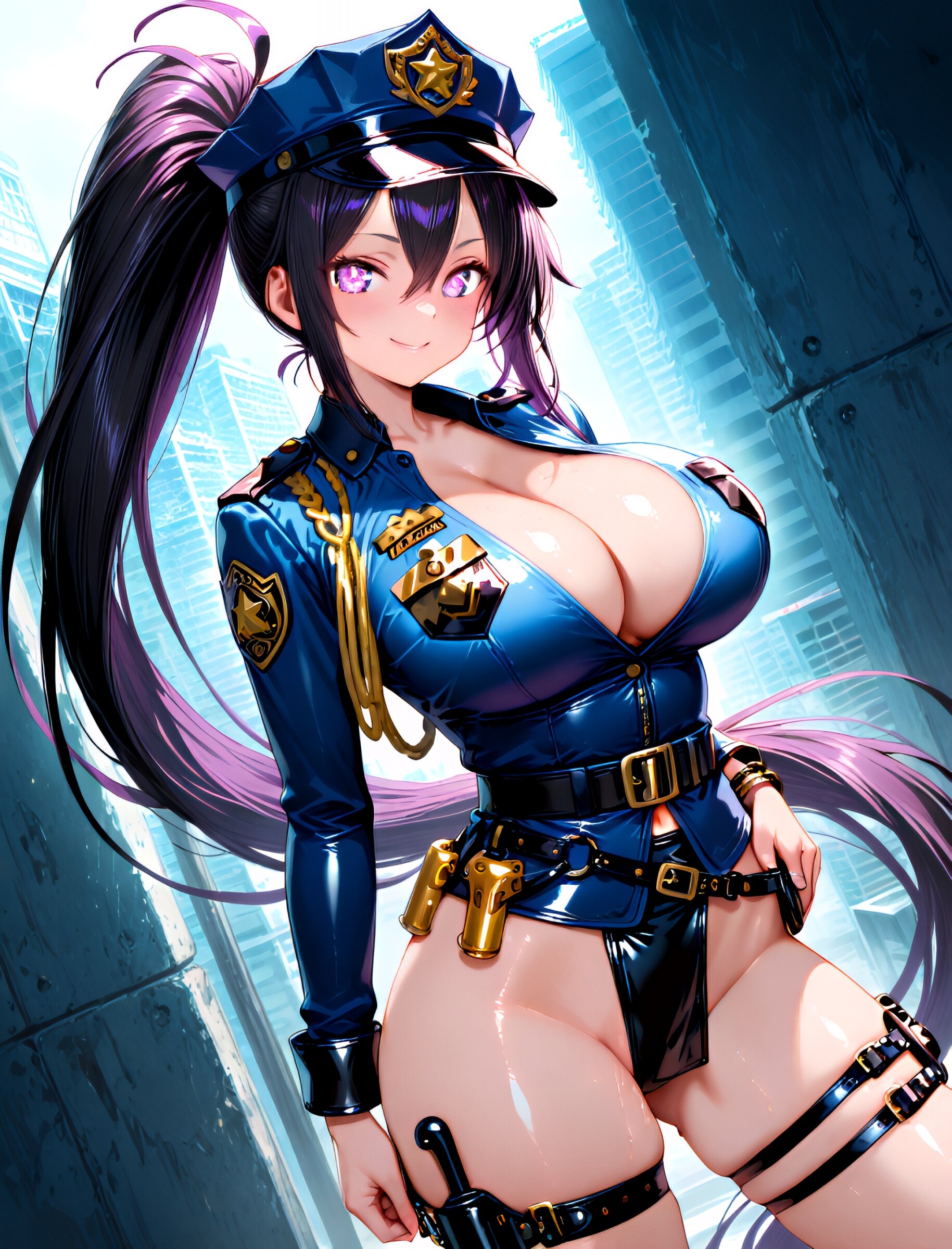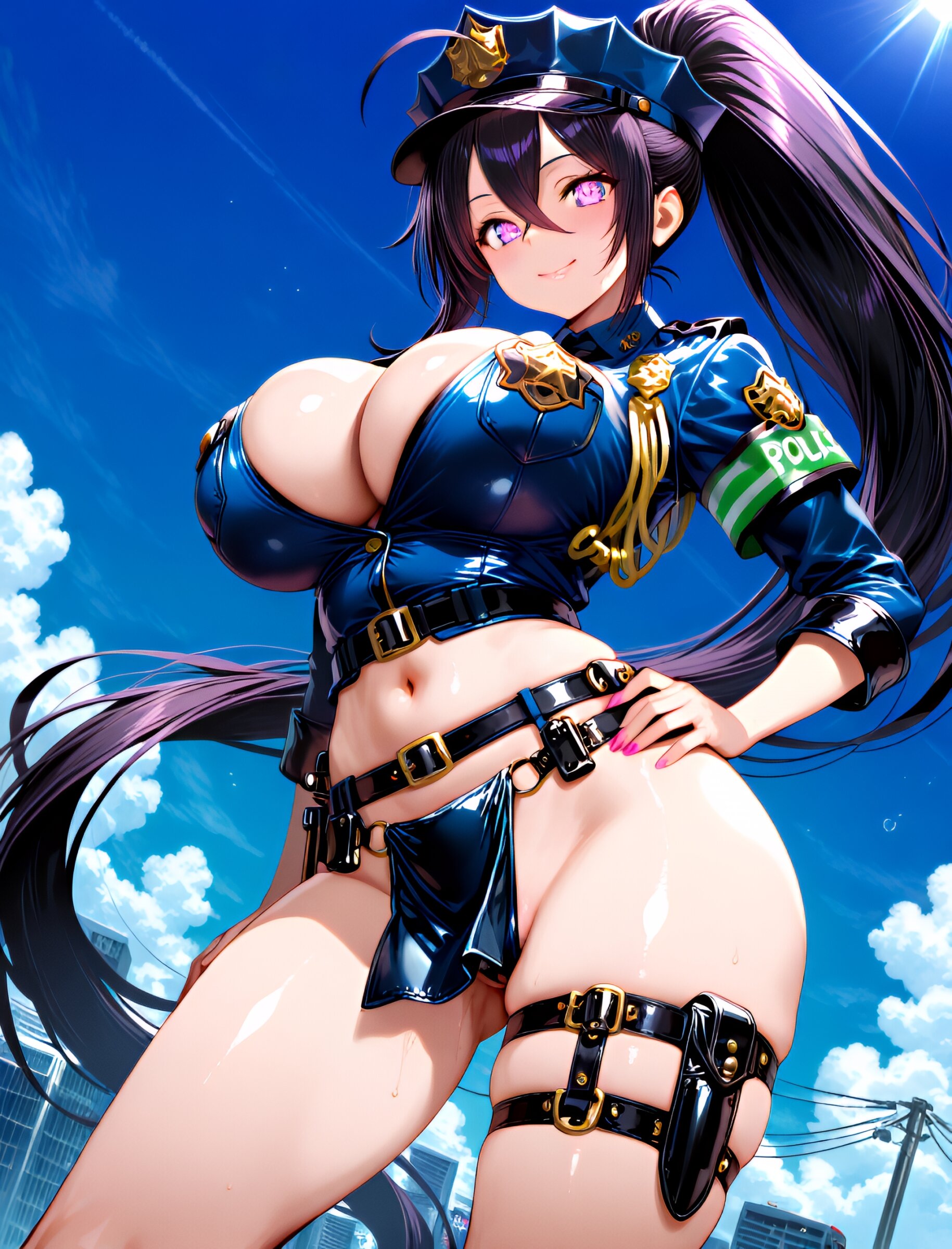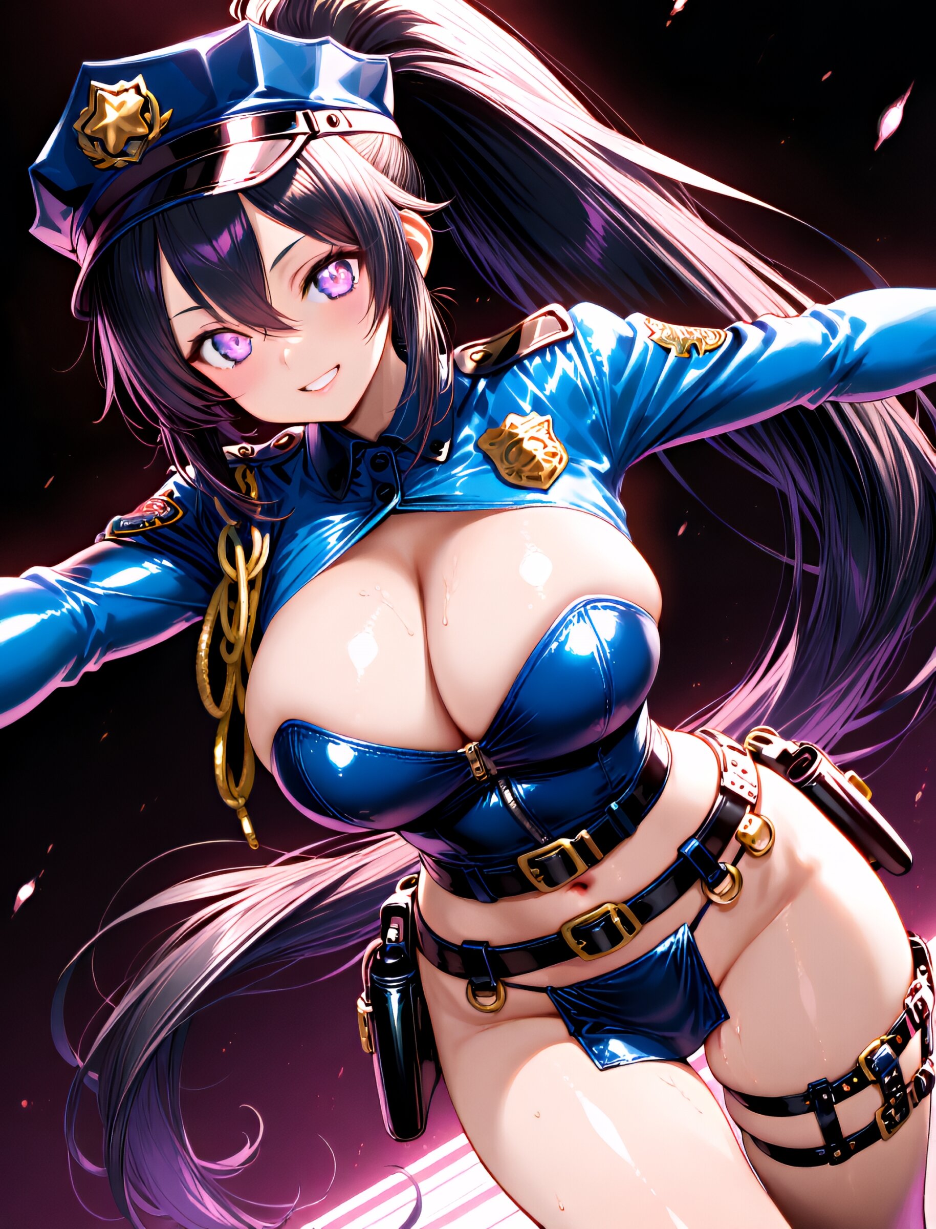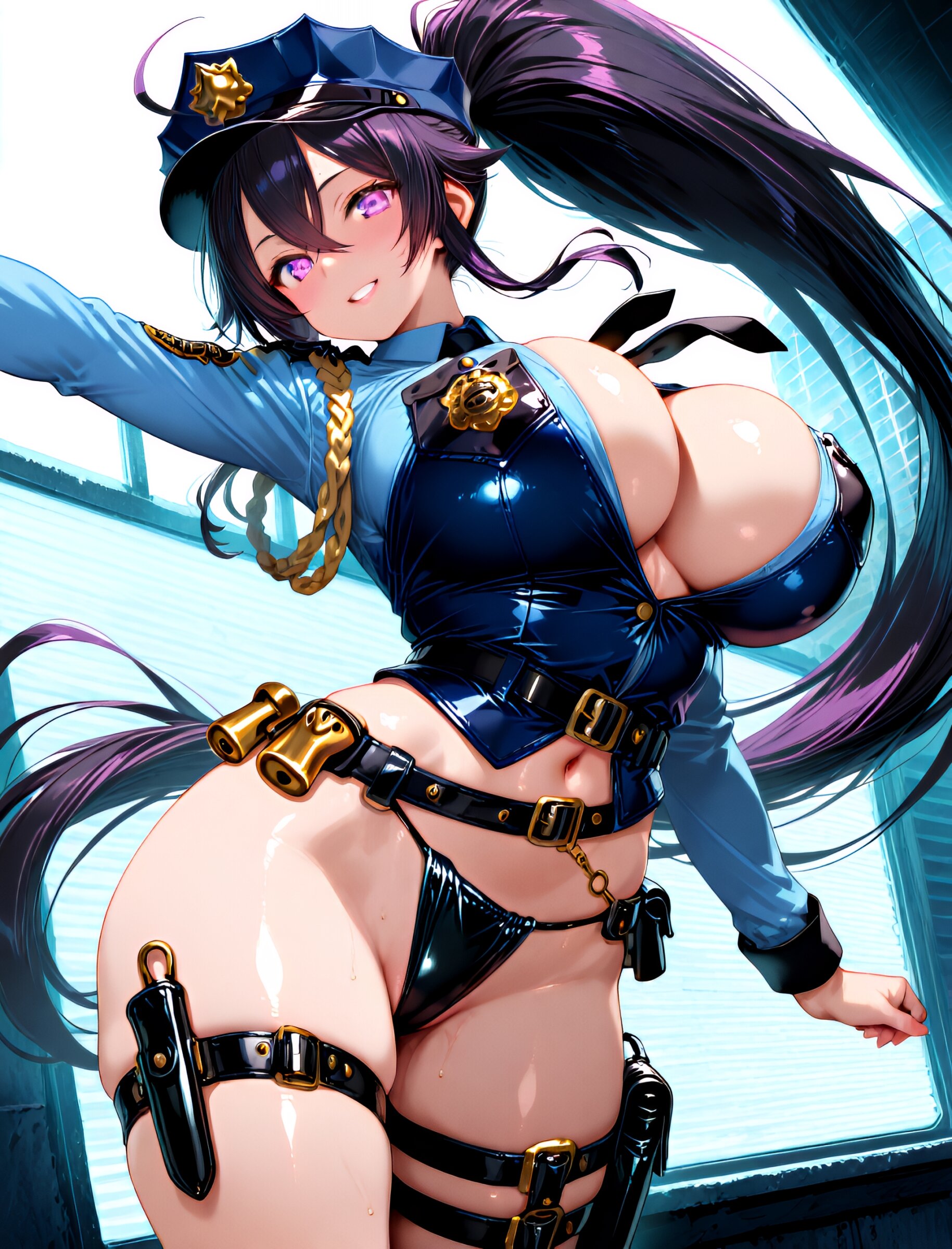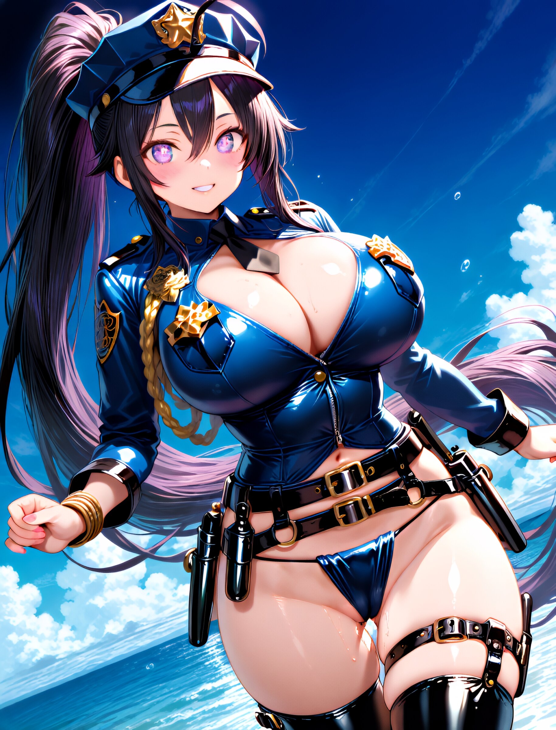 1 cute girl,(upper body:1.2),(police uniform:1.6),(smile),absurdly long black hair, ahoge, high ponytail, bangs, very narrow purple eyes, cleavage,(shiny eyes:1.2), (eyes highlight:1.4),(cap). (wide leather bands around upper thigh:1.8),( multiple buckles:2.1),large breast and hips,),(mini loincloth:1.4),navel,(multiple belts:1.8),(police patch:1.4), (masterpiece), (best quality), (8k resolution), very aesthetic, amazing quality,(dynamic angle:1.4),(dynamic pose), <lora:noobai_ep11_stabilizer_v0.11_fp16:0.7> <lora:StS-Illustrious-Detail-Slider-v1.0:2.> <lora:sdxl-hairdetailer_02:2> <lora:xl_more_art-full_v1:1.4> <lora:spo_sdxl_10ep_4k-data_lora_webui:0.7>