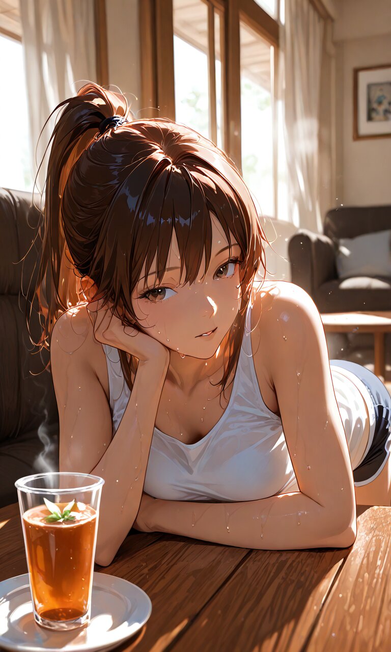 1 lady, brownhair, long ponytail, living room, (white tank top, short pants), (hot, tired, sweat), ((cold tea on table)