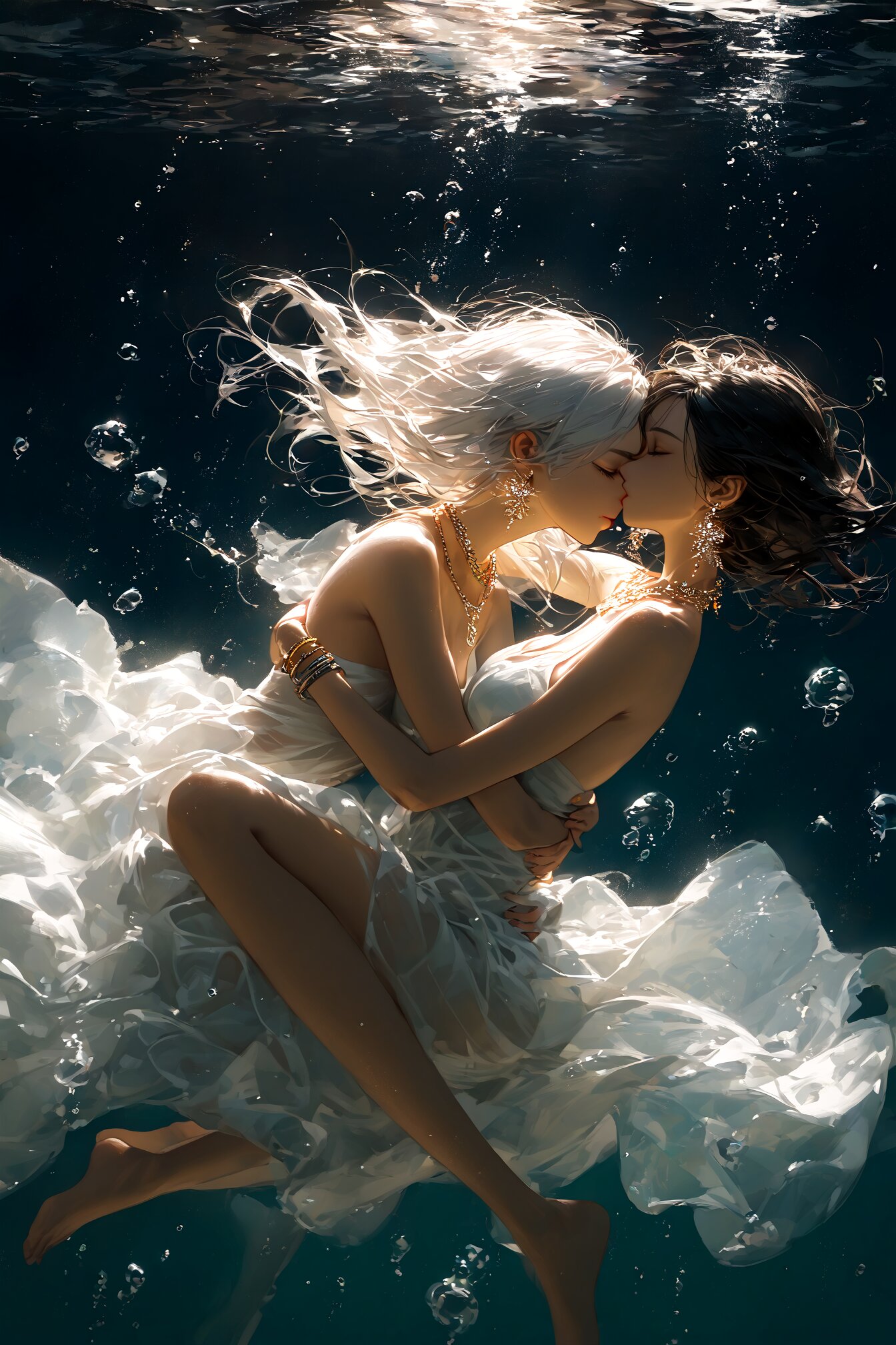 perfect anatomy, underwear, happy, hug, deep kissing, water, yuri, lesbian, 2 over 22 old women, strong light, photorealistic, floating hair, full body, bangle, necklace, earring, white hair, short hair, black hair, long hair, nude, bubble, cnv3mdde878c738thn20 under the water, underwater, under water, kissing neck, jewelry, kiss, air bubble, completely nude, realistic, barefoot, bracelet, long leg, closed eye, closed mouth <lora:Detailed anime style - SDXL_pony:0.83> <lora:StS_PonyXL_Detail_Slider_v1.4_iteration_3:1.07> <lora:drkmdatmsfXL:0.61> <lora:dark:0.66>