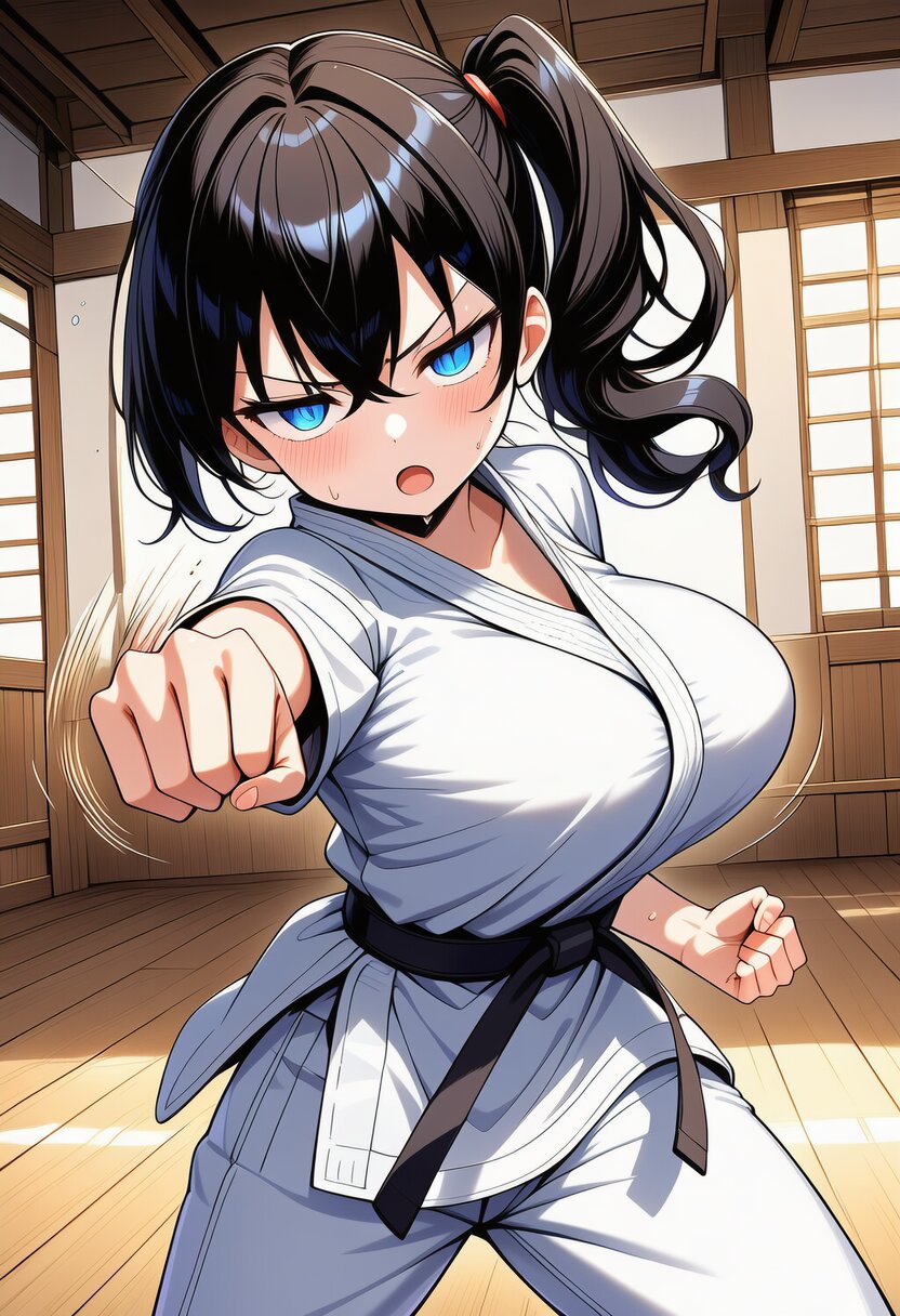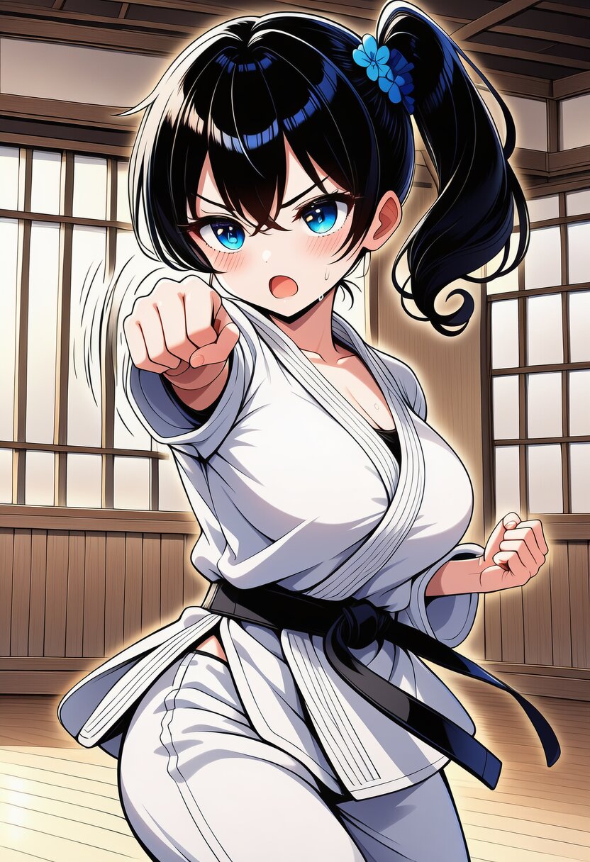 ai-generated, year 2024, 2.5::anime style::,1girl,solo,fighting action,,midday,1.0::in dojo::,dynamic angle, masterpiece, best quality, ultra detailed, perfect fingers, high resolution, absurdres, perfect anotomy, detailed background, unity 8k wallpaper