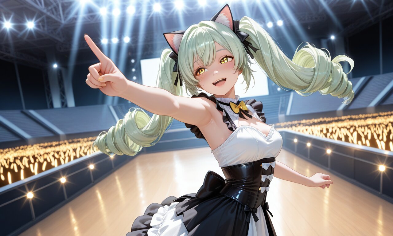 score_9, score_8_up, score_7_up, source_realistic, masterpiece, amazing quality, very aesthetic, high resolution, ultra-detailed, absurdres, scenery, 2d, semi-realistic, unity engine, moe heroine, sharp focus, nice hands, perfect hands, perfect anatomy, perfect structure, (background is A Japanese idol concert, lit by spotlights and packed with spectators), (On a Morning, the girl is dancing on stage in concert hall, gaze at me with an open mouth smile), point finger at high, outdoors, 1girl, solo, cowboy shot, from side, high angle, (She is wearing an lot of frill, white colored Gothic Lolita style Japanese idol costume). no sleeve, ultra detailed lips, ultra detailed face and hair, kawaii, adorable, cute, very young, 1girl, ((yellow sapphire eyes with radiance)), (light green hair:1.2, long, multi-drill hairstyle), cat ears, medium breasts, wide hip, Fluttering clothes and flowing hair. BREAK, masterpiece, best quality, amazing quality, very aesthetic, high resolution, ultra-detailed, absurdres, scenery, <lora:sdxl_neg_overfit_v1:0.7> <lora:Elf-san alpha7(IL2.0):0.7> <lora:elf-san alpha1:0.7>