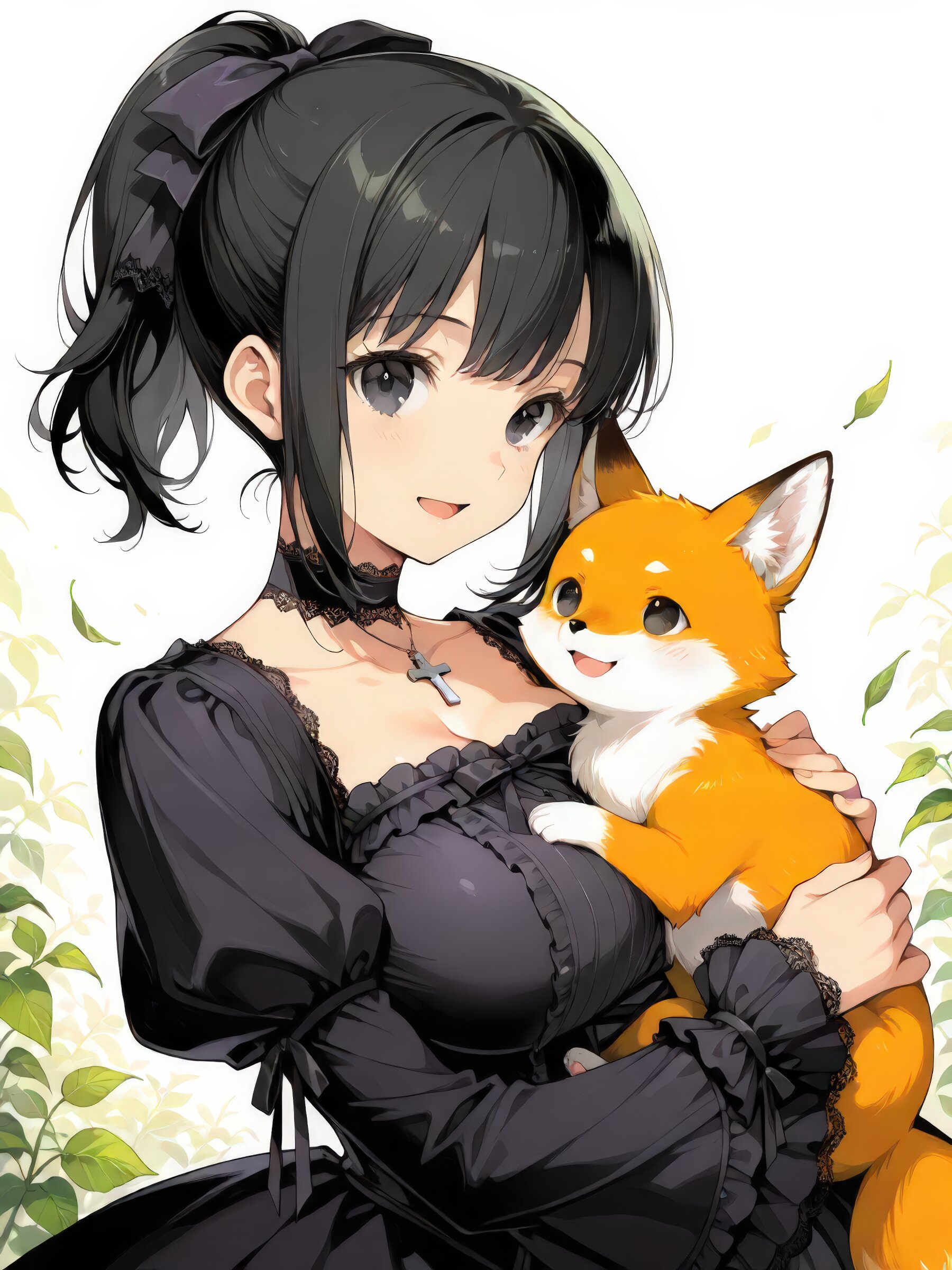 Best quality, Masterpieces, simple background, lots of negative space, anime-style illustration, fine detail, (young girl), cute face and eyes, big breasts, black hair, clear black eyes, single short ponytail hair, cute and lovely, Vigorous, lively, and spontaneous personality, dark gothic lolita outfit, black lace and satin, bat motifs, choker with cross pendant, ribbon accents, frilly cuffs, gloomy elegance, pensive, cute fox cub hug, botanical background, soft green leaves, minimal natural design, white background, calm atmosphere, cinematic angle, official wallpaper, smile, open mouth