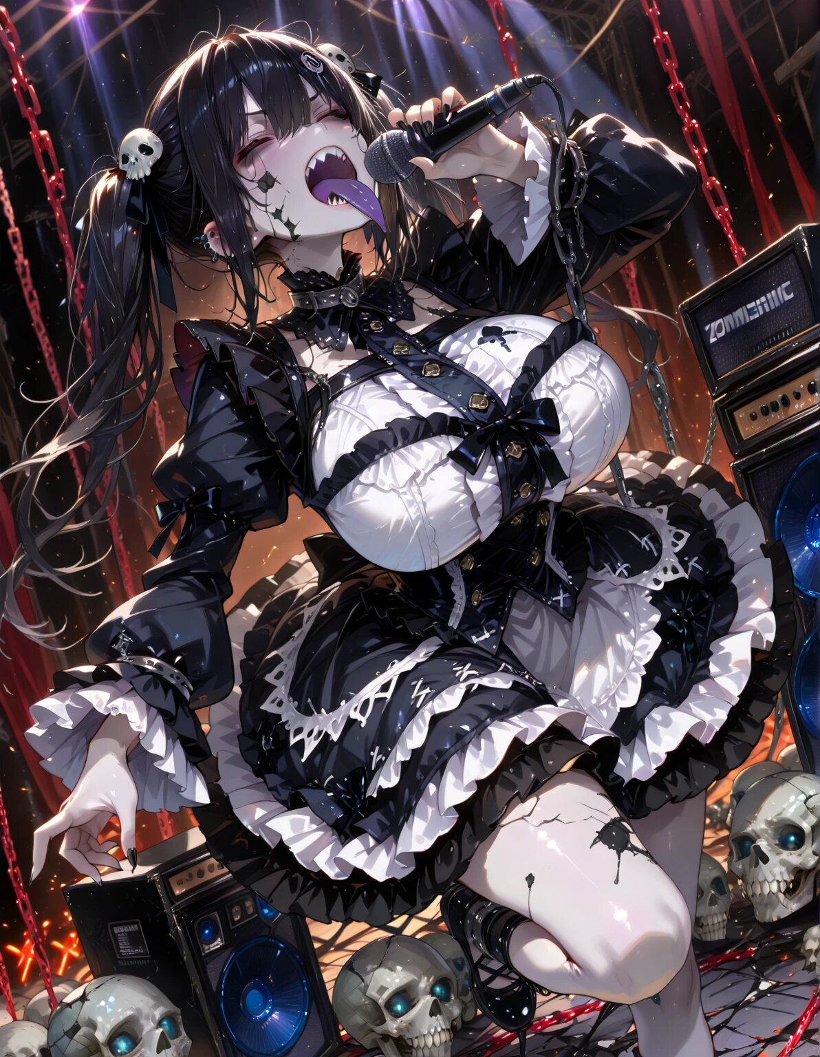 on stage,dark,dynamic lighting,many skulls on ground,1girl,dynamic angle,solo,(zombie lady),((pale skin)),black hair,twintail hair,messy hair,many ear piercings,silver skull hair ornament,giant black ribbon,gothic makeup,open mouth,cracks on face,hungging out long tongue,purple tongue,sharp teeth,frilled gothic dress,huge breasts,many stitch on skin,chain accessories,sharp nails,speaker,(singing,shouting),((masterpiece,best quality,extremely detailed,absurdres)),