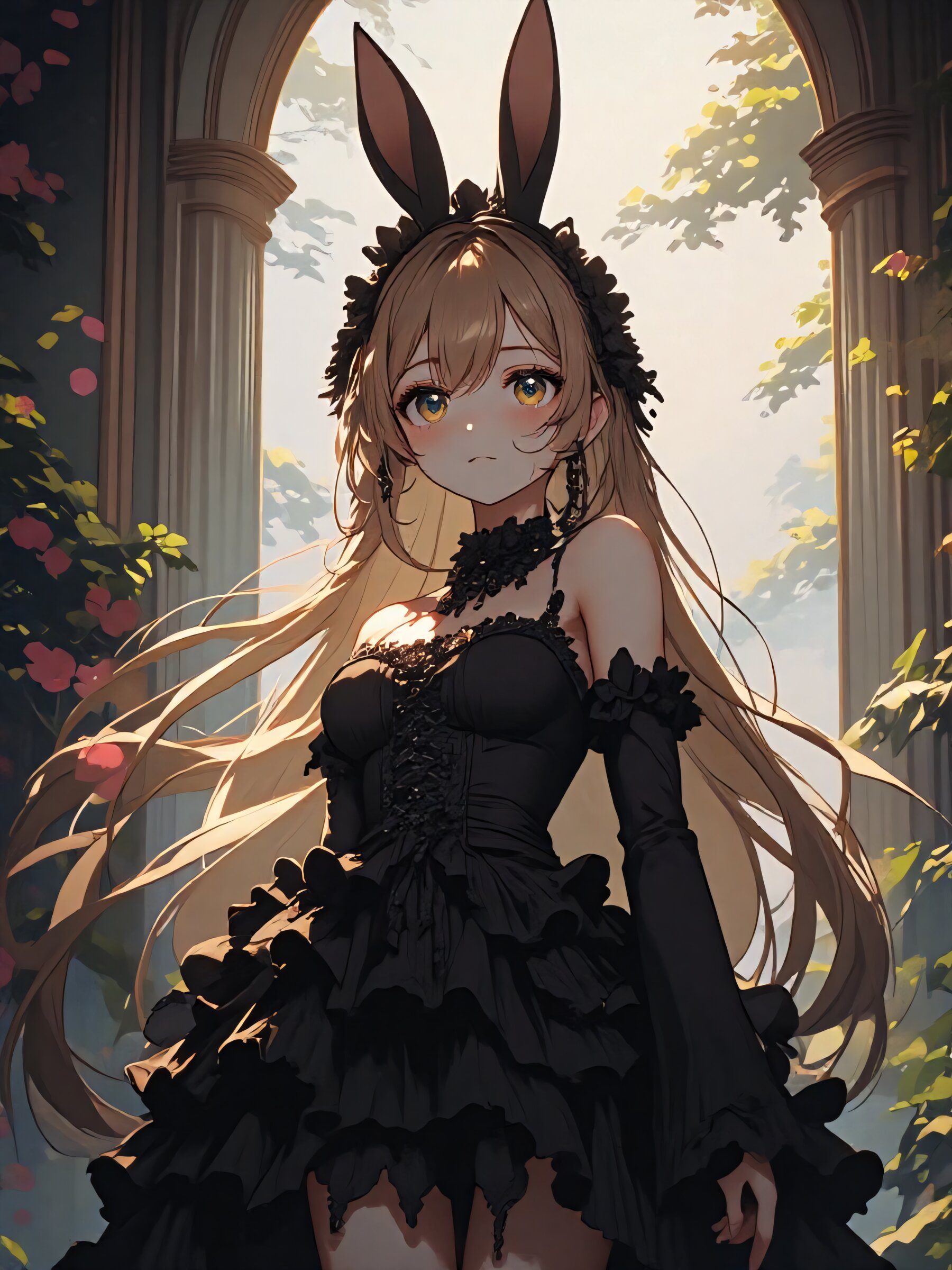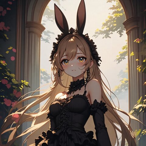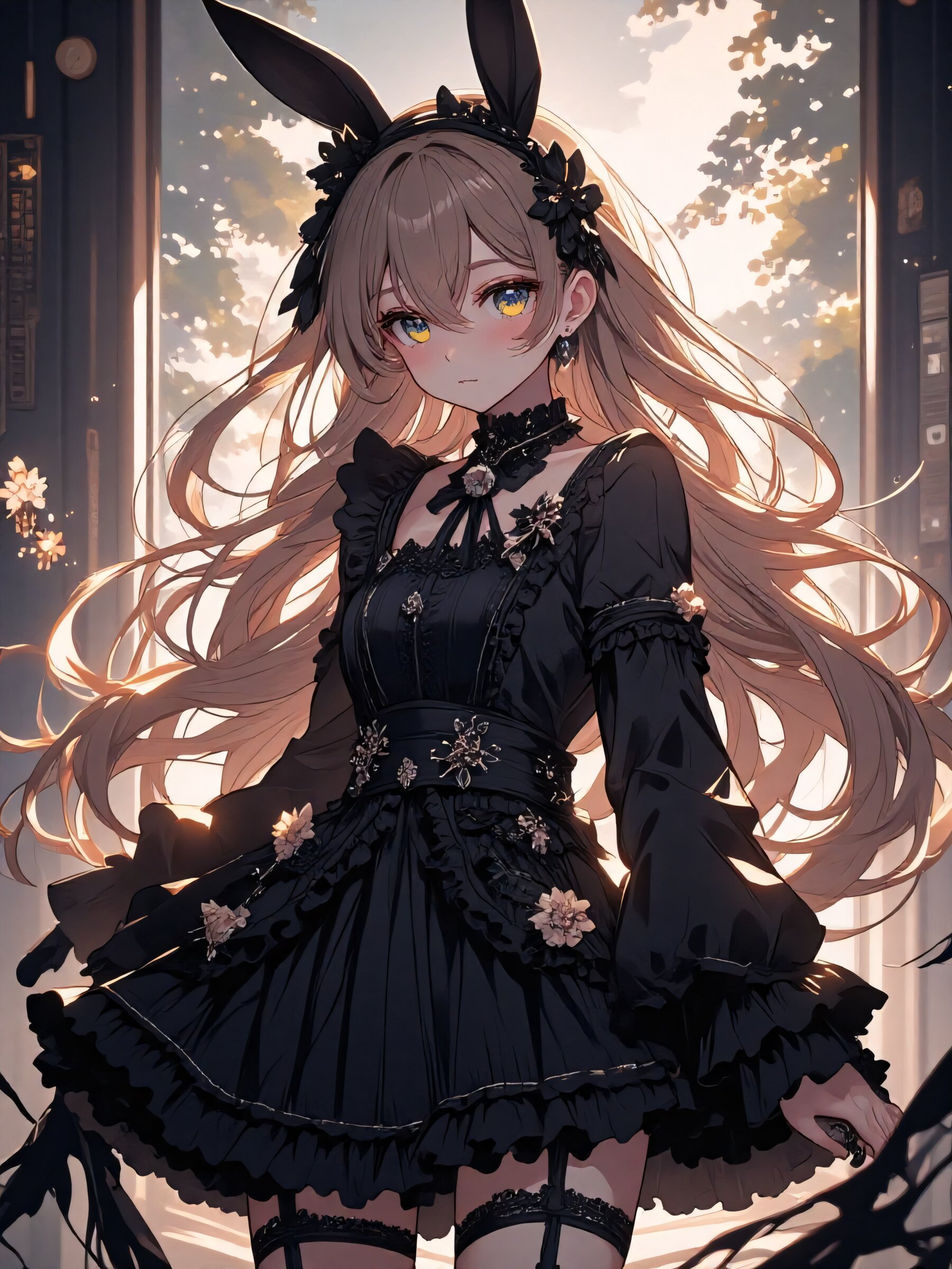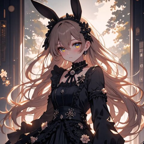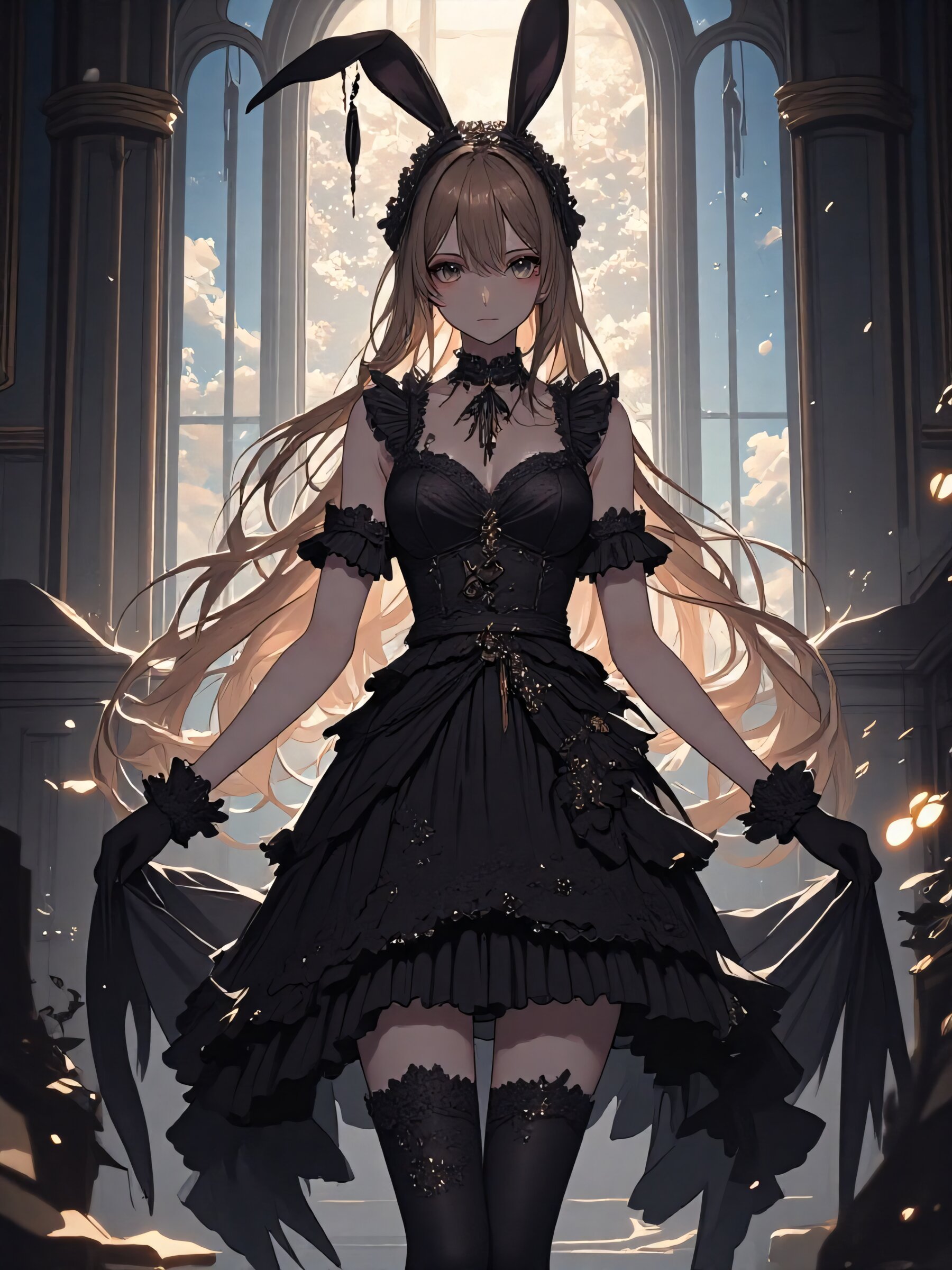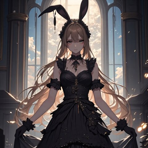 anime style, full-body, , long light brown hair flowing elegantly, , wearing an intricate gothic lolita outfit adorned with abundant frills and lace, (black bunny ears headband:1.5), standing gracefully in a softly lit, vintage-inspired setting, delicate ambient lighting enhancing the mysterious yet elegant atmosphere, cinematic composition, visually captivating aesthetic