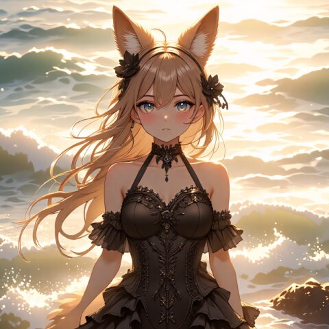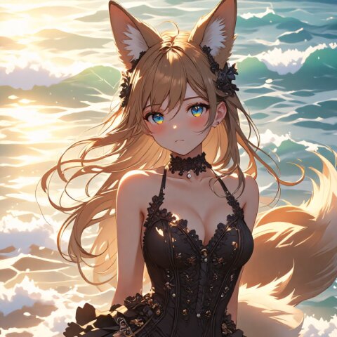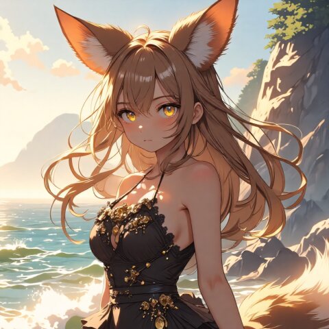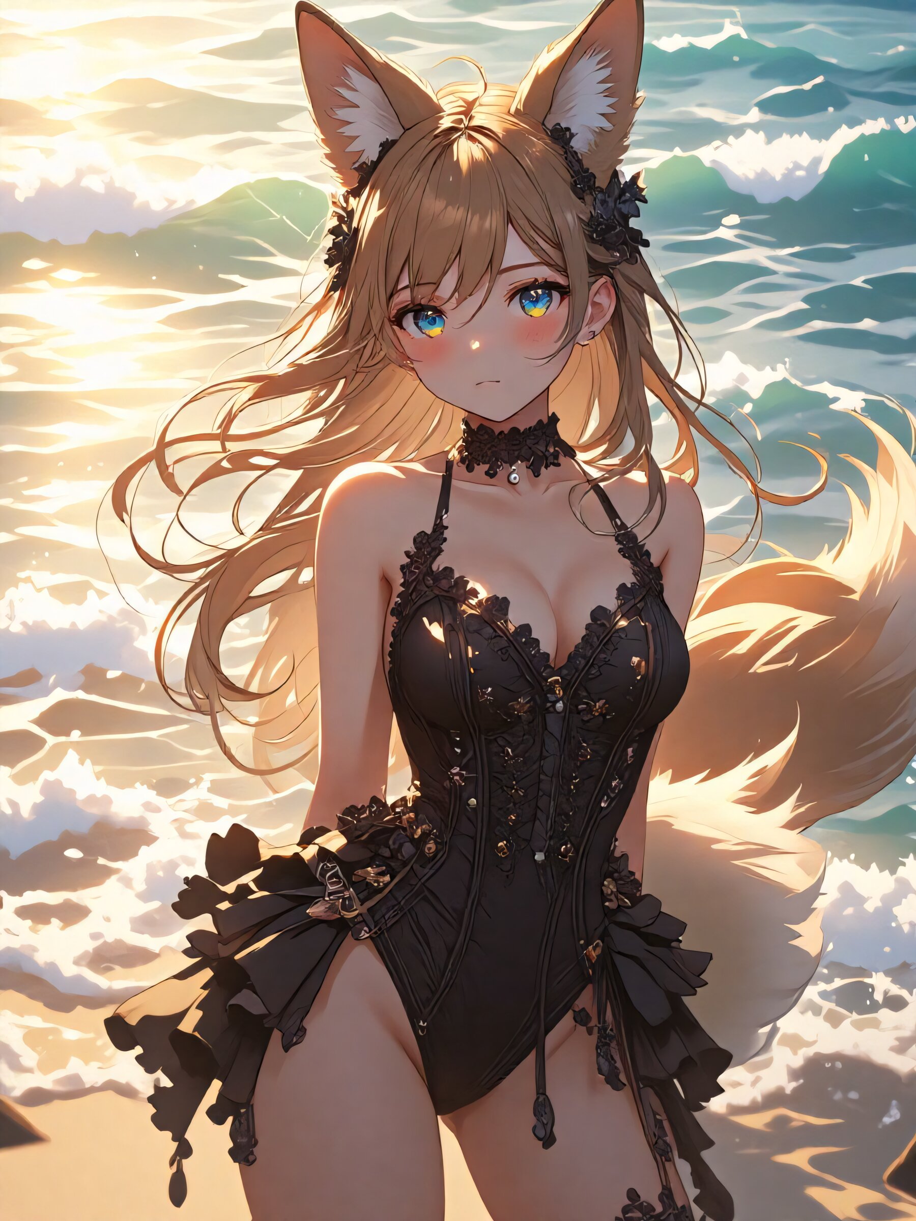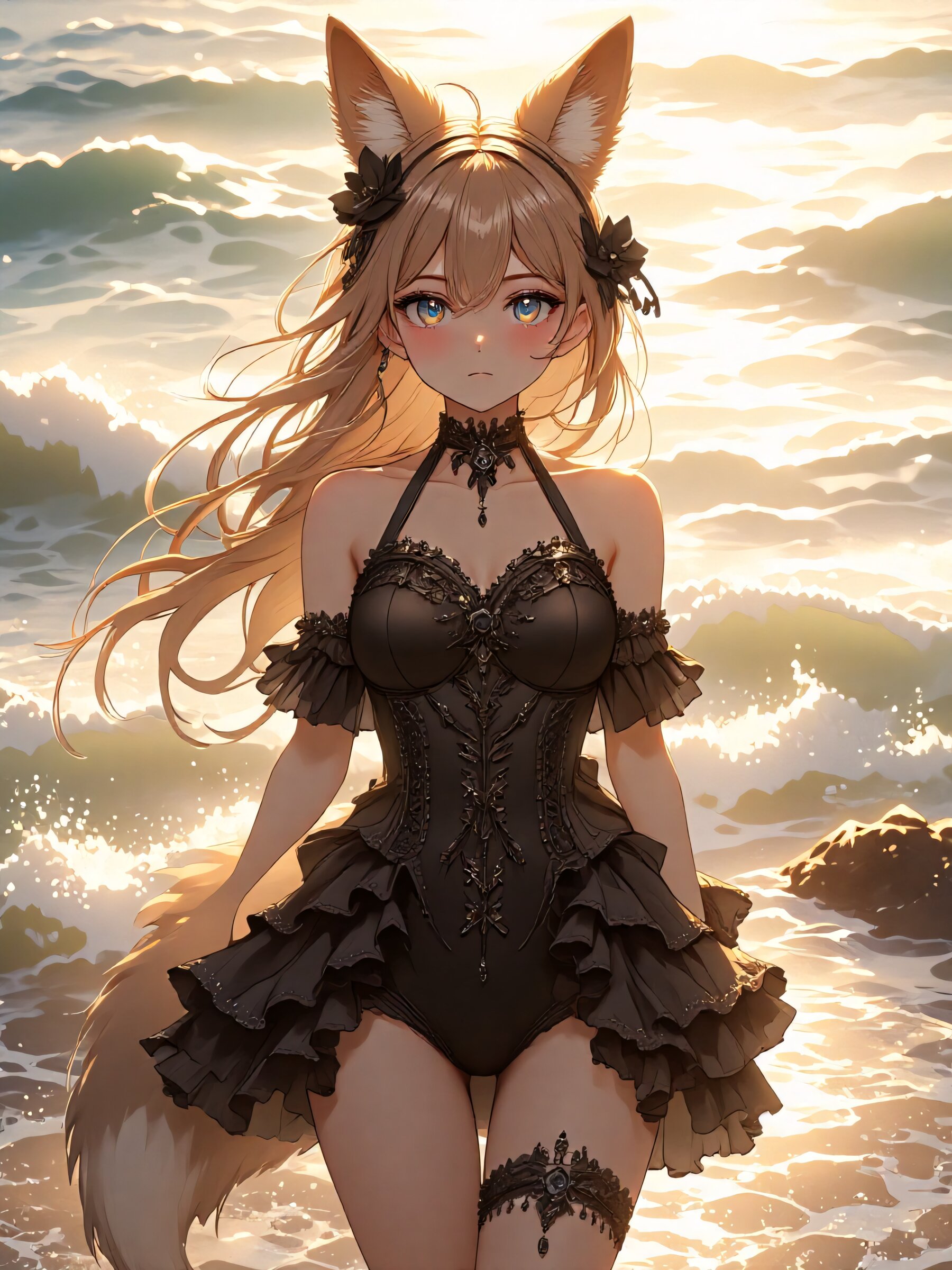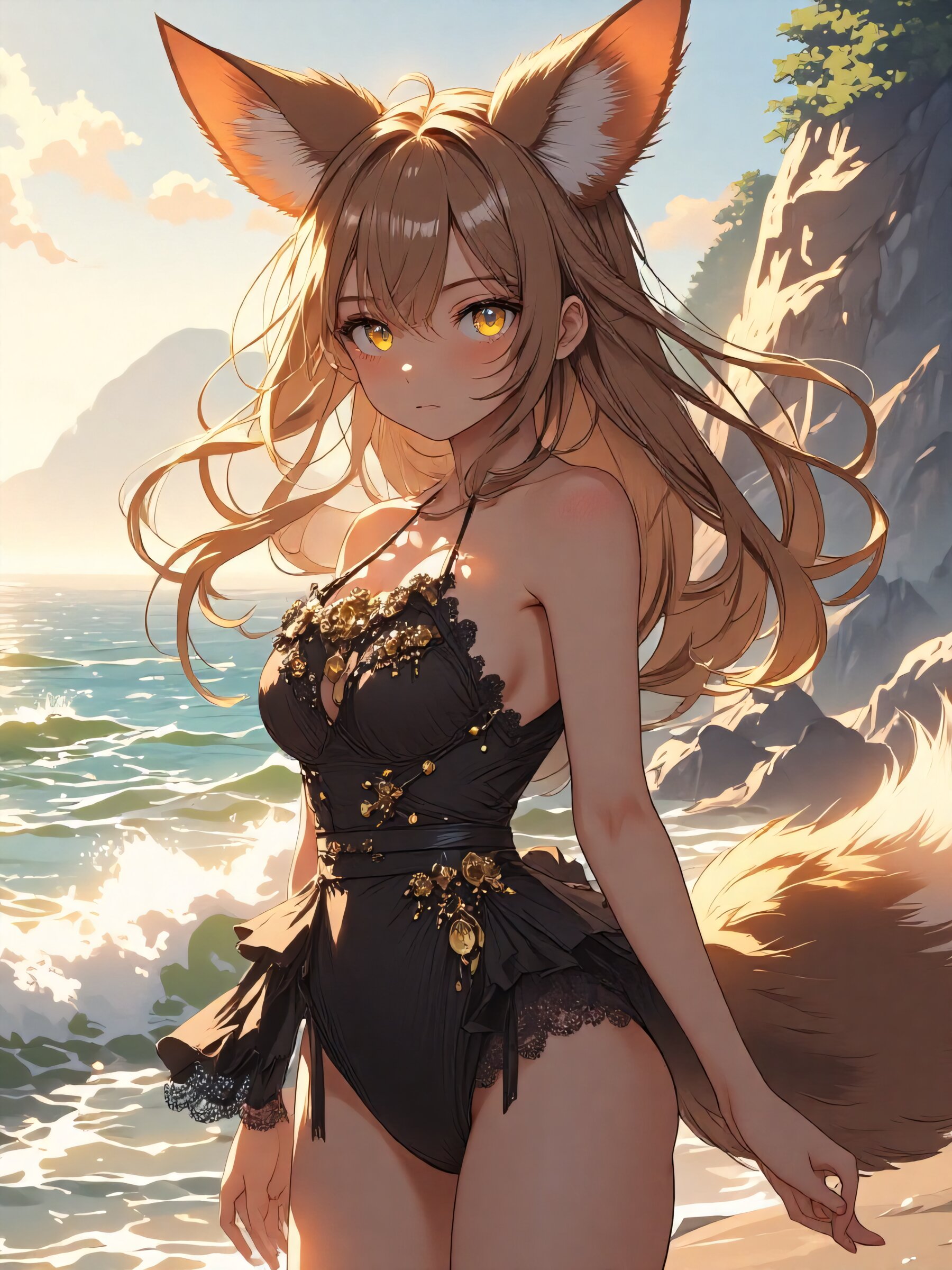 anime style, full-body, fox-eared girl, long light brown hair flowing elegantly, fluffy fox tail swaying gently, wearing an intricate gothic lolita swimsuit adorned with abundant frills and lace, standing gracefully by the seaside, soft ocean breeze moving her hair and tail, warm sunlight casting a dramatic glow, sparkling waves in the background, serene yet playful atmosphere, cinematic composition, visually captivating aesthetic