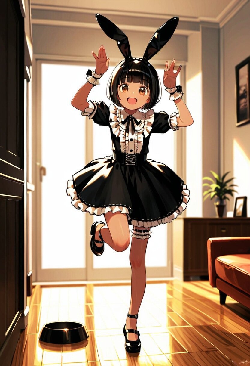 (score_9, score_8_up, score_7_up), detailed skin, rich contrast, (character outline), standing, living room, messy room, BREAK (cute, female child, 11 yo),brown eyes, black hair, (bowl cut, blunt bangs),((one-piece tan:1.15)),smile,open mouth, rabbit pose,leg up, (gothic lolita:1.25), black clothes,frilled mini skirt, bunny year, black garter ring,
