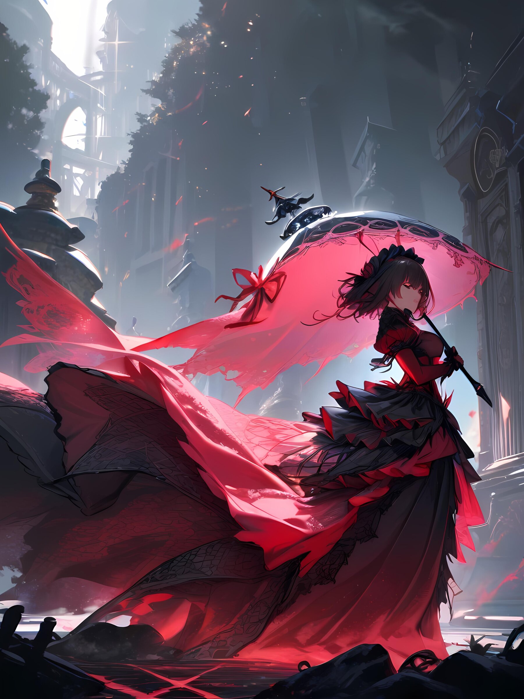 gothic lolita girl, black and red dress, intricate lace patterns, velvet fabric, holding parasol, misty graveyard, cinematic lighting, cowboy shot