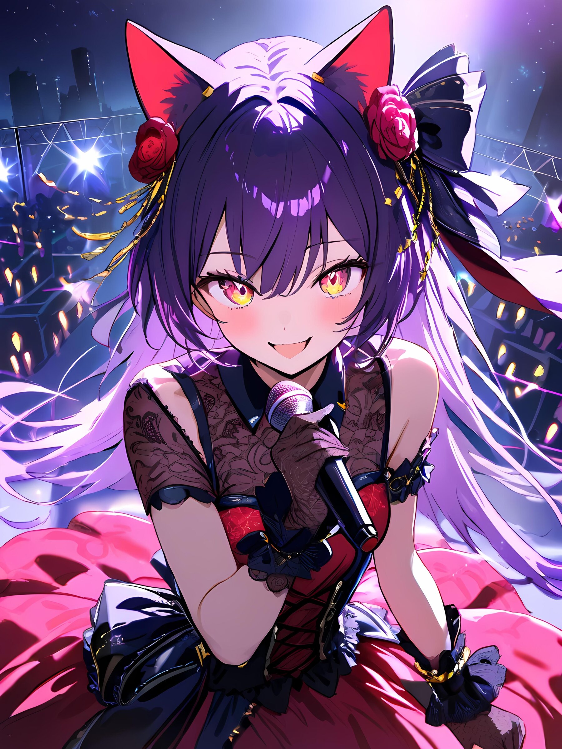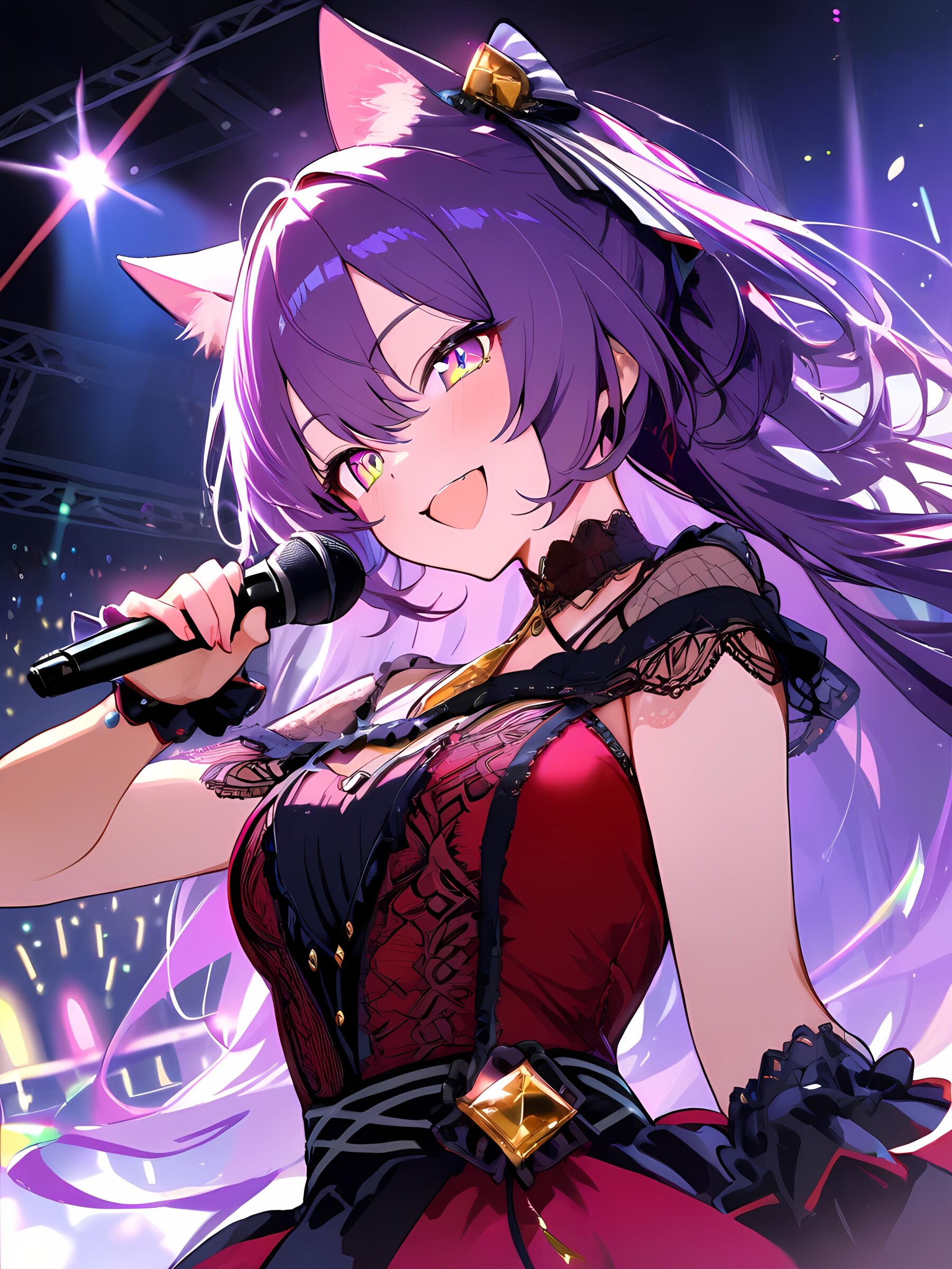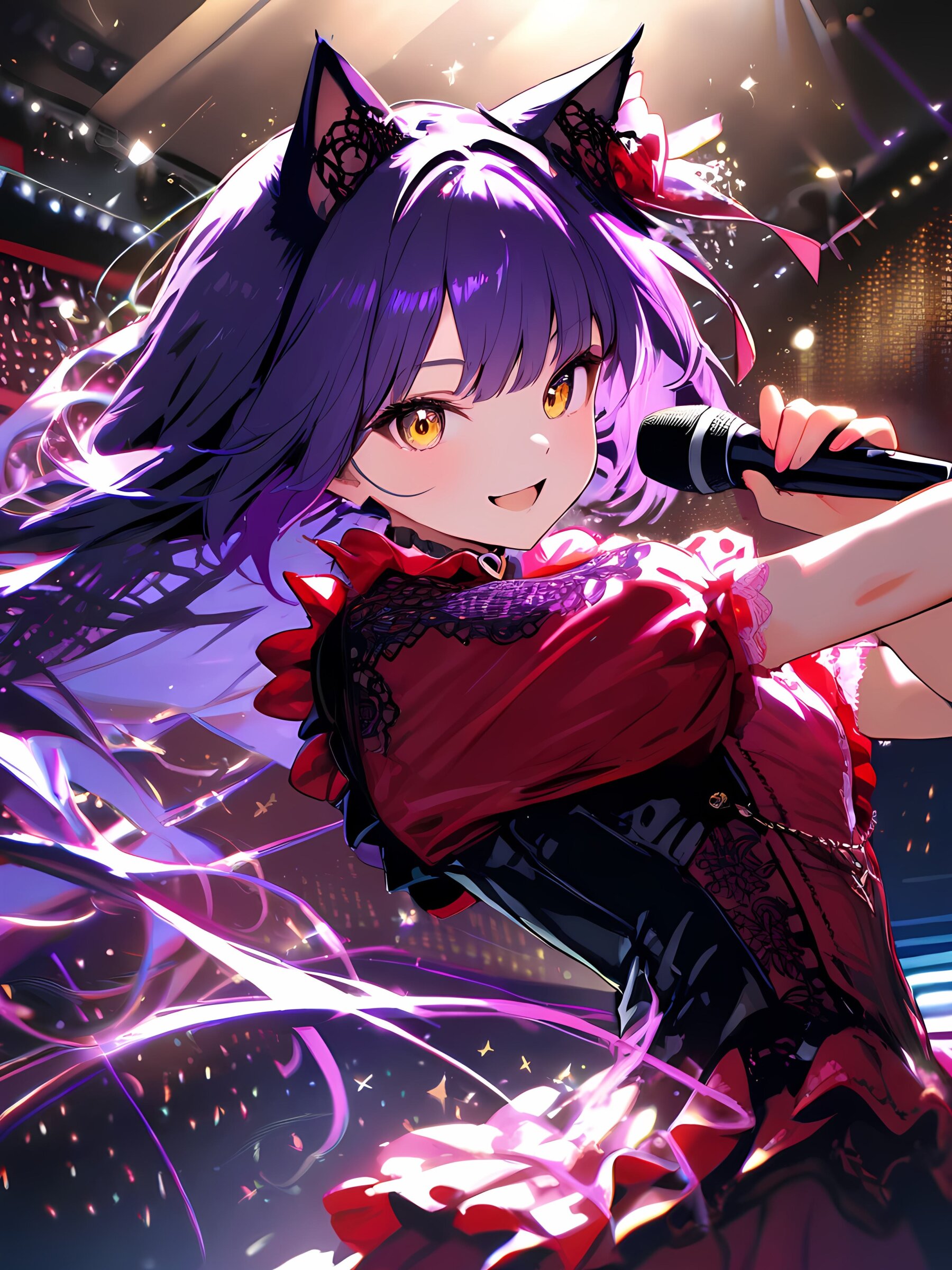 big gold eyes, loli face, gem eyes, beautiful eyes, gothic lolita, purple hair, long hair, cat ears, black and red dress, intricate lace patterns, velvet fabric, Live, stage, idol, holding mic, happy smile,