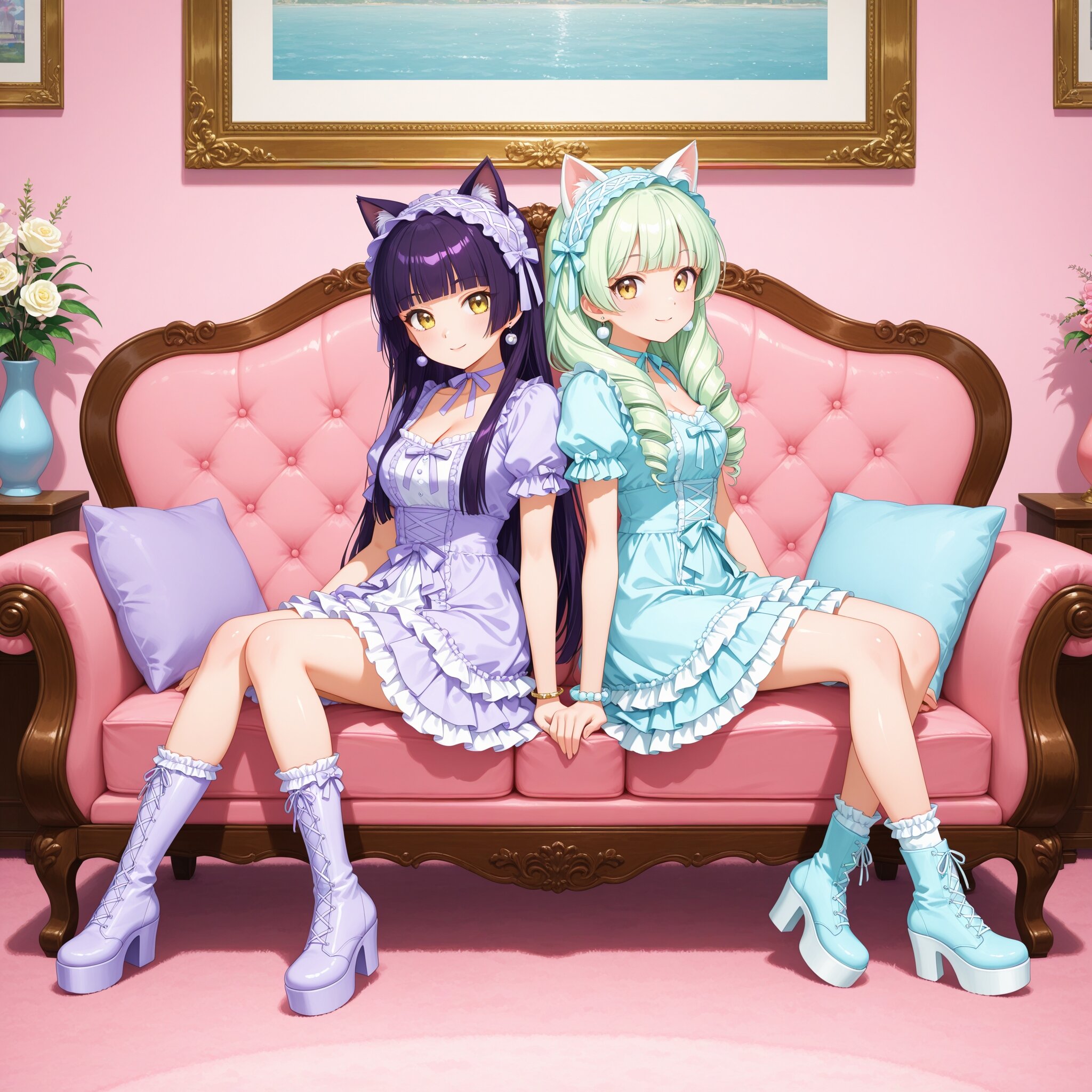 (anime-style illustration:1.5), (2girls:1.2), (Light green hair:1.2), (dark purple hair:1.2), (yellow eyes:1.2), (cat ears:1.2), laugh, enjoy, smile+happy (whitening), (long hair), (hime cut), (shiny hair), (drill hair), idol, cleavage, (Light blue pastel sweet Lolita:1.5), (purple pastel sweet Lolita:1.5), (hair band:1.2), (frilled dress), mini skirt, frilled socks, lace platform boots, choker, bracelet,