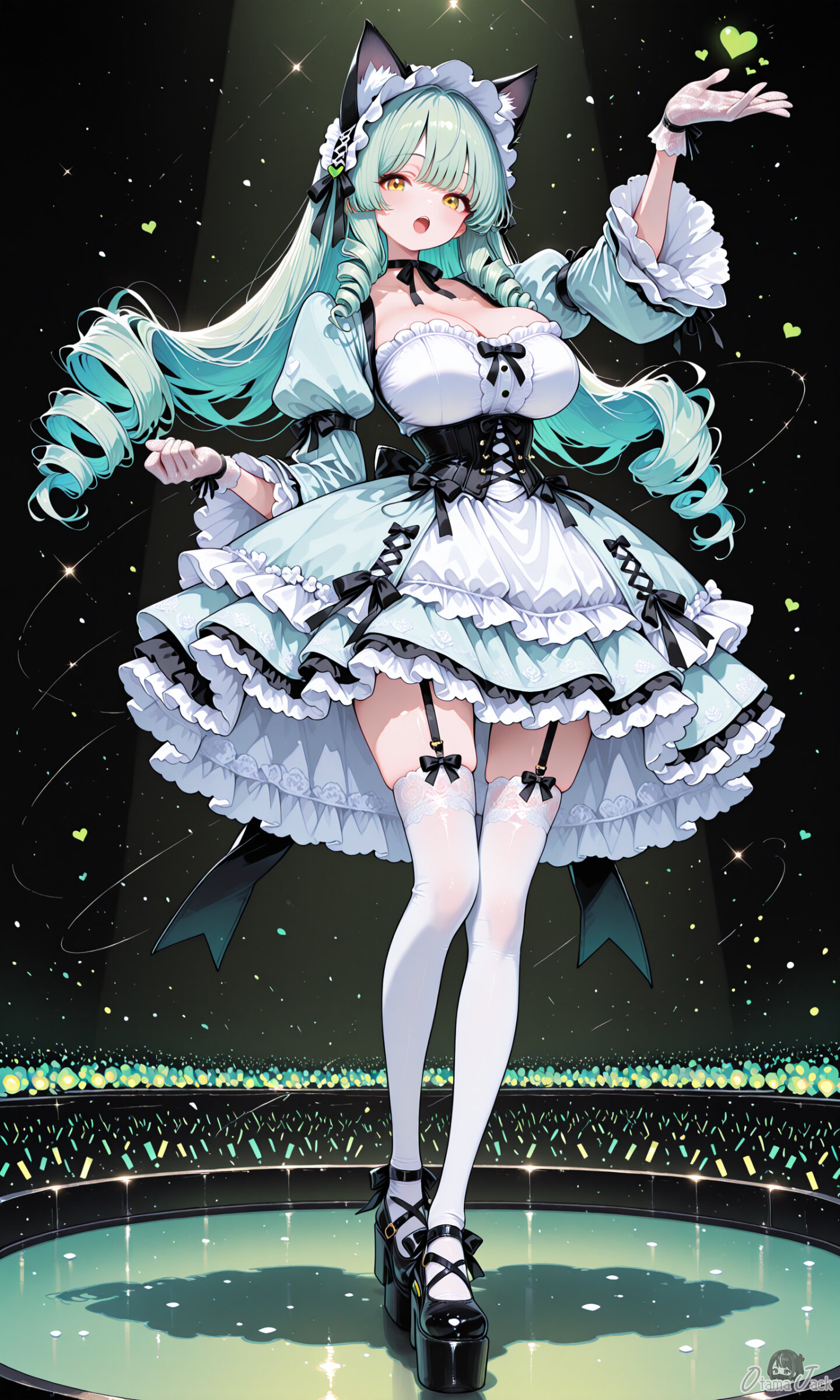 white gothic lolita,gothic lolita idol, gothic lolita fashion, frilly idol outfit, layered skirt, corset dress, puffed sleeves, lace trim, ribbon choker, thighhighs, lace gloves, platform shoes, heart-shaped accessories, stage performance, cute and elegant,white and green color scheme,gemstone accents,light blue Costumes,