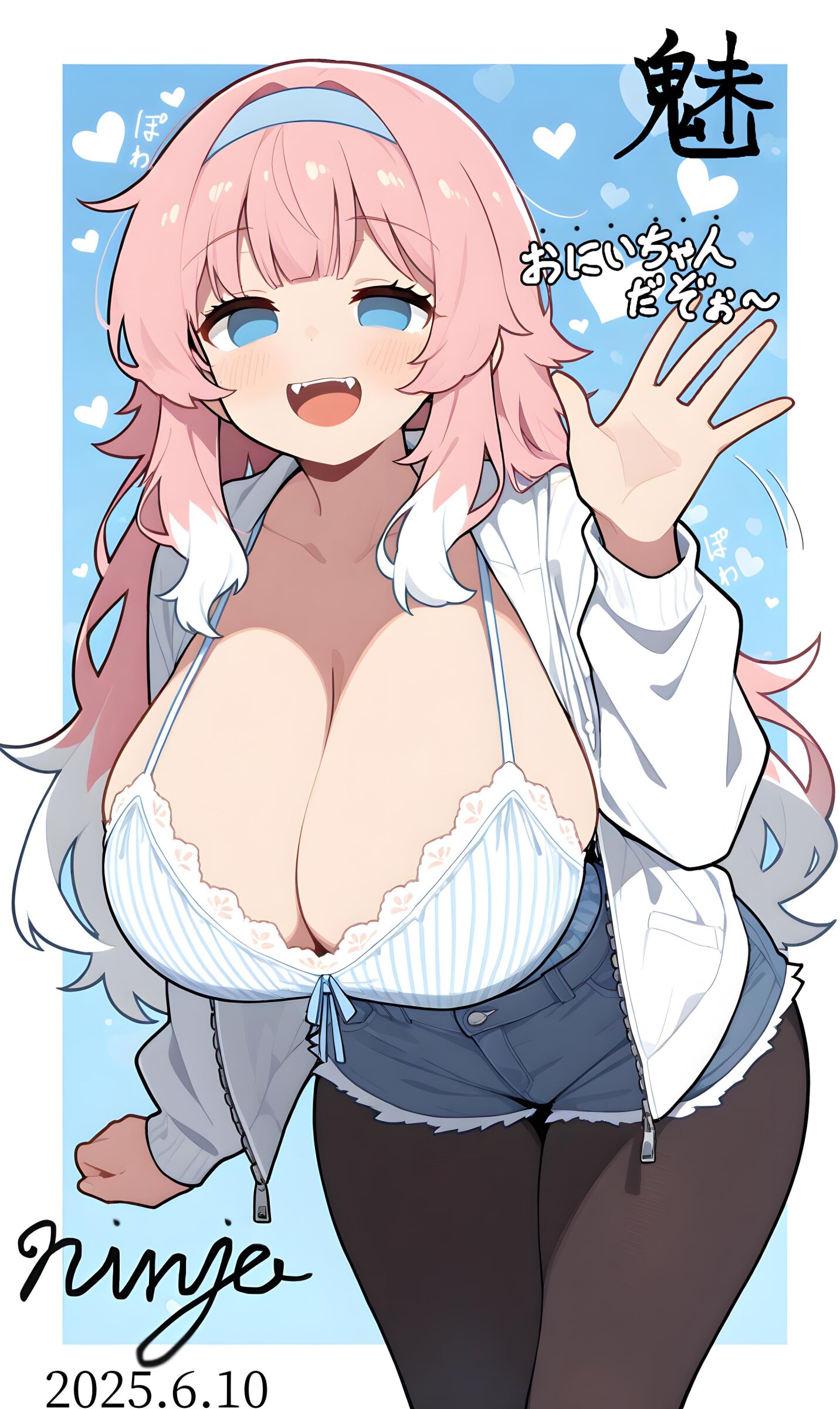 1girl,(huge breasts:1.1),slim,narrow waist,long legs,(wide hips:1.2),(thick thighs:1.1),pink hair,messy hair,long hair,multicolored hair,colored tips,(white tips:1.1),tareme,blue eyes,no pupils,sleepy eyes,smile,open mouth,blue hairband,layering,plain color,fangs,emphasizes deep breast cleavage,plunging neckline,white lace-trimmed white camisole,blue vertical striped camisole,impossible clothes,long sleeves,zipper,white jacket,open jacket,blue denim shorts,skin tight,standing,waving hand,leaning forward,motion lines,zoom layer,hair shade,from front,blue background,heart background,(stylized),(kawaii),2D,(cute),masterpiece,simple,gddw,((correct_anatomy)),black pantyhose,flat color