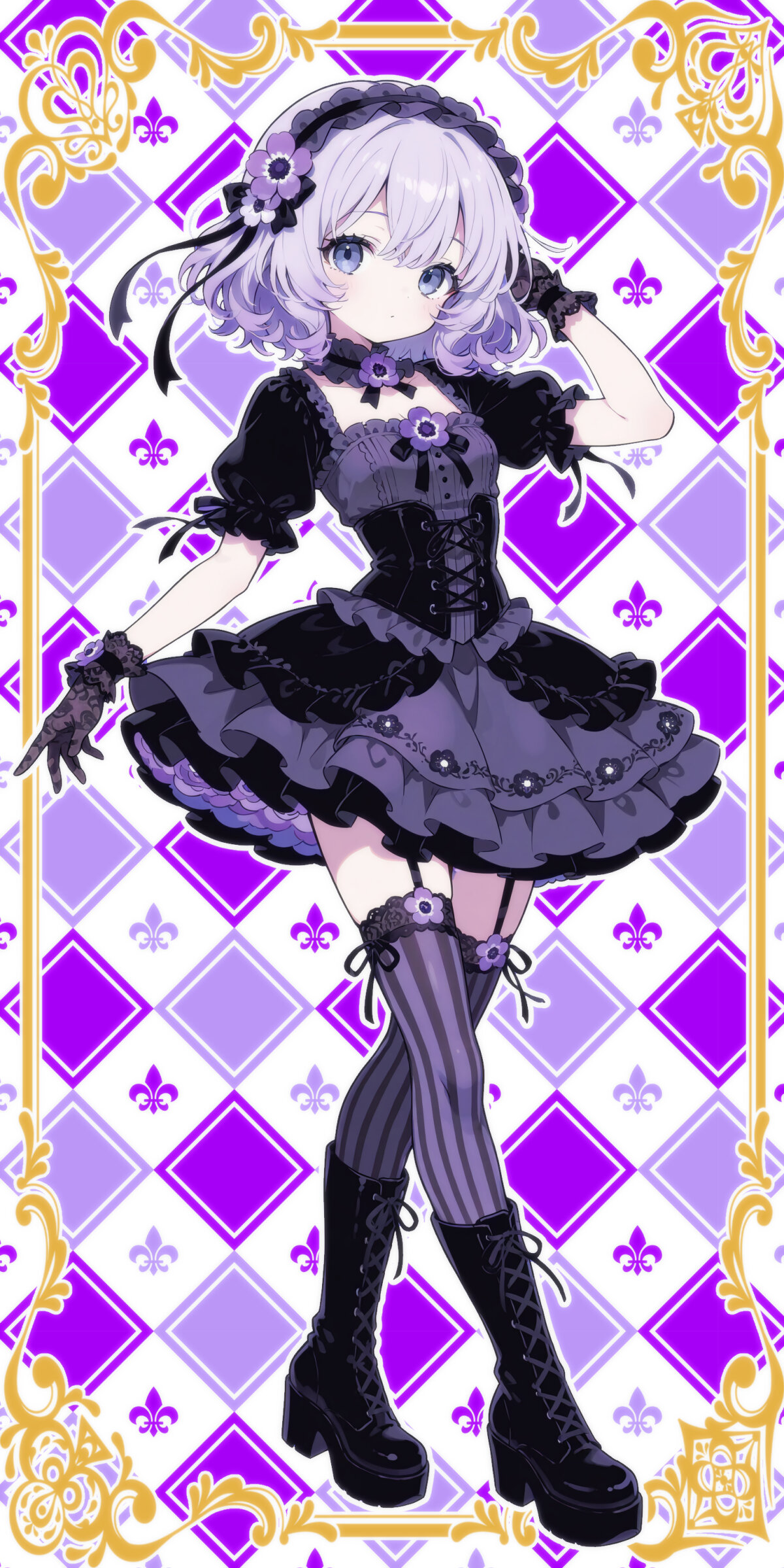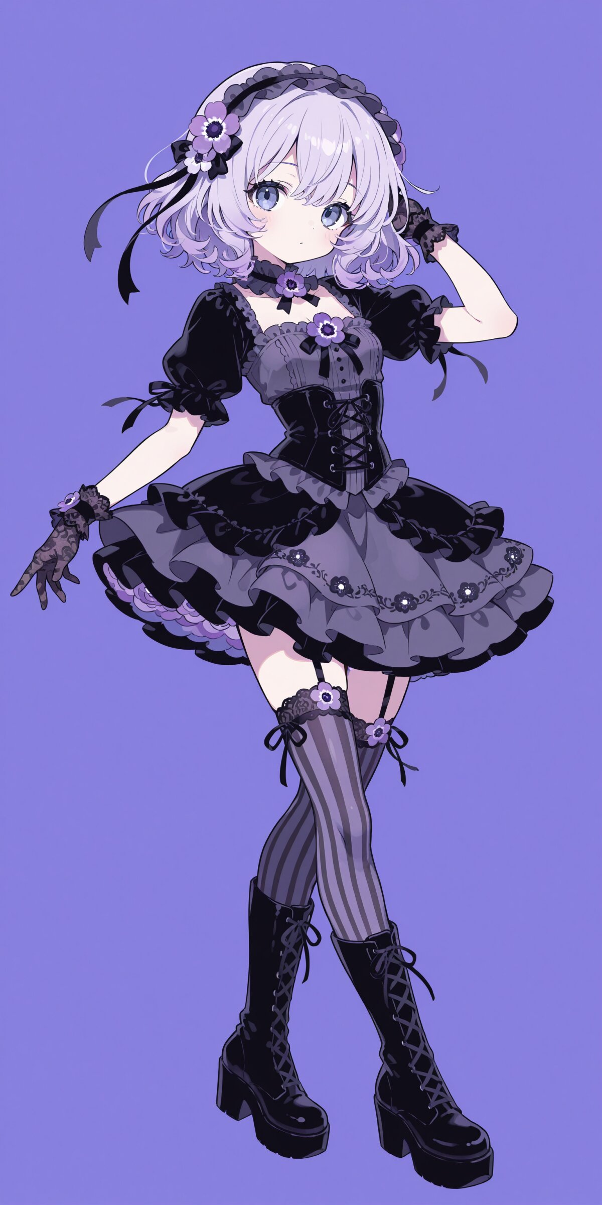 full body, dancing, gothic lolita dress with (anemone flower motif), black and deep violet two block color scheme, (deep violet anemone embroidery on bodice and skirt), black and deep violet two block color blouse, short puff sleeves, square neckline, frill collar and black ribbon bow, black blouse with short puff sleeves with lace cuffs, bare arms, fitted corset-shaped waist with lace-up, voluminous multi-layered skirt, (layered skirt-hem) with deep violet and black lace, wide A-line silhouette, black and violet striped thigh-high stockings, striped stockings, black lace gloves, (black headband with purple anemone flower accessory), black platform boots with lace-up, simple background,