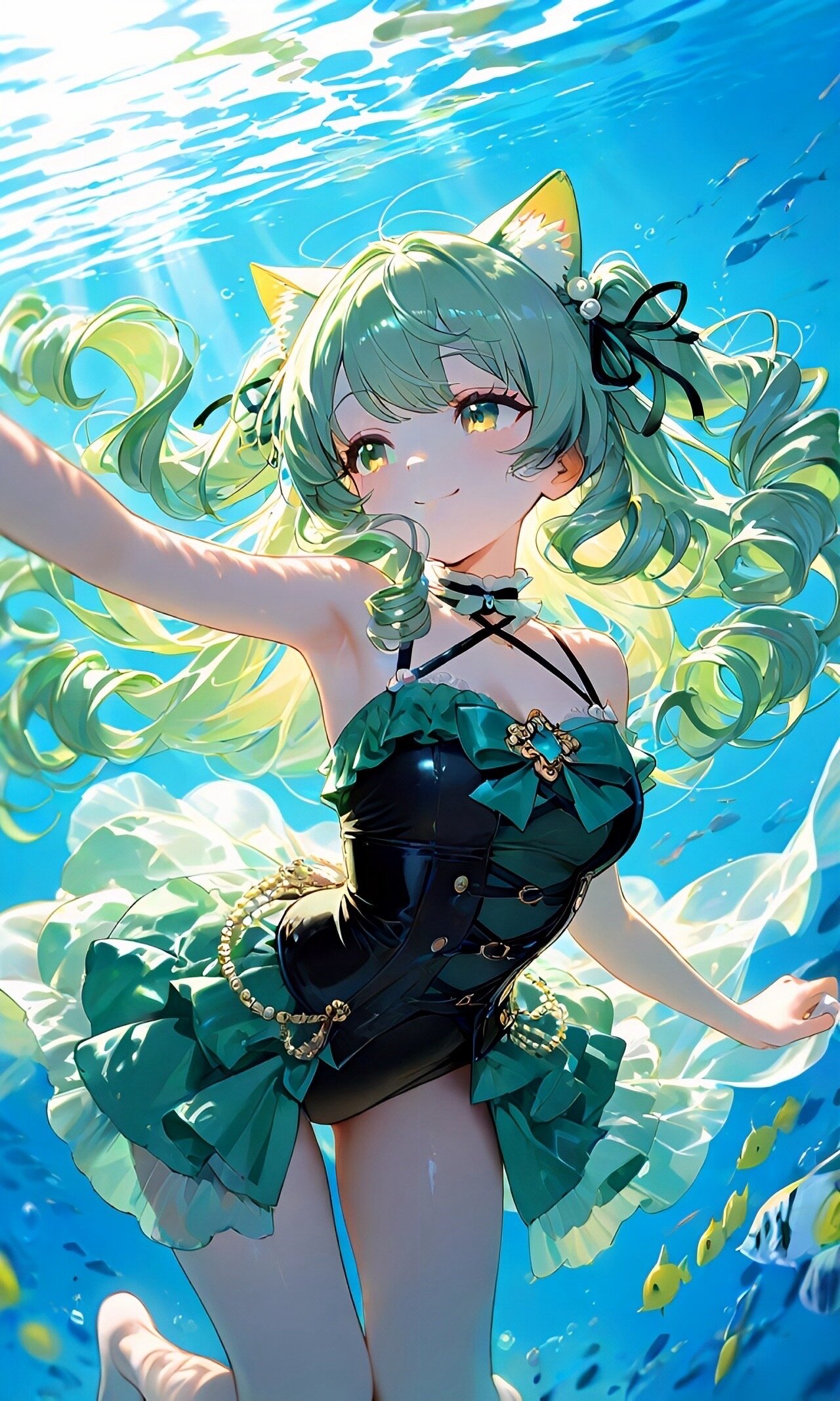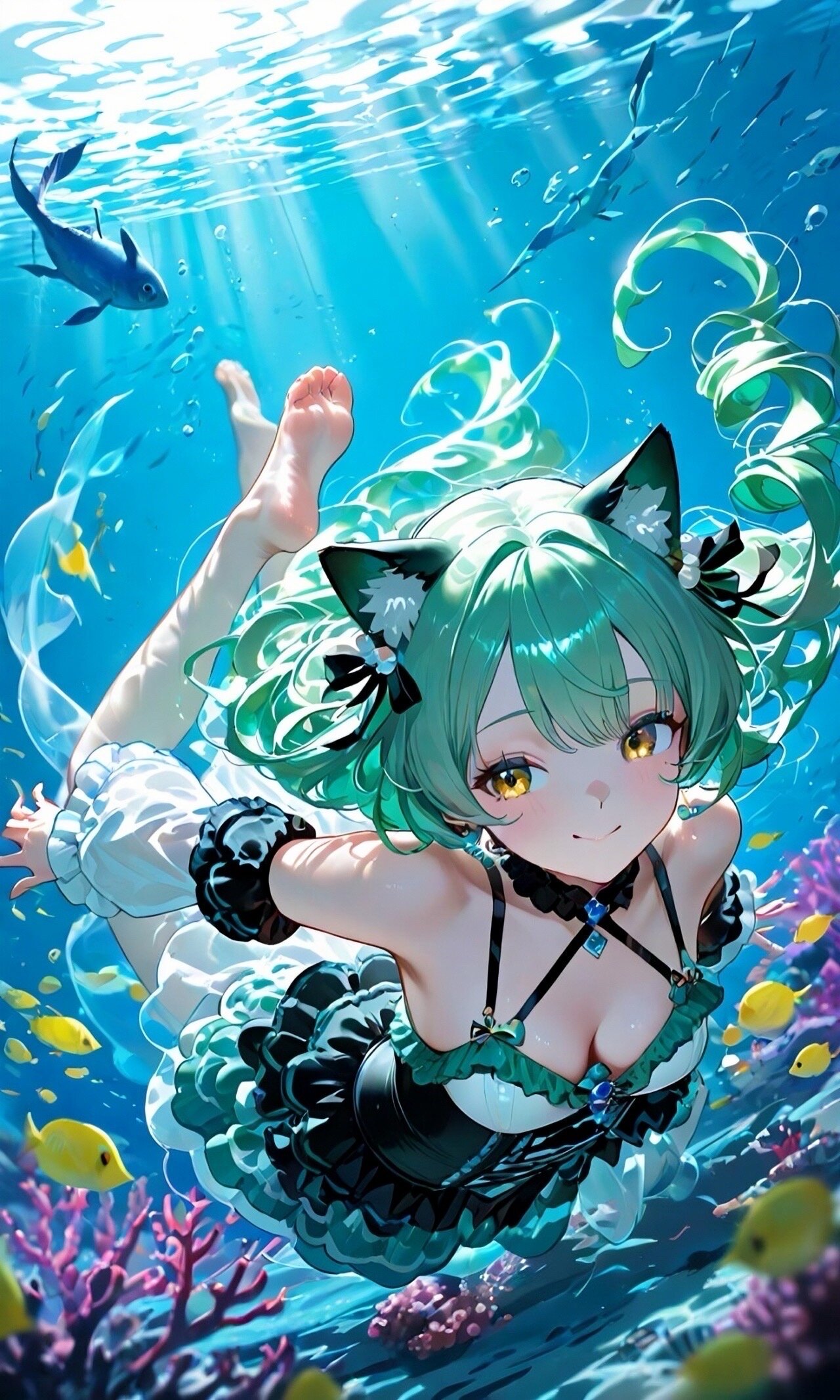 (masterpiece:1.1), best quality, ultra_detail, (sunlight:1.1), kawaii, big beautiful eyes, detailed irises, glossy shine, vivid color, a pale green-haired girl, long soft drill curls, green cat ears, golden eyes, bare foot, in a sparkling tropical sea, (Floating in the air with legs bent:1.2), joyfully interacting with a group of colorful tropical fish, (Character Description:1.3), large gentle downward-slanting eyes, droopy eyes, looking toward the fish near her hands, filled with fascination and warmth, closed mouth, playful smile, looking away, looking at fish, arms outstretched gently, reaching toward a swimming fish, wearing a gothic lolita-inspired swimsuit, elegant black base, white ruffled lace, emerald green ribbons, translucent fabric, mint green accents, black corset lacing, (Outfit Description:1.2), small yellow and blue fish swim in spirals, brushing past her fingers and hair, sunlight filters through the water surface above, bursting into radiant beams, shimmering glitter dancing across her body and the coral-covered seafloor, (Light and Atmosphere:1.4), the whole scene feels magical, peaceful, full of gentle life, (Style Impression: dreamy, underwater elegance, intimate interaction with nature)