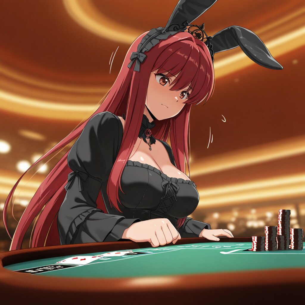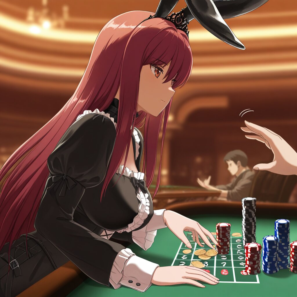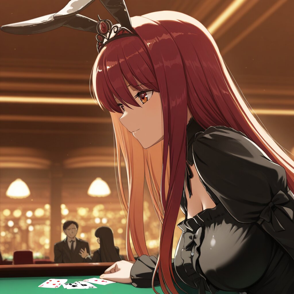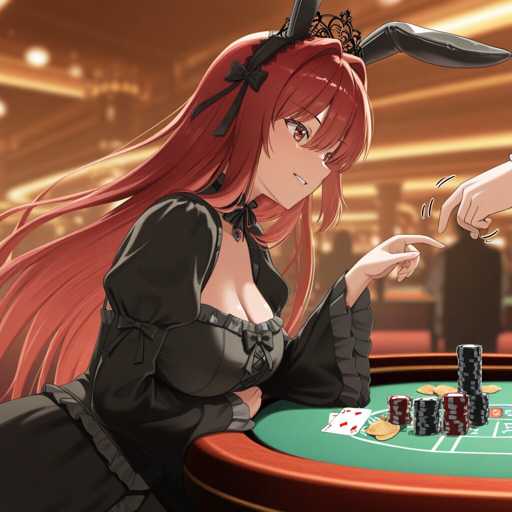 masterpiece, best quality, amazing quality, very aesthetic, high resolution, ultra-detailed, absurdres, newest, scenery, depth of field, volumetric lighting, okashirastyle,8k,extremely detailed CG unity 8k wallpaper,(perfect face:1.2),1lady,27yo,long_hair,brown_hair,red_eyes,hair_between_eyes,very_long_hair,brown_eyes,red_hair,floating_hair,hair_intakes,straight_hair,shiny_skin,medium_breasts,(gothic lolita:1.2), (goth fashion:1.5), bunny ears prank, head, black tiara, magic black staff held by left hand, from side, from below,motion lines,playing card, casino card table, roulette table, worn leather, dimly lit, red felt, scattered chips, blurred background, male, 30s, tired eyes, slight smirk, upright posture, shallow depth of field, 35mm lens, side lighting