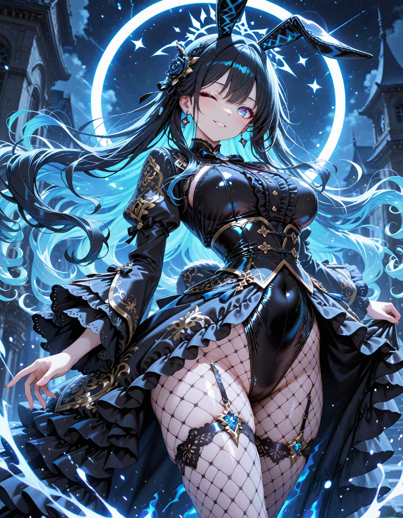 masterpiece,best quality,very aesthetic,absurdres,newest,(anime style:2),ultra-detailed,8k,safe, 1girl,large breasts,(solo:2),beautiful face,outdoors,one eye closed,smile, gothic lolita,frilly black dress,lace trim,detailed gothic outfit,long curly hair,pale skin,elegant,victorian style,intricate design,(playboy bunny:1.2),(cleavage:-2),fishnet tights, multicolored theme (color),glowing,glowing particles, iridescent aesthetic,ethereal glow,holographic shimmer,celestial radiance,pearlescent reflection,dynamic pose, <lora:Smooth_Booster_v3:0.2>,<lora:DynamicPoseIL2att_alpha1.0_rank4_noxattn_900steps:0.8>, <lora:V2_yakumo_alchemy:0.5>, <lora:Ethereal_Aesthetic_illustrious:0.2>,