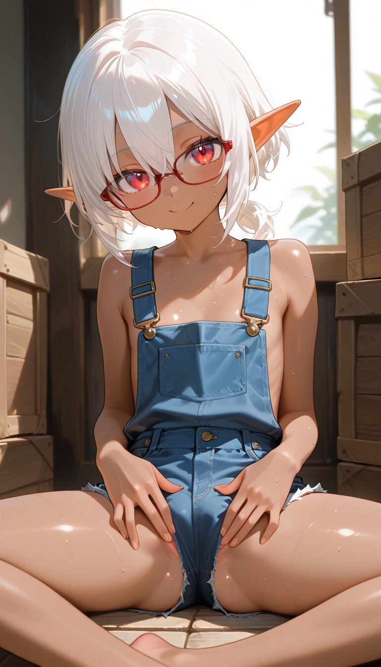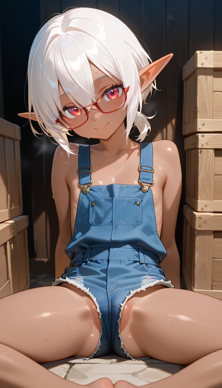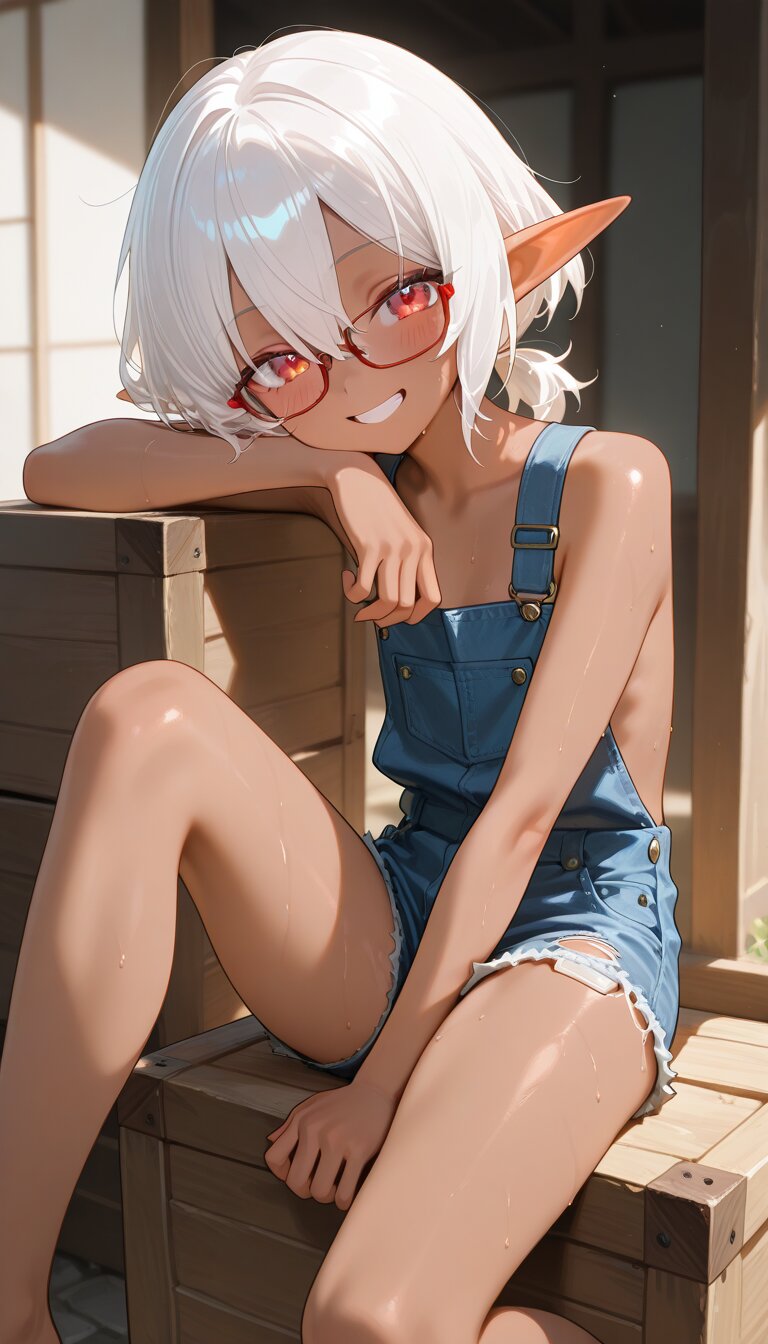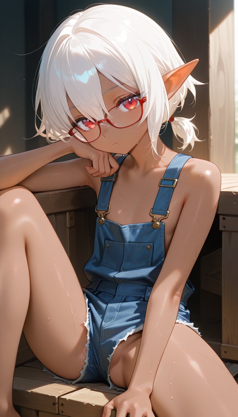 1girl, sensitive, (beautiful eyes, detailed eyes), looking at viewer, solo, cute, sitting, cowboy shot, (dark skin, red-framed eyewear:1.2), white hair, low ponytail, short hair, hair between eyes, flat chest, red eyes, elf, overall shorts, denim short shorts, torn jeans, wooden box, spread legs, one knee up, head rest, holding knee, expressionless, no underwear, sweat, masterpiece, best quality, amazing quality,